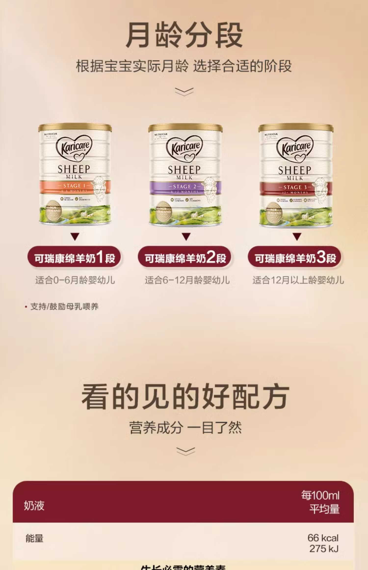 【跨境】karicare可瑞康新西兰进口幼儿配方绵羊奶粉1段(0-6个月)900g