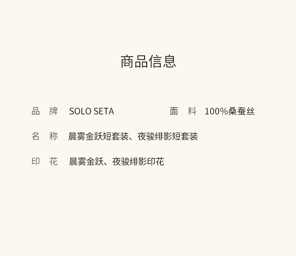 - soloseta专注于真丝织物,灵感源自意大利语,中文含义为“只做真丝”的意思。让睡衣变时尚,居家和外出瞬间切换,使其更具有出街,度假,参加宴会等功能。