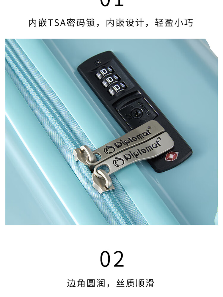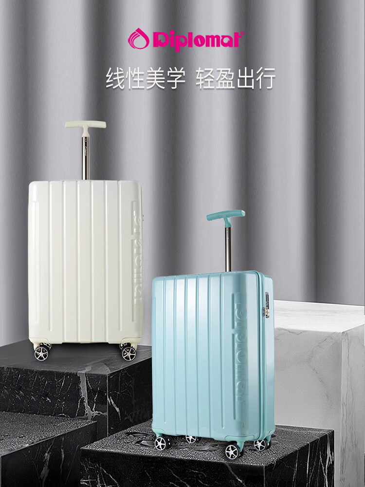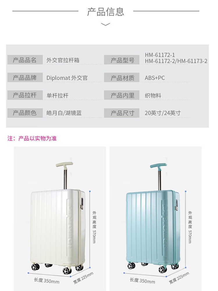 Diplomat外交官休闲商务万向轮拉杆箱HM-61172皓月白-20英寸/湖镜蓝-20英寸/HM-61173湖镜蓝-24英寸