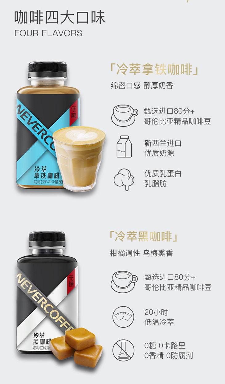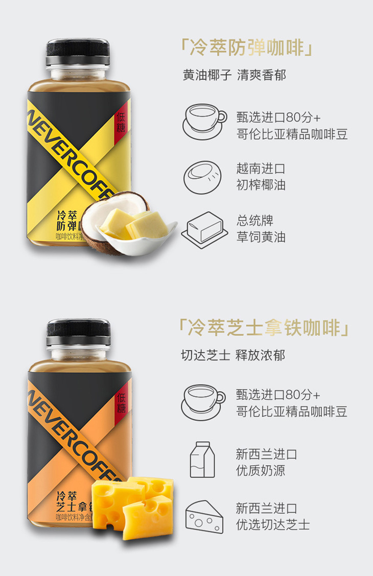【周周精选】两瓶23.7元 NeverCoffee 冰酿黑咖/冰酿拿铁 /冷萃防弹/芝士拿铁
