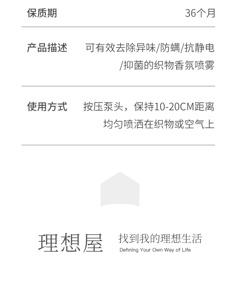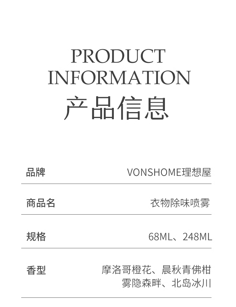 【理想屋】vonshome衣物香氛喷雾织物除味护衣去味防静电衣服淡香水持久留香