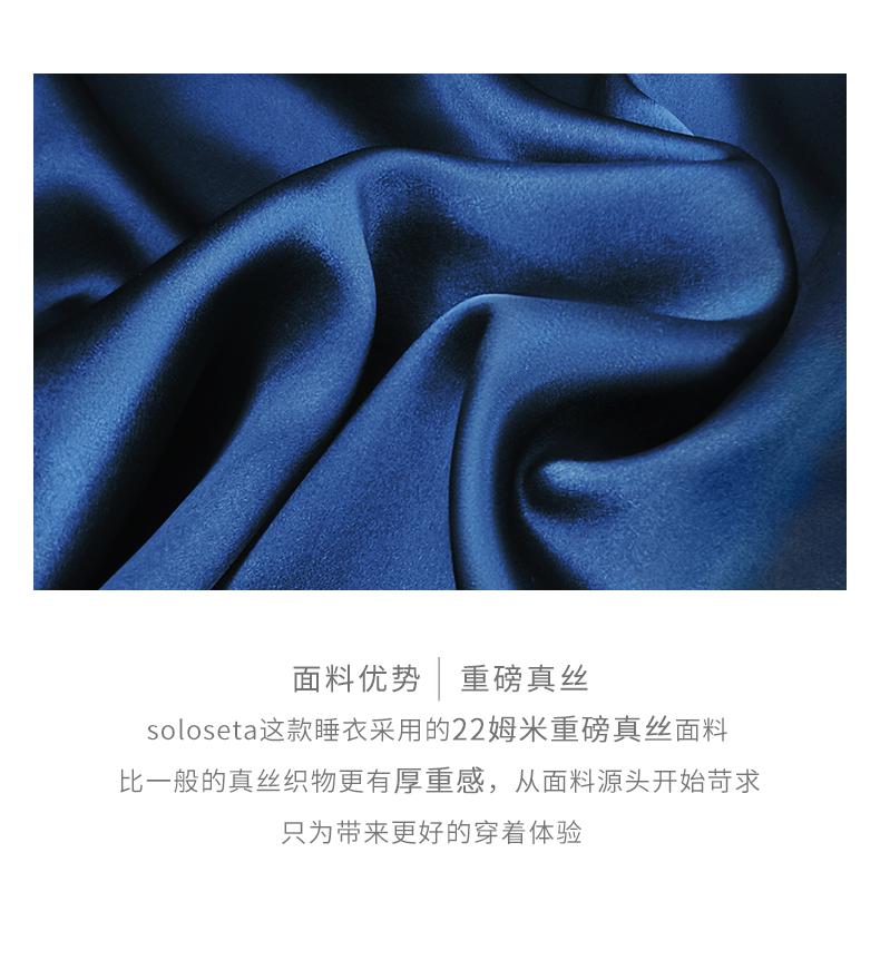 - soloseta专注于真丝织物,灵感源自意大利语,中文含义为“只做真丝”的意思。让睡衣变时尚,居家和外出瞬间切换,使其更具有出街,度假,参加宴会等功能。