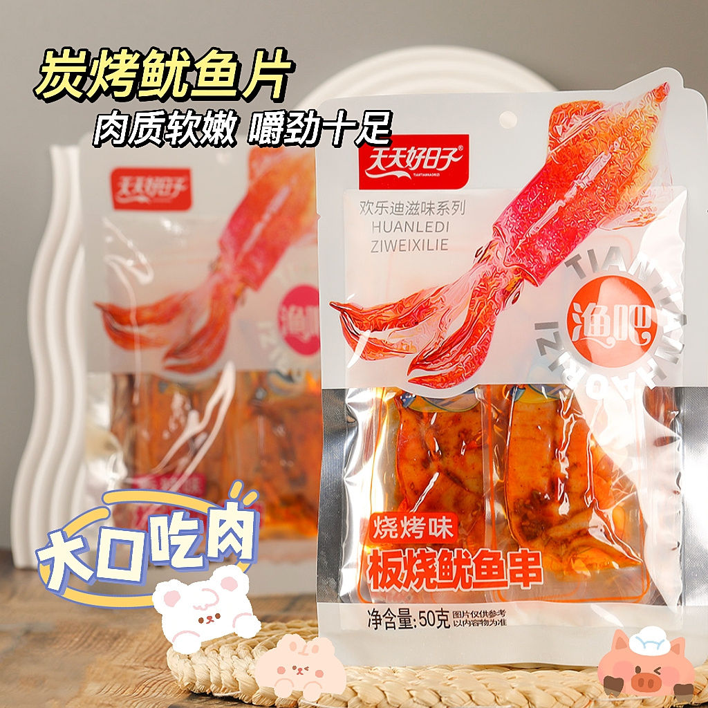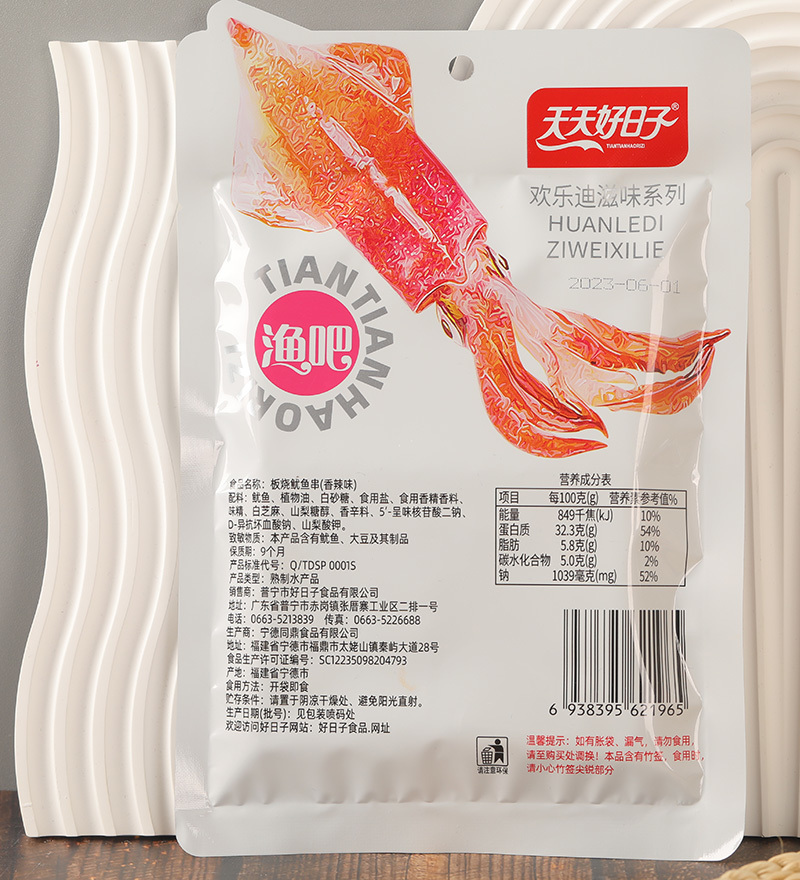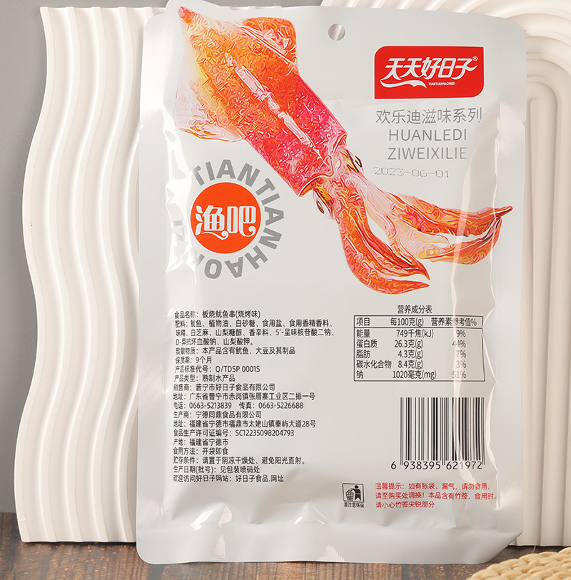 食品名称:碳烤鱿鱼串(烧烤味/香辣味) 净含量:50g/袋 配料:鱿鱼、植物油、白砂糖、食用盐、食用香精香料、味精、白砂糖、山梨糖醇、香辛料、5‘-呈味核苷酸二钠、D-异抗坏血酸钠、山梨酸钾。 致敏物质:本产品含有鱿鱼、大豆及其制品 保质期:9个月 产品标准代号:Q/TDSP 0001S 产品类型:熟制水产品 食品生产许可证编号SC12235098204793 食用方法:开袋即食 贮存条件:请置于阴凉干燥处、避免阳光直射。 发货地:广东揭阳 发货快递:中通、极兔随机不指定 发货时效:交单内48小时发货,节假日顺延 周六日是否发货:正常发货 每日截单时间:每天下午4点 拦截:零食单有撤单/中途拦截/拒收,有物流的需扣除运费3元哦,因为已经产生运费的了 不包邮地区及运费:港澳台、新疆、西藏、以及疫情区域 【禁忌人群】:儿童请在成人监护下食用,孕妇老人等特殊群体请在医生指导意见下食用。 【售后标准】 1、收到后如有质量问题24小时之内带面单+产品照片联系客服进行赔付或者补发 2、产品一旦发出后拒绝任何形式拒签,收到产品后当场验货,如出现问题,请及时拍照并与我们联系,我们会第一时间处理 3、客户留地址 电话等信息导致货物不能正常送达均不在售后范围内 4、产品已经发出的情况下,不可更改地址、不退货,下单前,一定要留对信息!!订单提交订单后不允许改地址!!!不能退款! 发货和上传运单有24-48小时时差,没有运单/单号无物流 不代表没有发货。 5、下单前请仔细核对信息,下单后不接受备注!!! 不支持7天无理由退货,杜绝拒收,不支持改地址,下单前核对好地址。产品问题,签收起24小时反馈解决,超时不负责