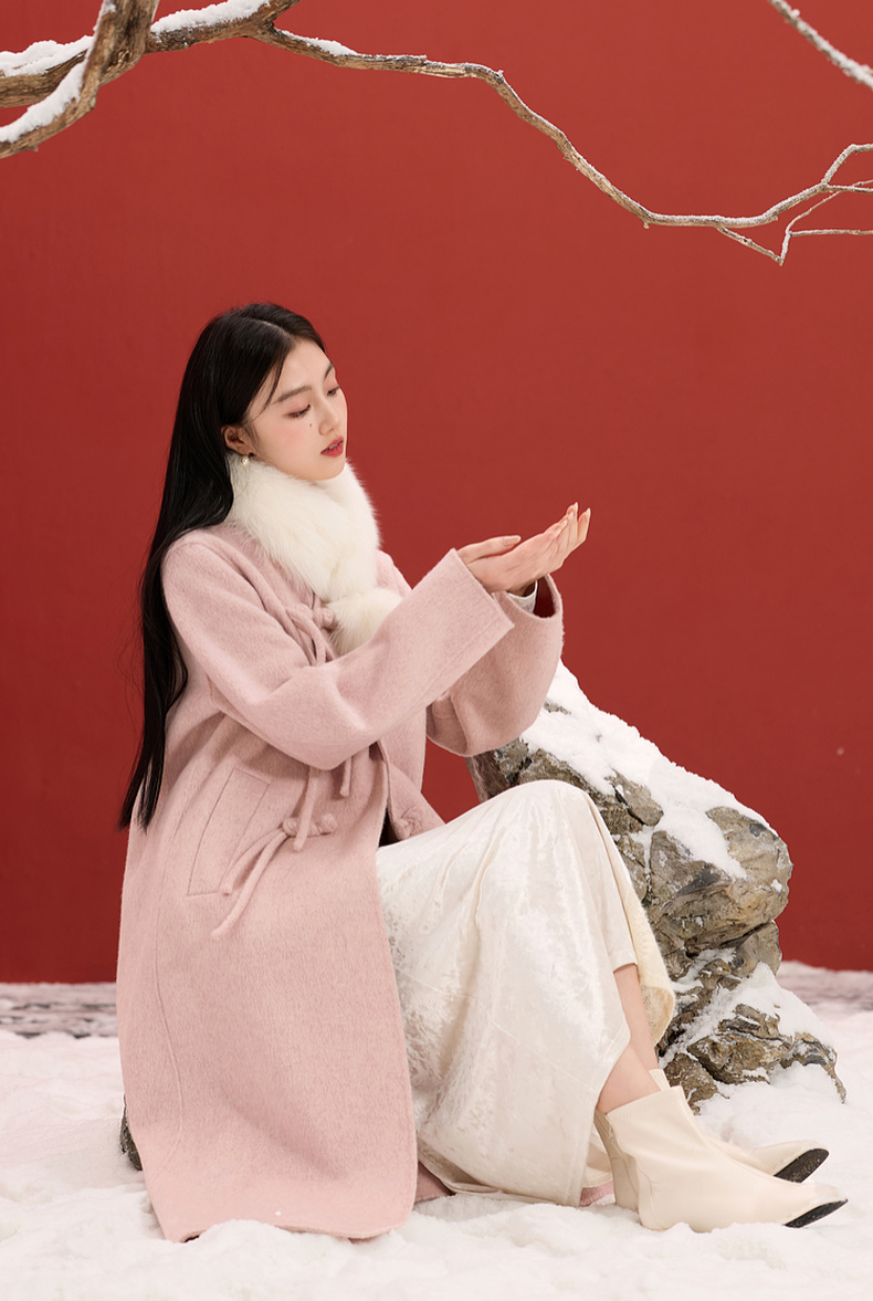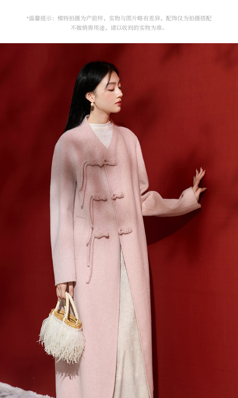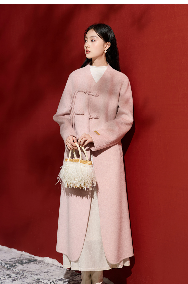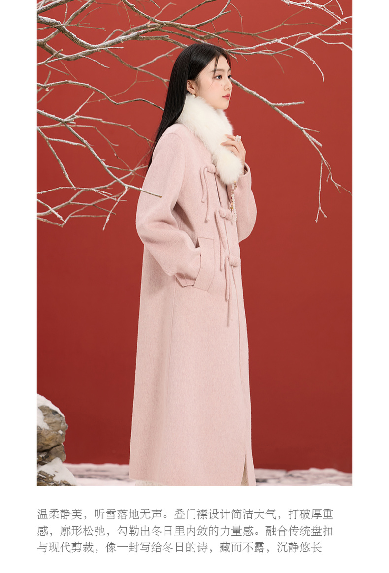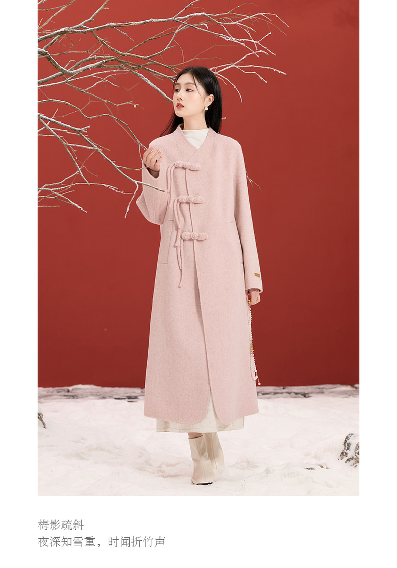 三彩【梅影疏斜】2025冬季新款绵羊毛盘扣双面呢大衣宽松长款C