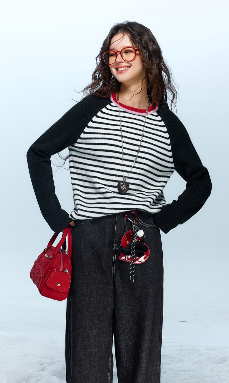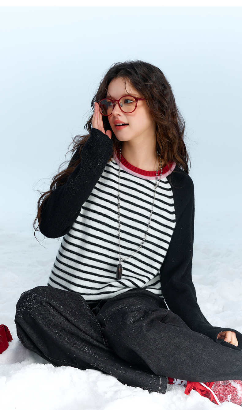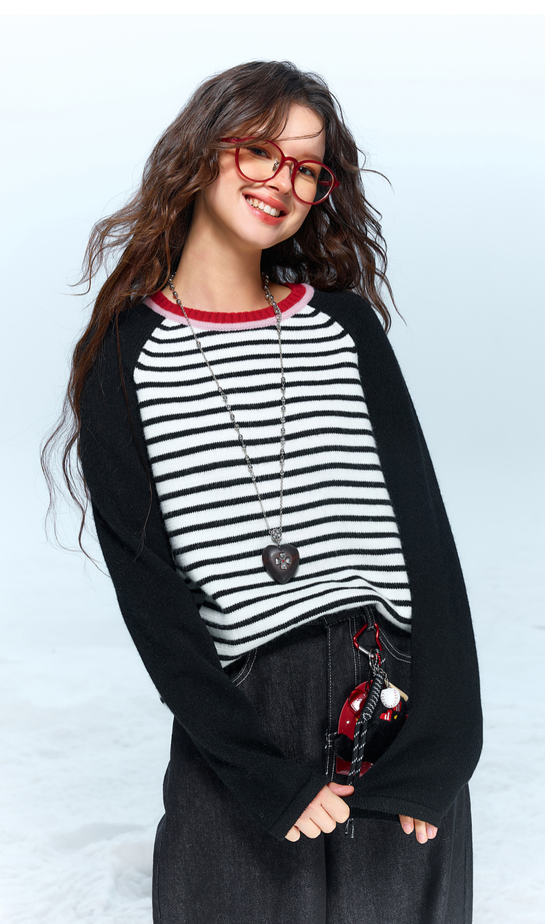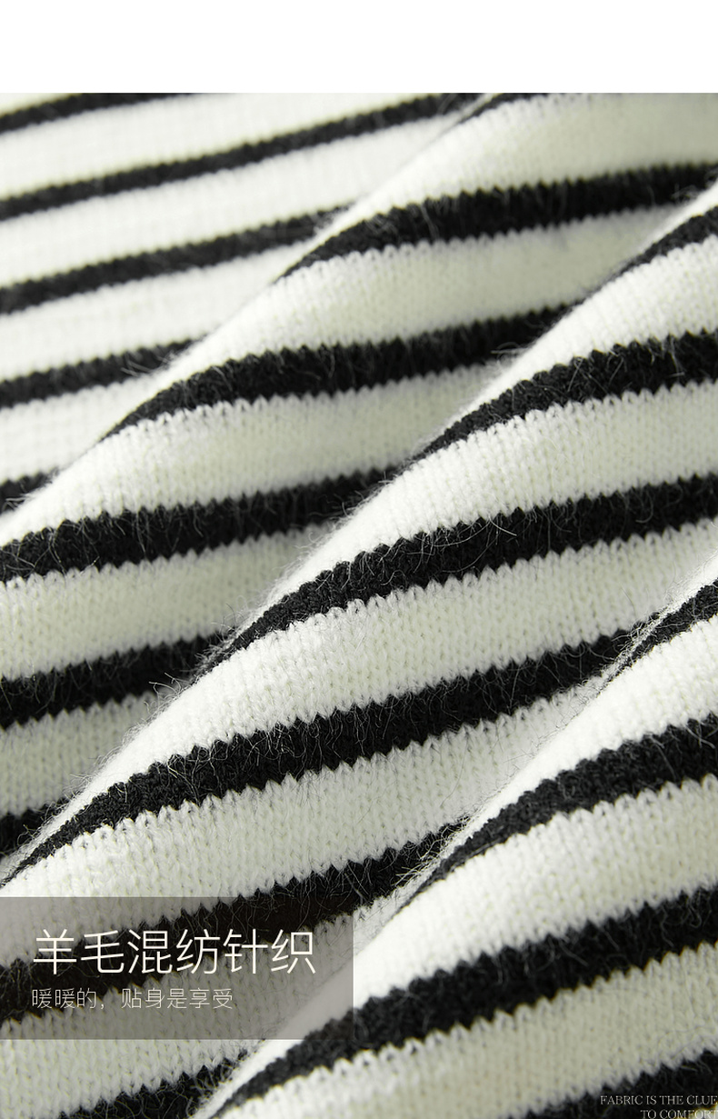 三彩2025冬季新款慵懒宽松圆领条纹针织衫插肩袖套头衫显瘦M
