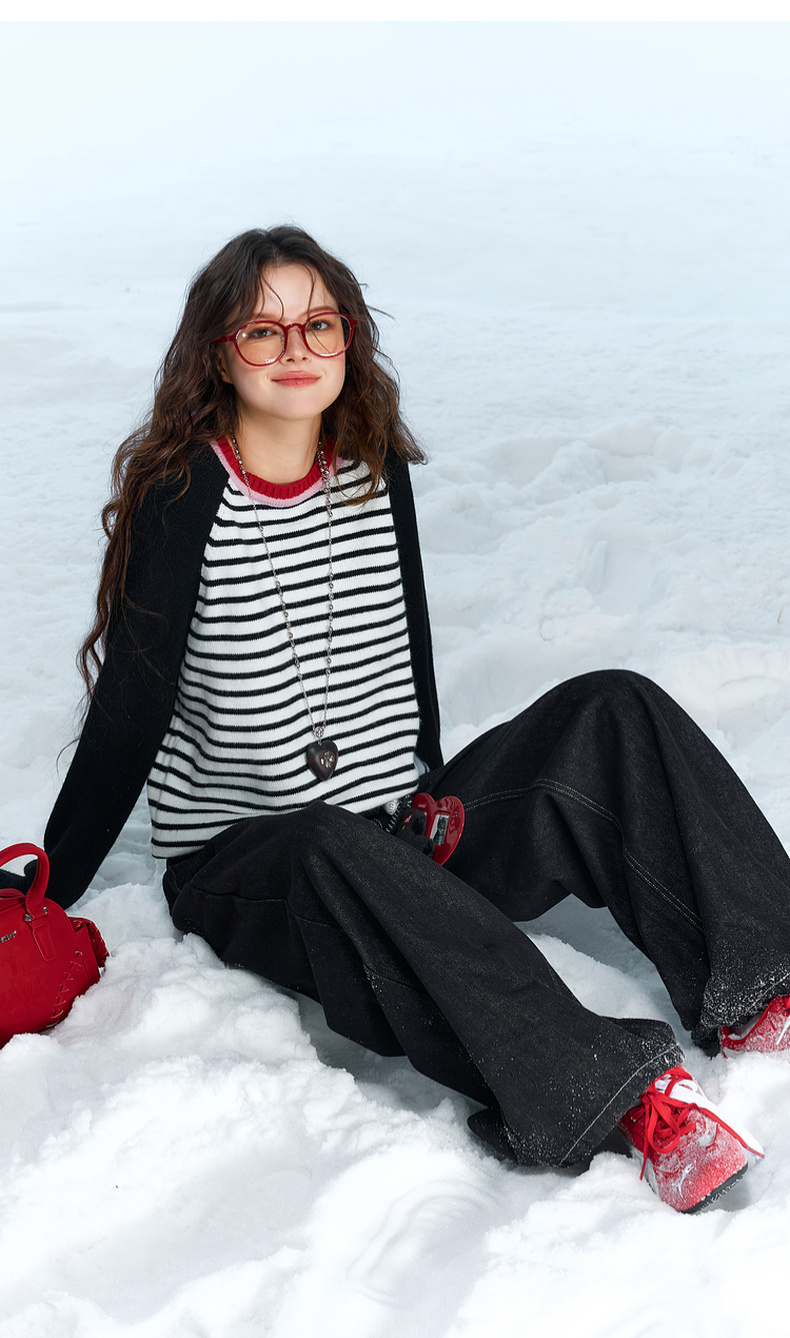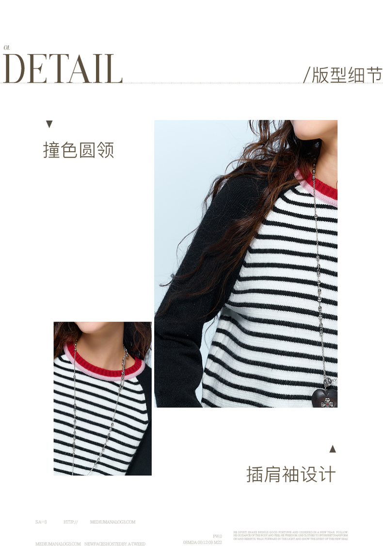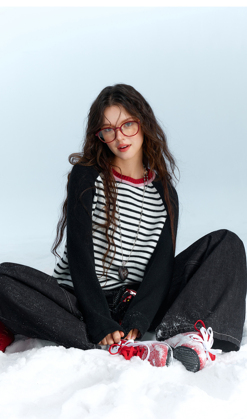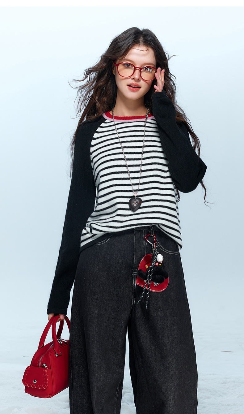 三彩2025冬季新款慵懒宽松圆领条纹针织衫插肩袖套头衫显瘦M