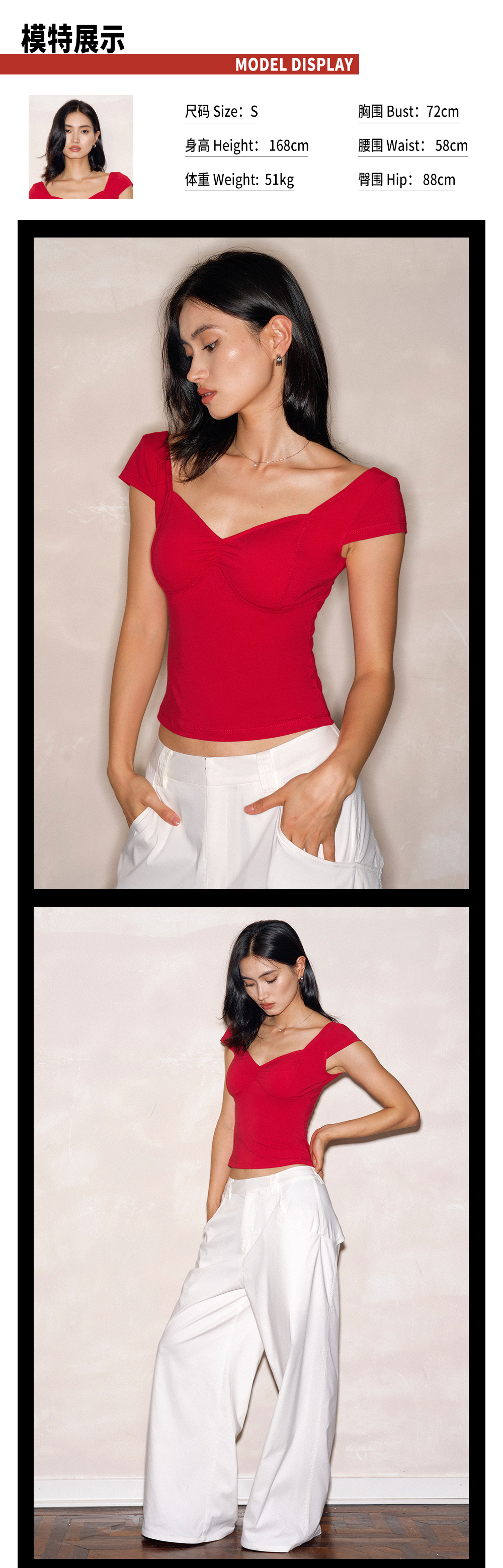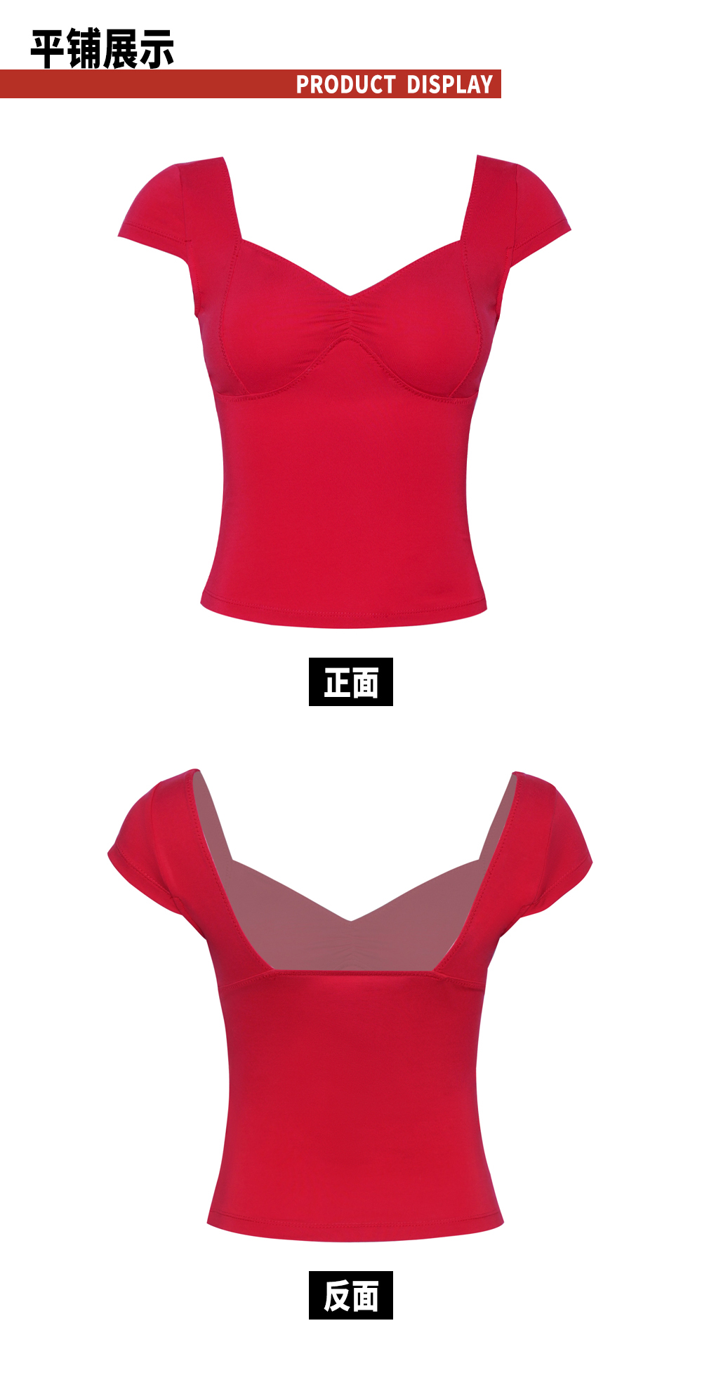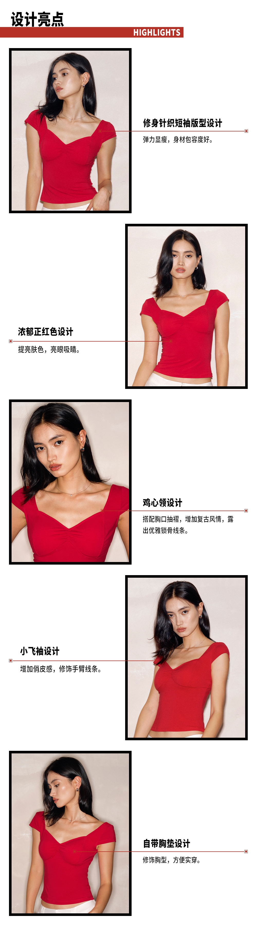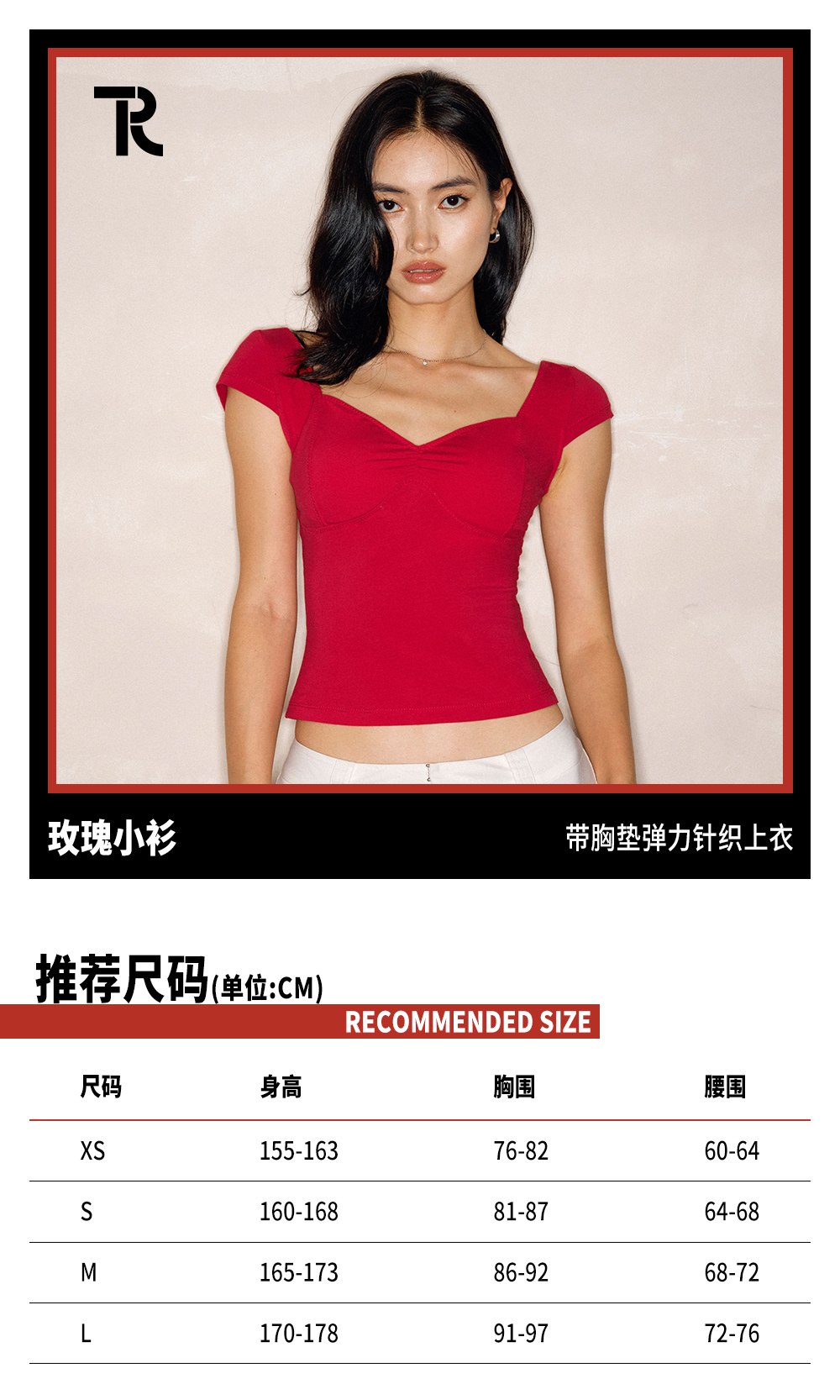 TR她热 玫瑰小衫 红色弹力防晒带胸垫复古鸡心领T恤短袖上衣