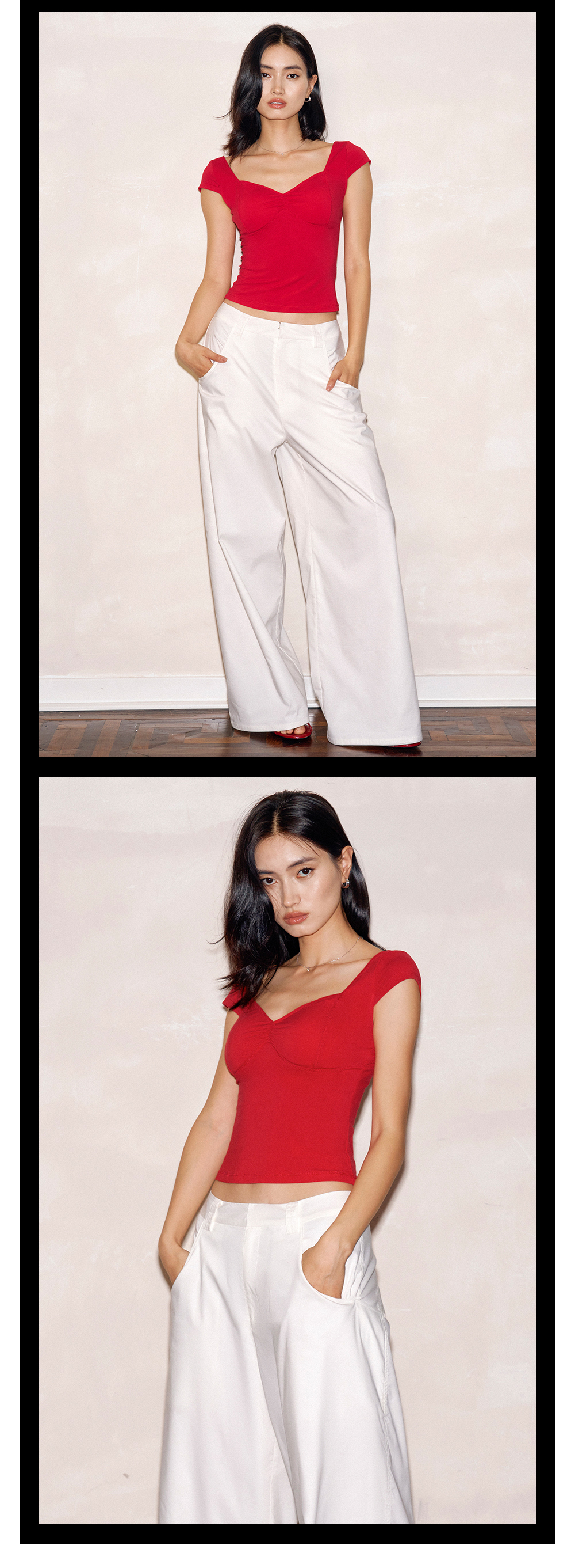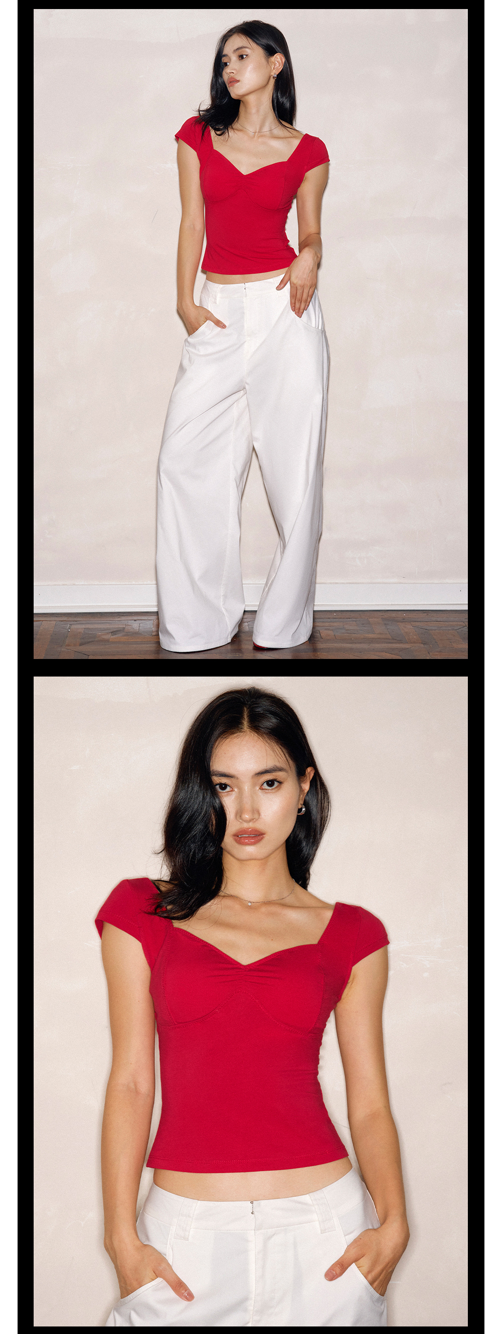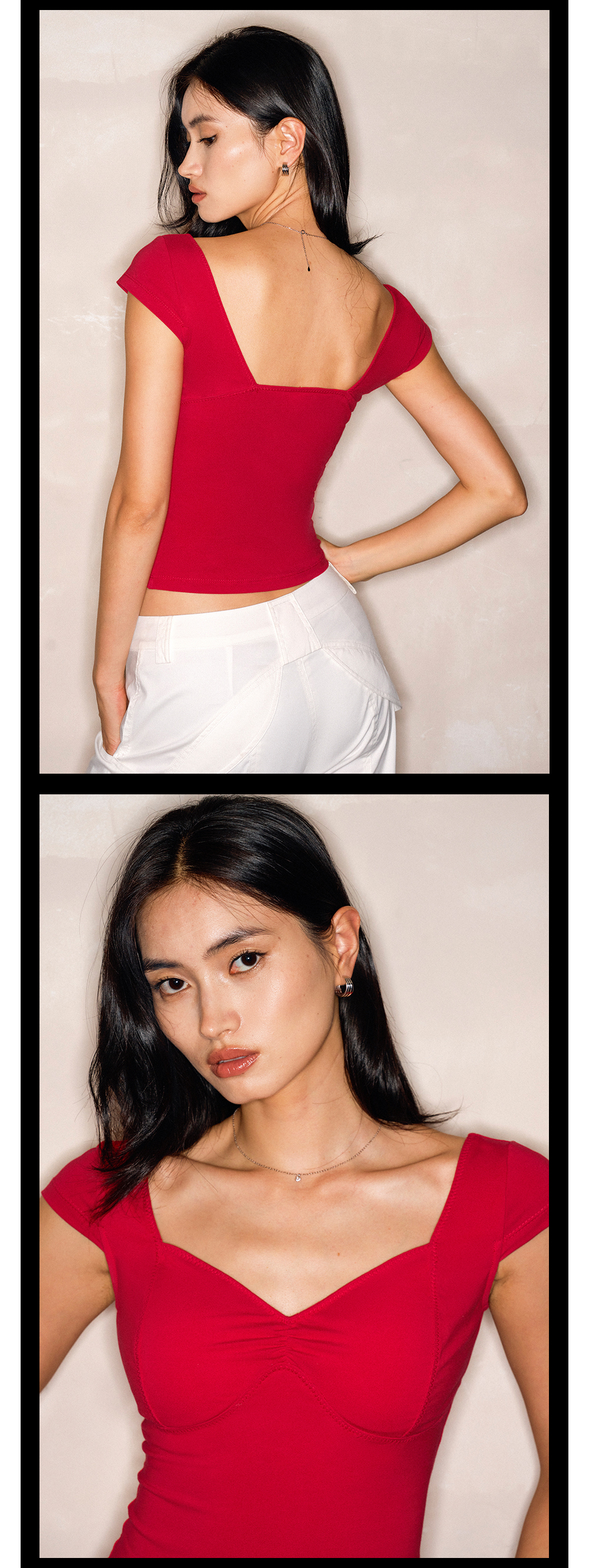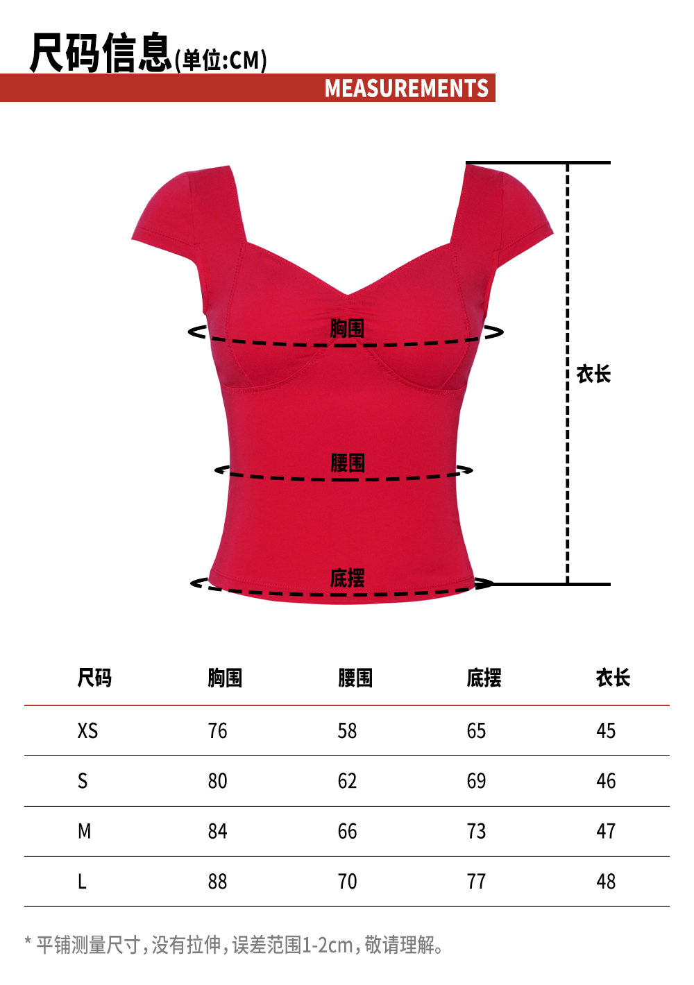 TR她热 玫瑰小衫 红色弹力防晒带胸垫复古鸡心领T恤短袖上衣