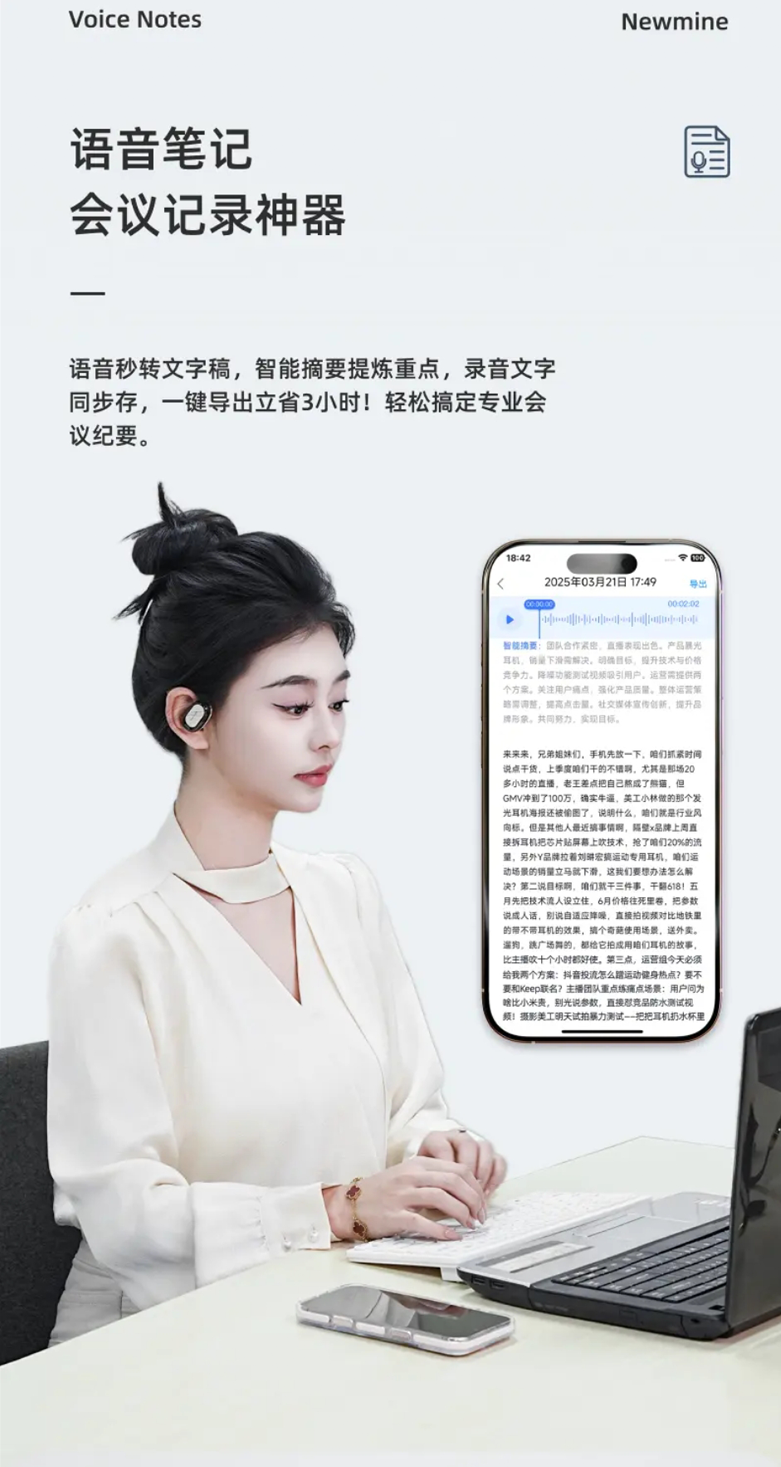 纽曼Newmine智能Ai蓝牙耳机 ,AI全能王,一听就懂