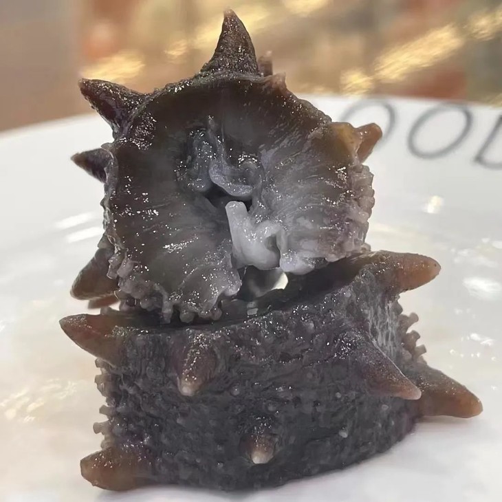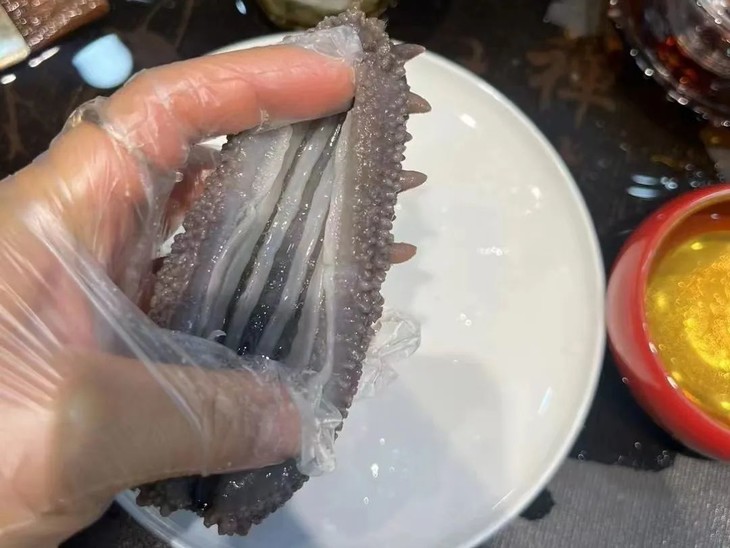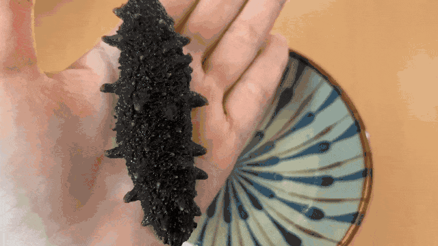 切开可以看见参纹路细腻,肉筋白皙干净,参壁厚实饱满,劲道爽口,参刺粗壮呈倒三角,肉质浑厚口感爽弹滑嫩。