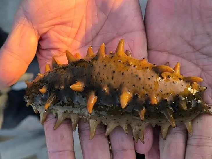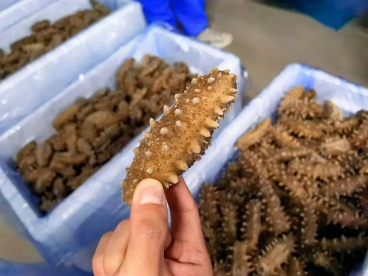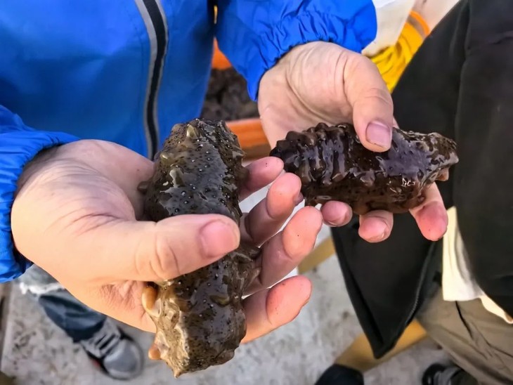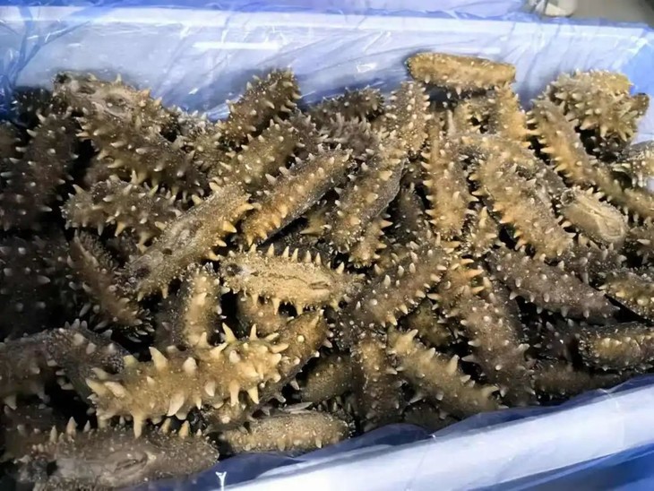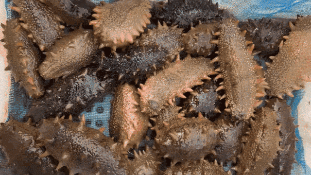 刚打捞上来的海参非常漂亮,身上闪闪发光,肉多肥美。
