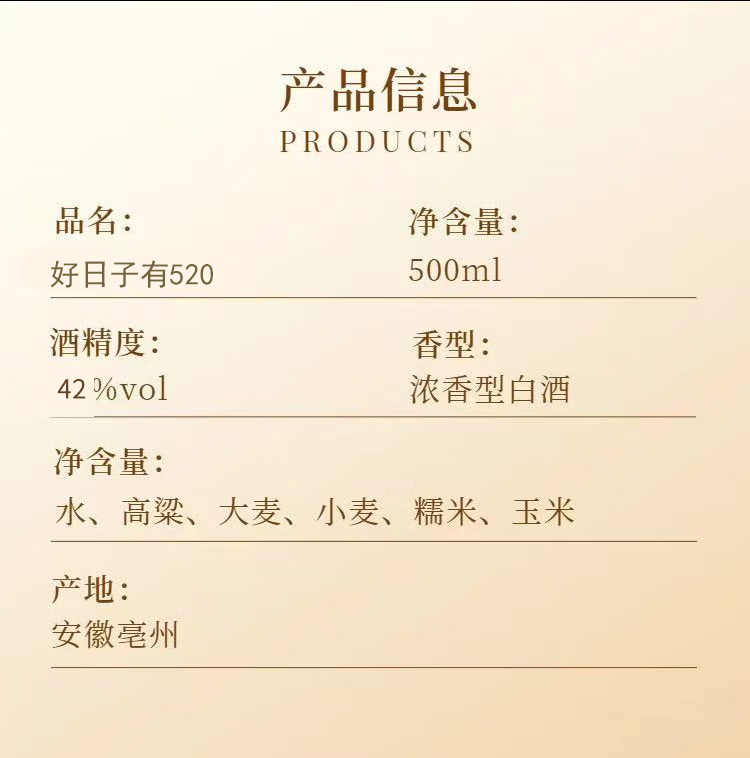 【喜宴定制】古井贡酒 好日子 有520 42度 浓香型白酒 500ml*6瓶整箱