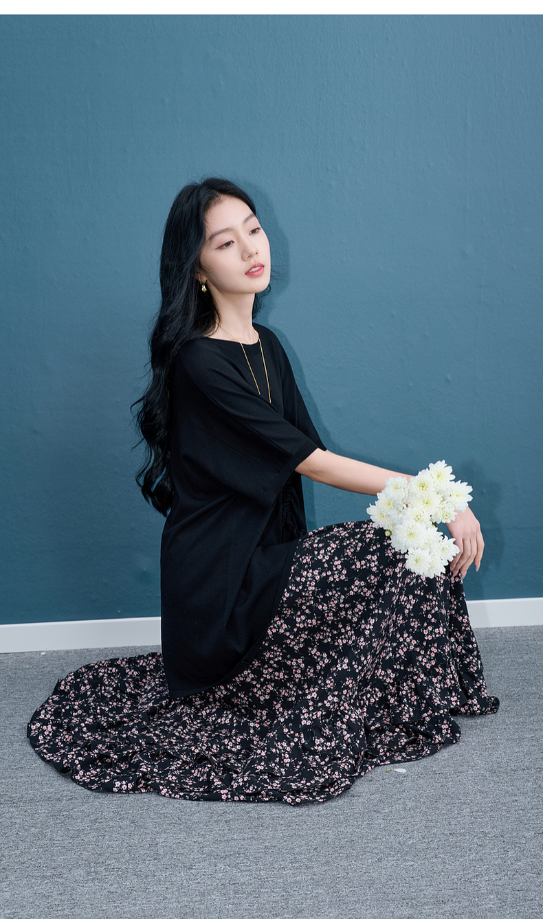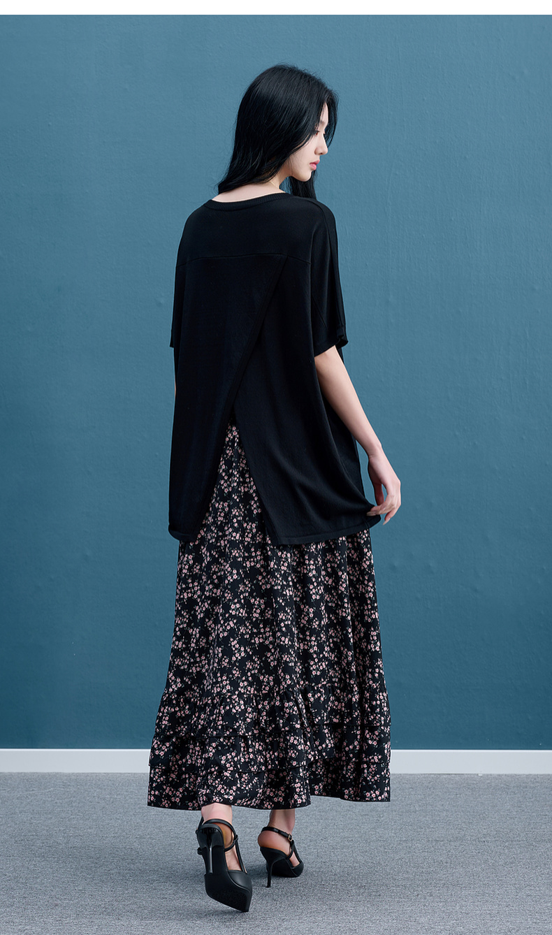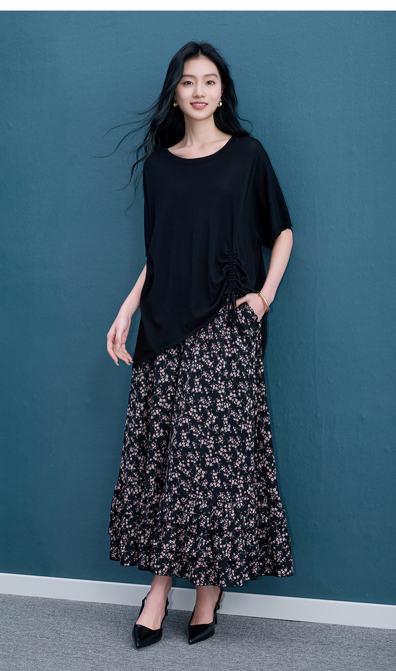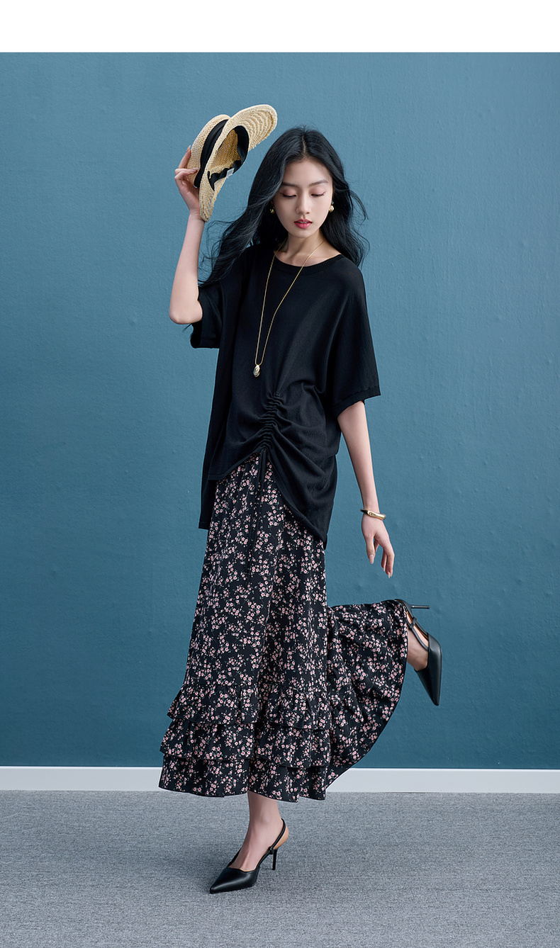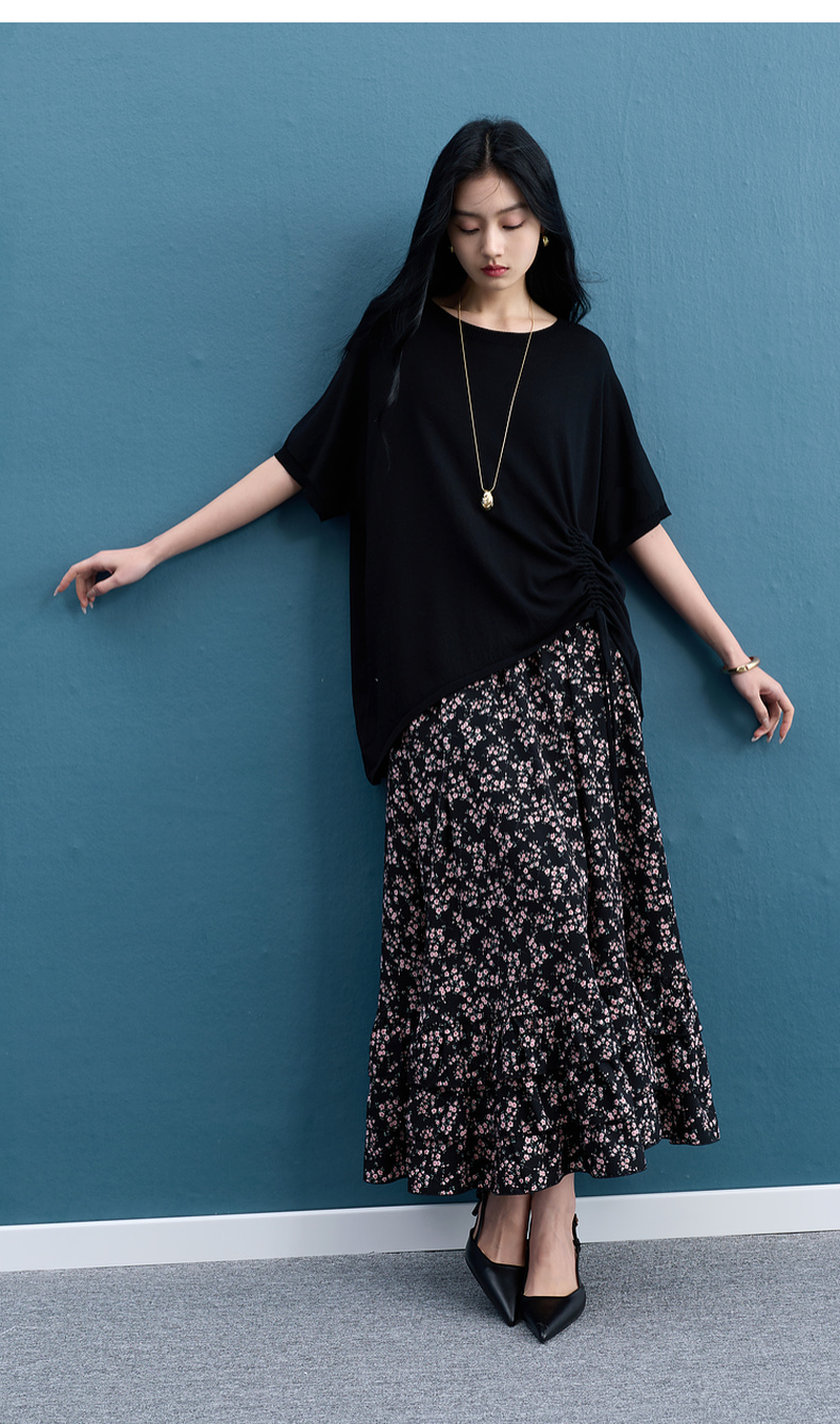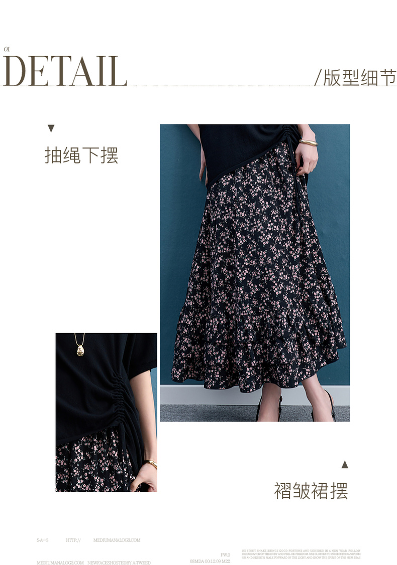 三彩2025秋季新款休闲套装宽松套头T恤碎花半身裙长裙两件套S