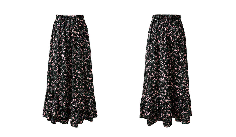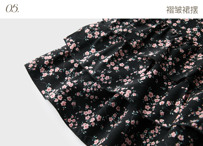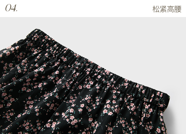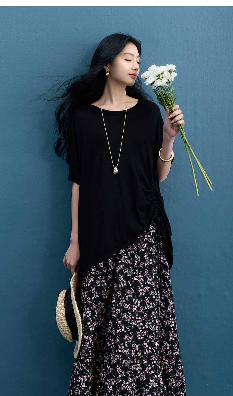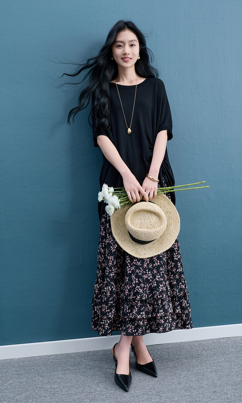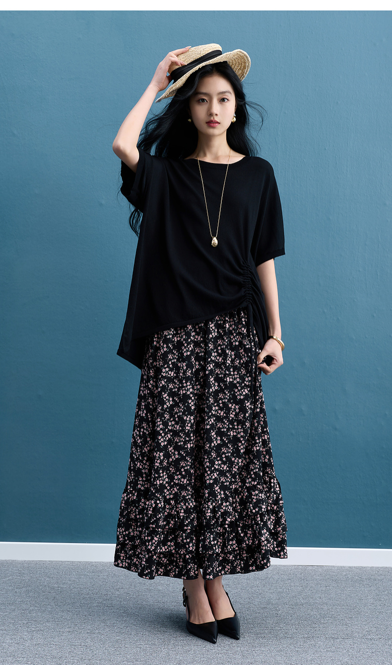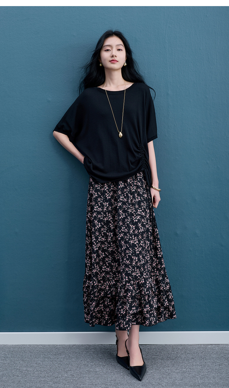 三彩2025秋季新款休闲套装宽松套头T恤碎花半身裙长裙两件套S