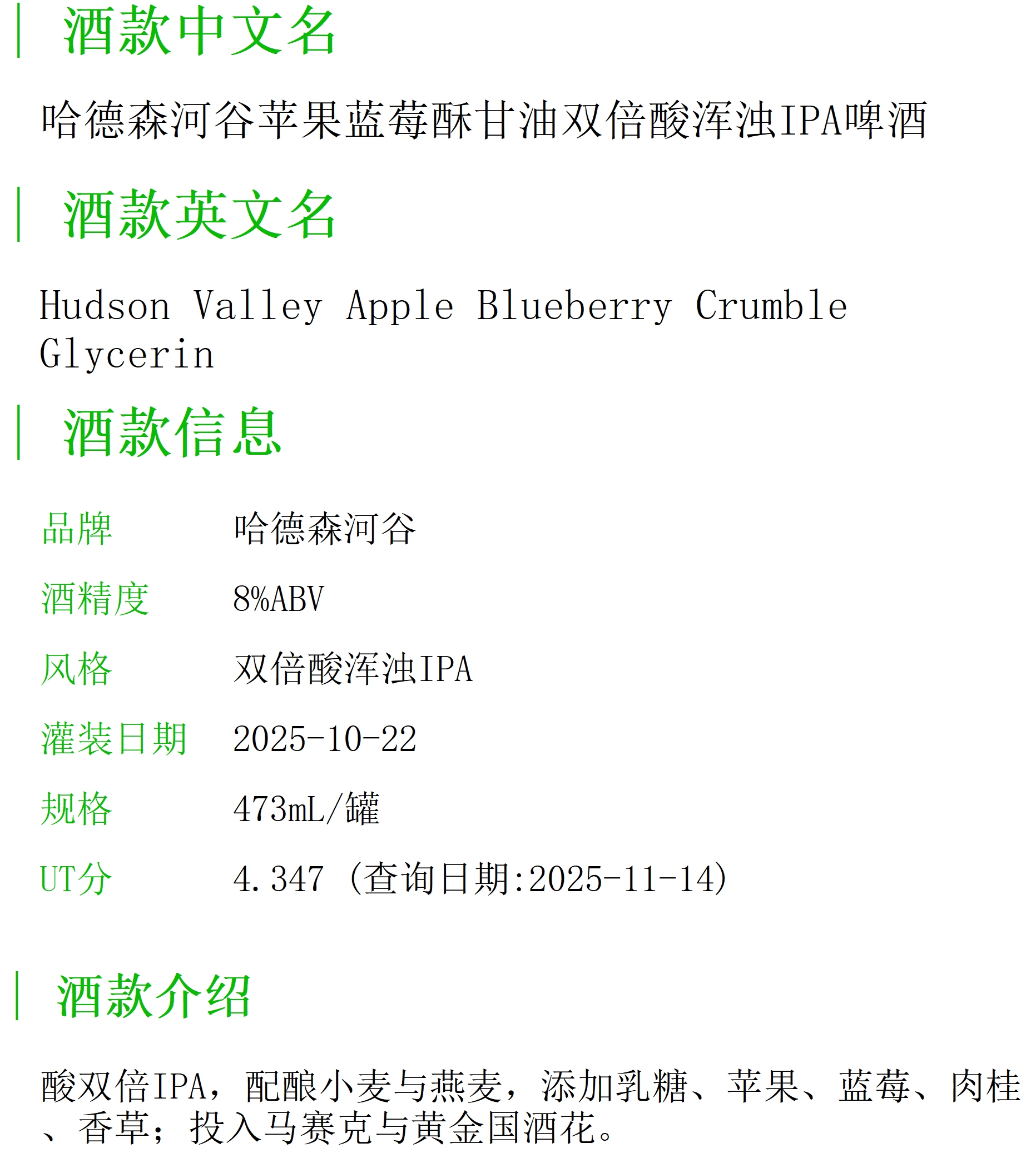 哈德森河谷苹果蓝莓酥甘油双倍酸浑浊IPA啤酒