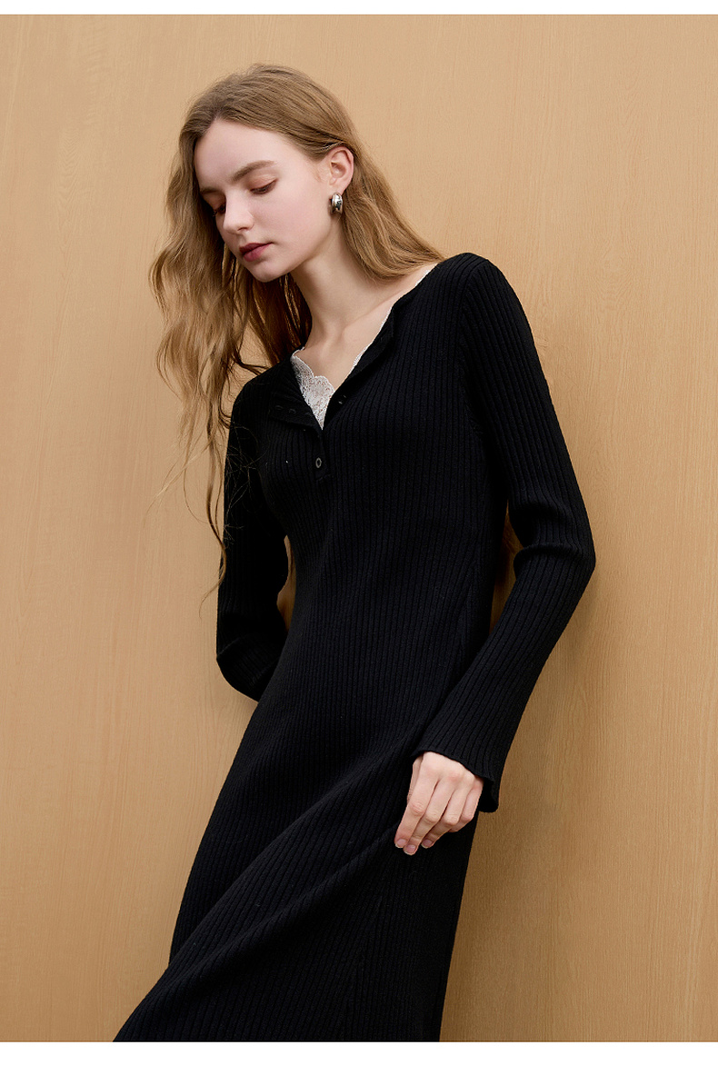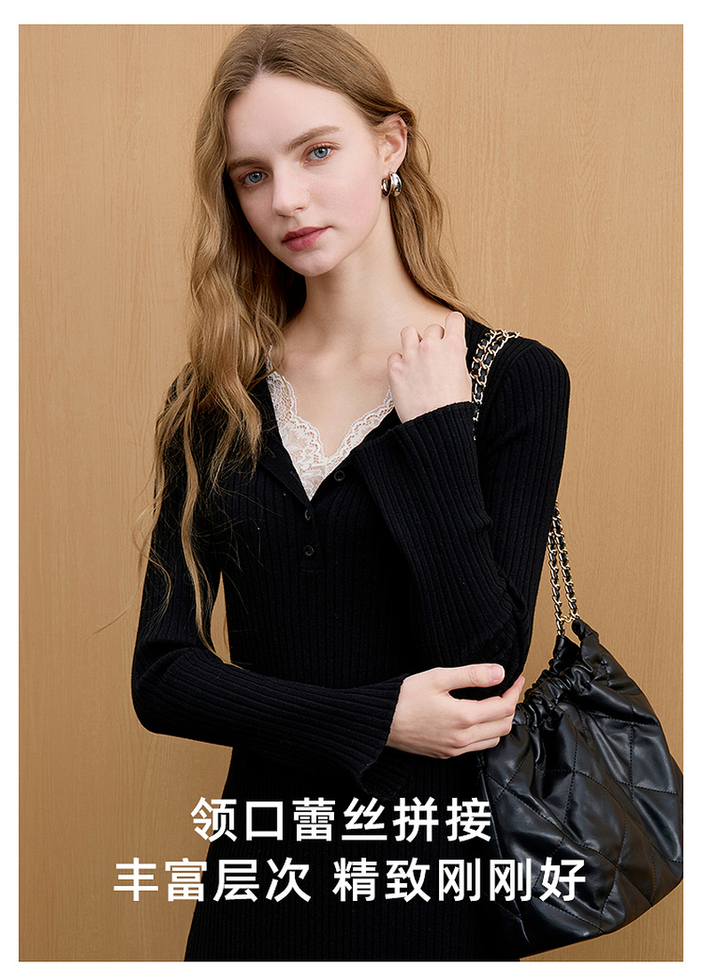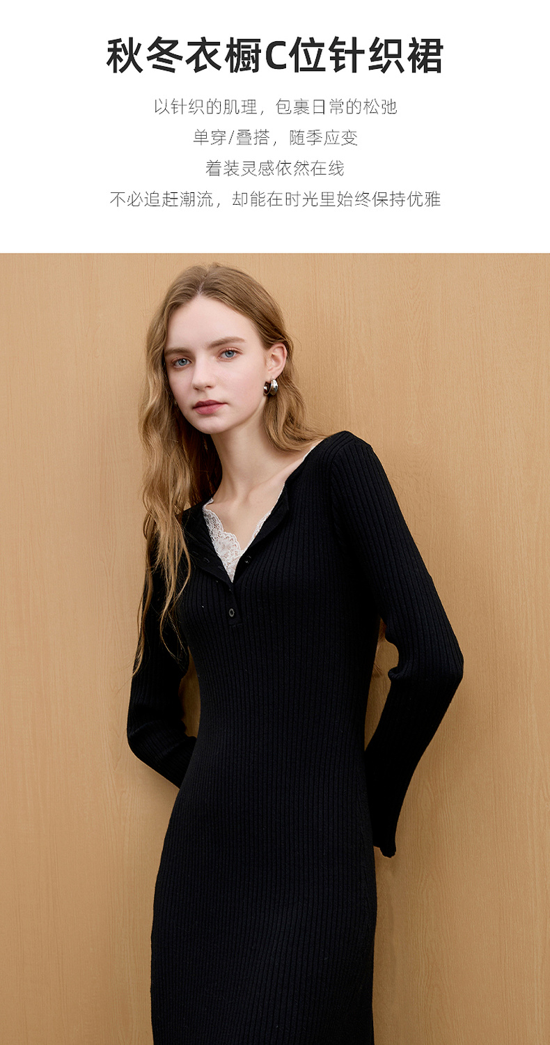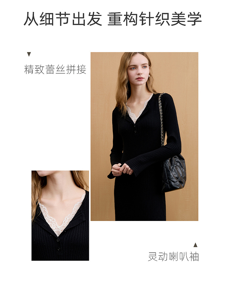 三彩2025冬季新款针织连衣裙蕾丝V领长袖收腰长裙A字裙简约M