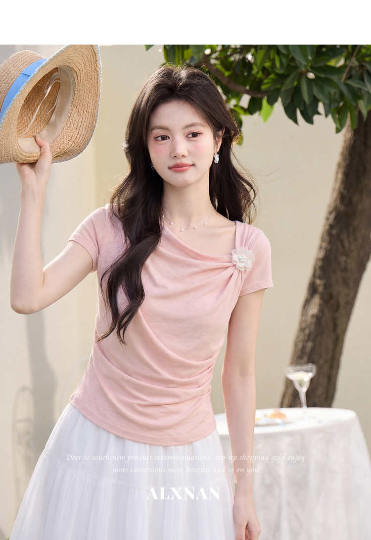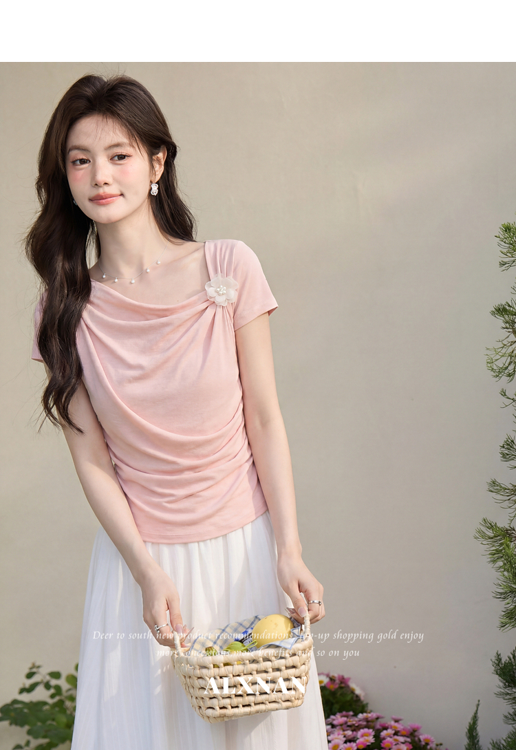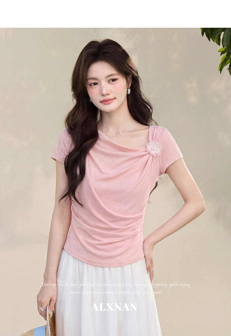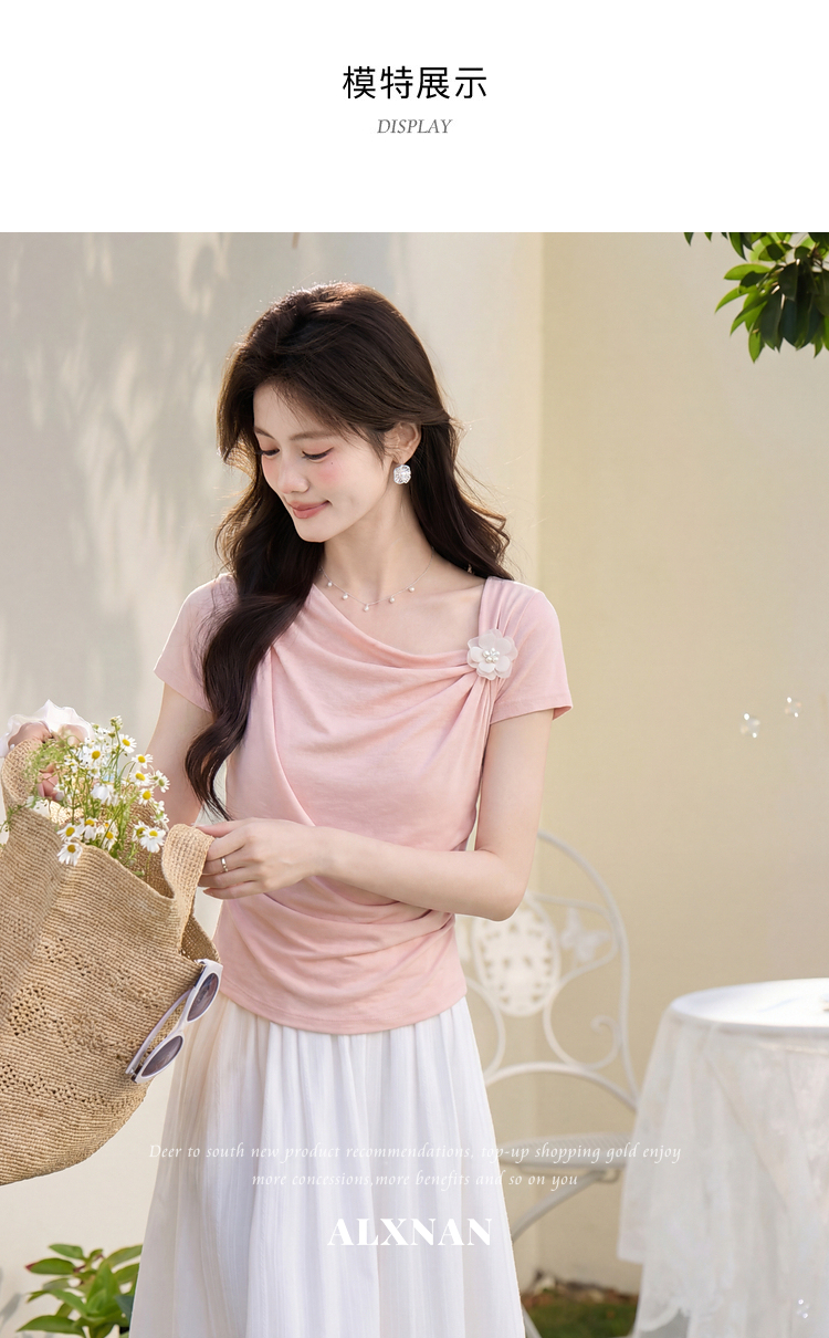 鹿向南「鎏光花语」浅粉色荡领花朵短袖T恤夏新款修身显瘦上衣女