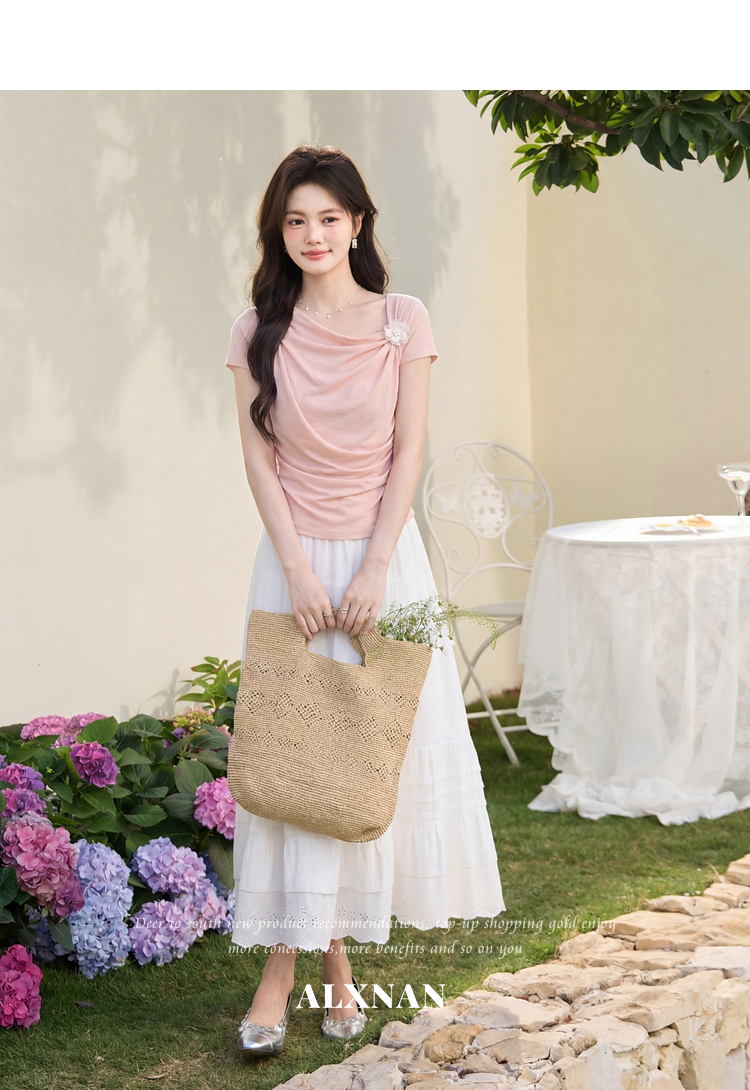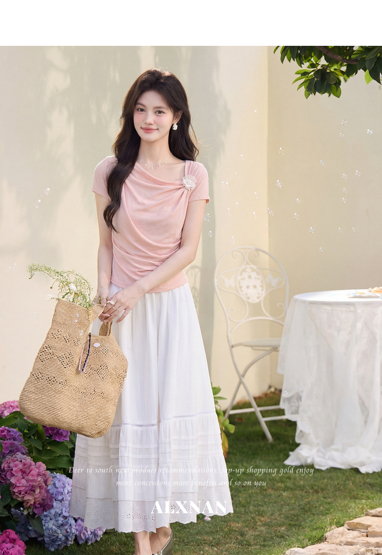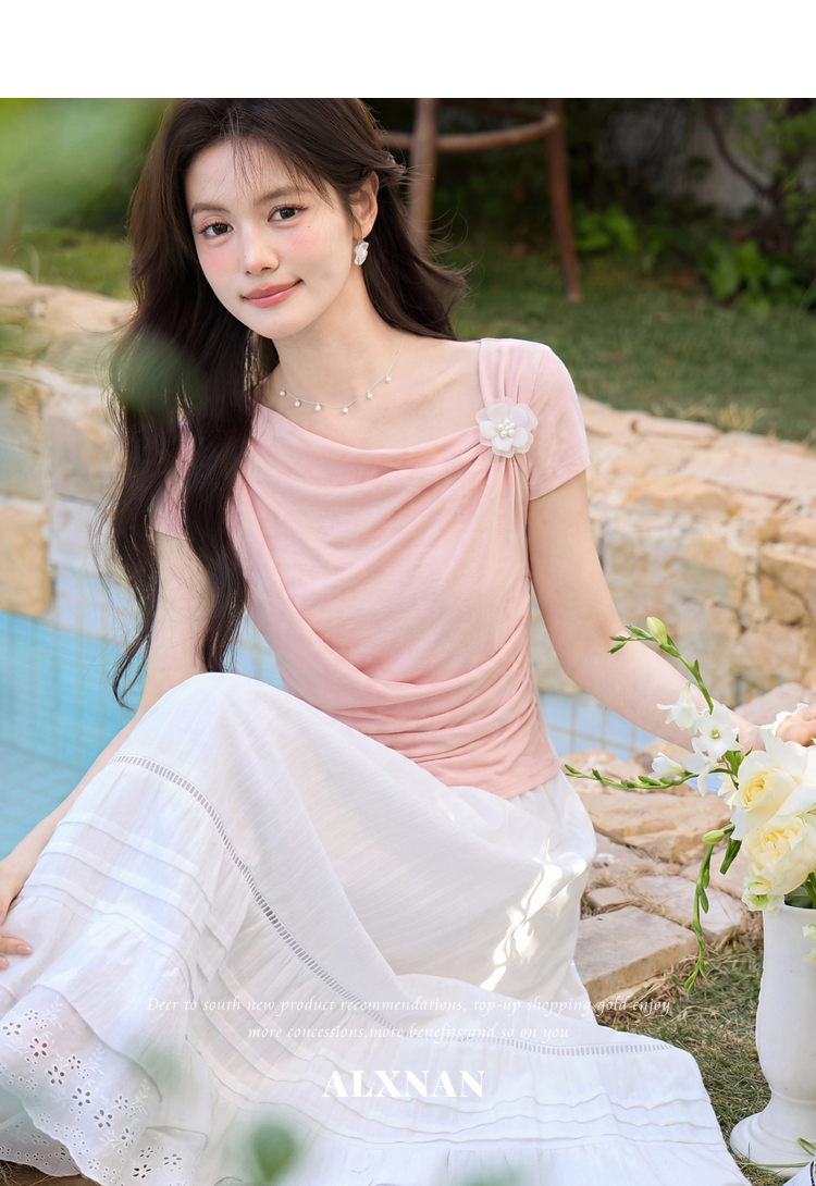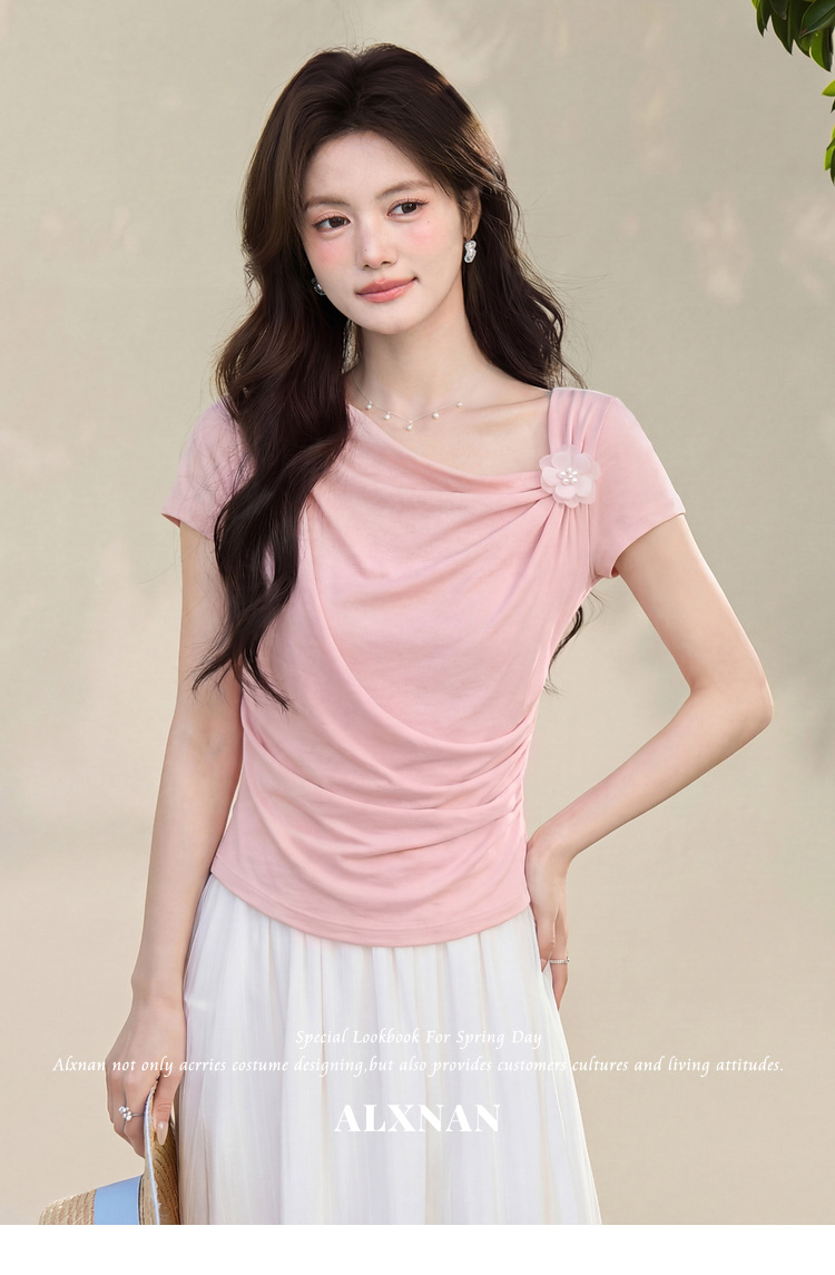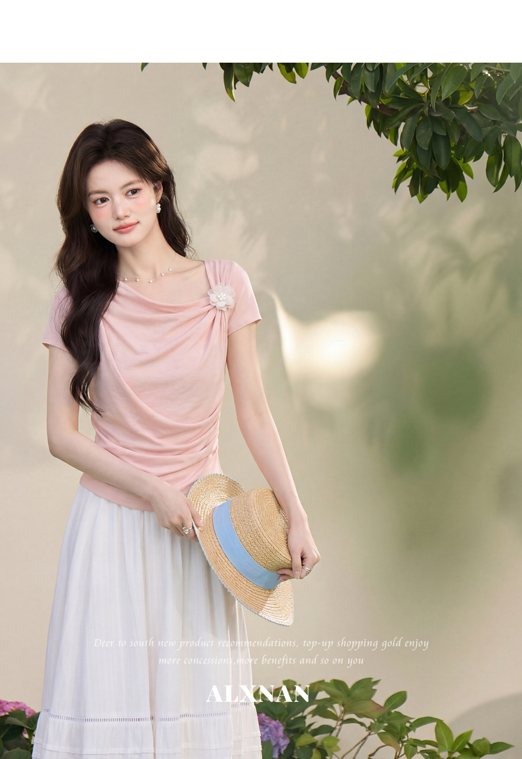 鹿向南「鎏光花语」浅粉色荡领花朵短袖T恤夏新款修身显瘦上衣女