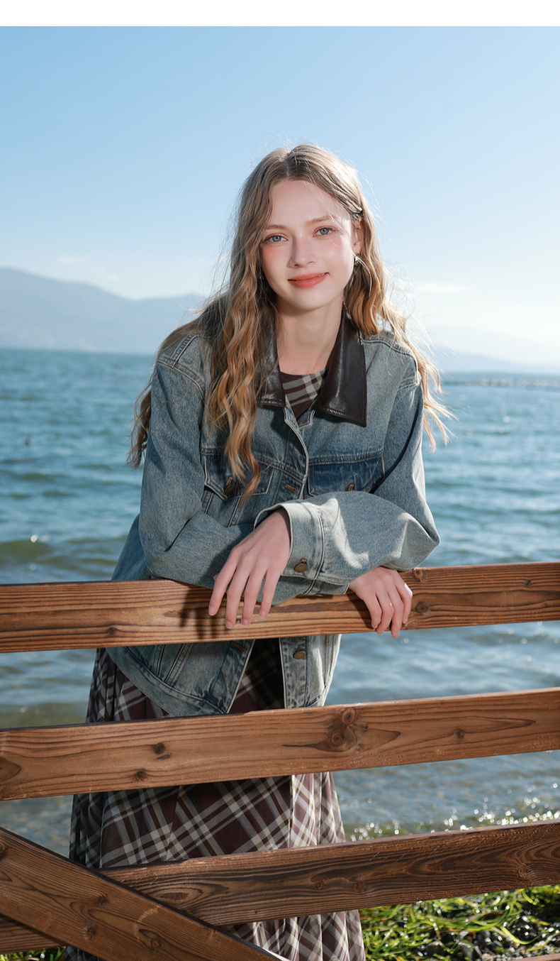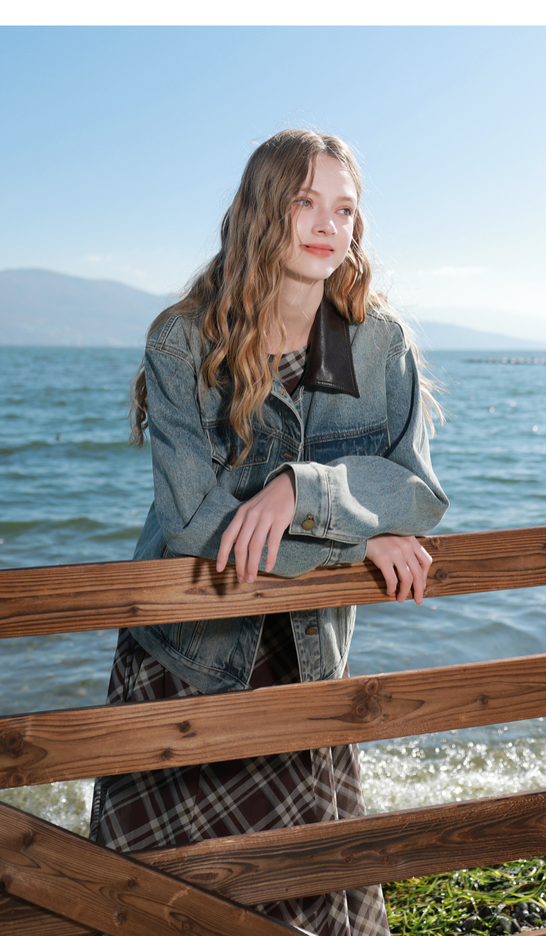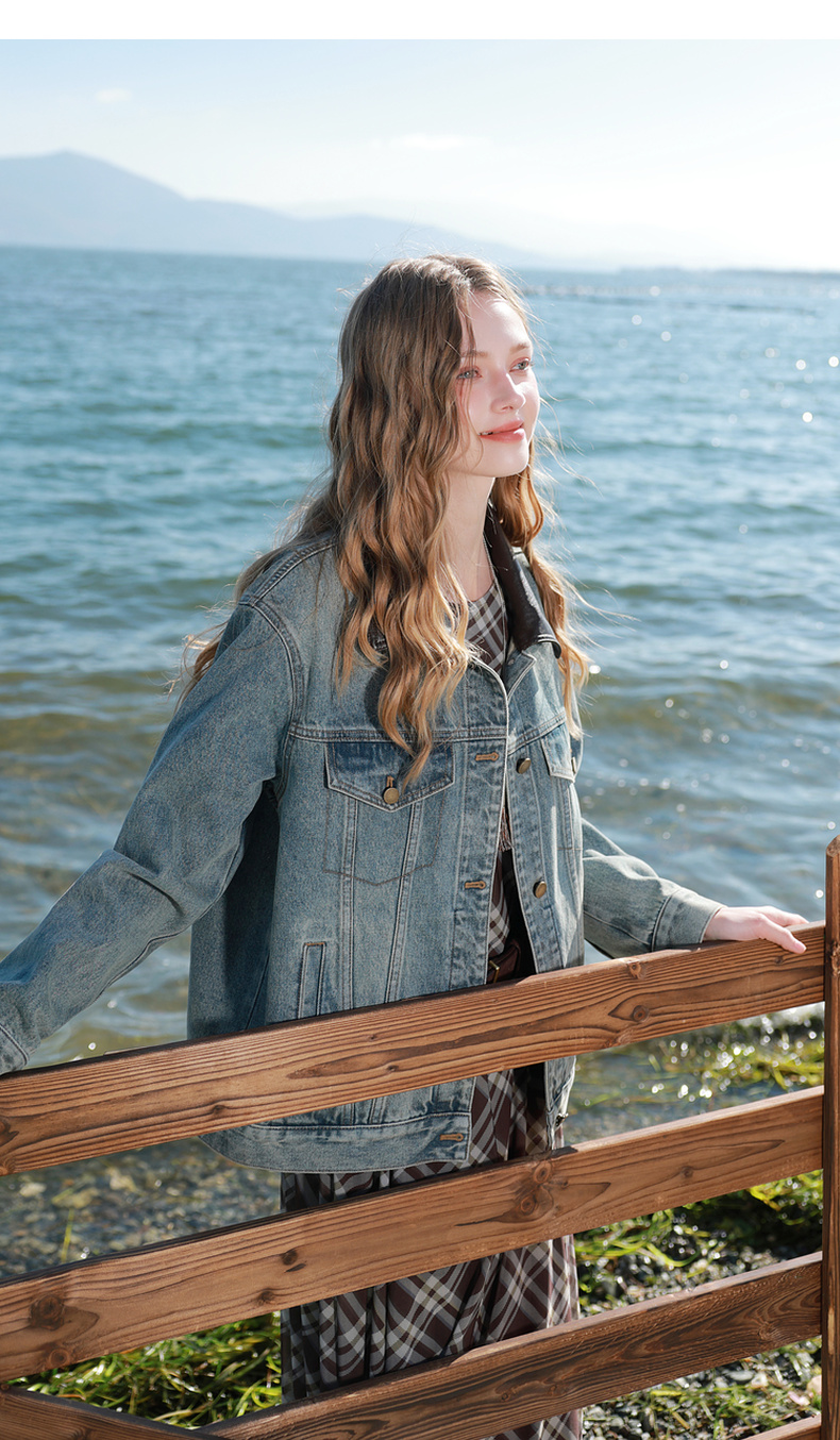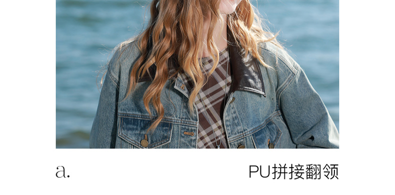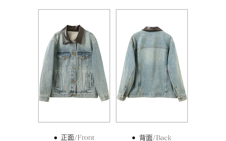 三彩2026春季新款牛仔外套PU翻领单排扣夹克开衫复古水洗宽松M