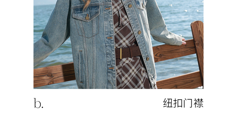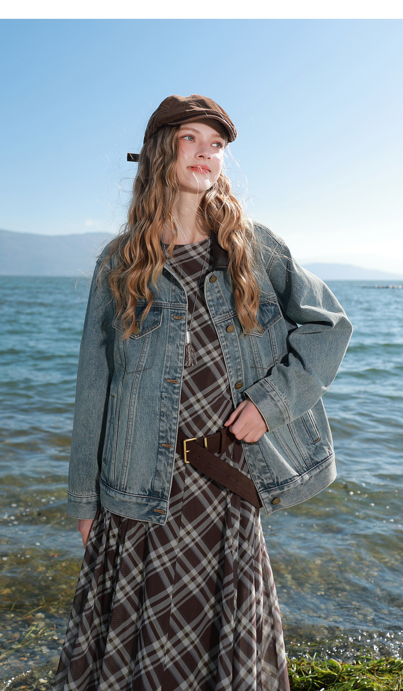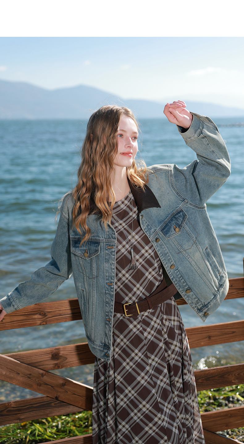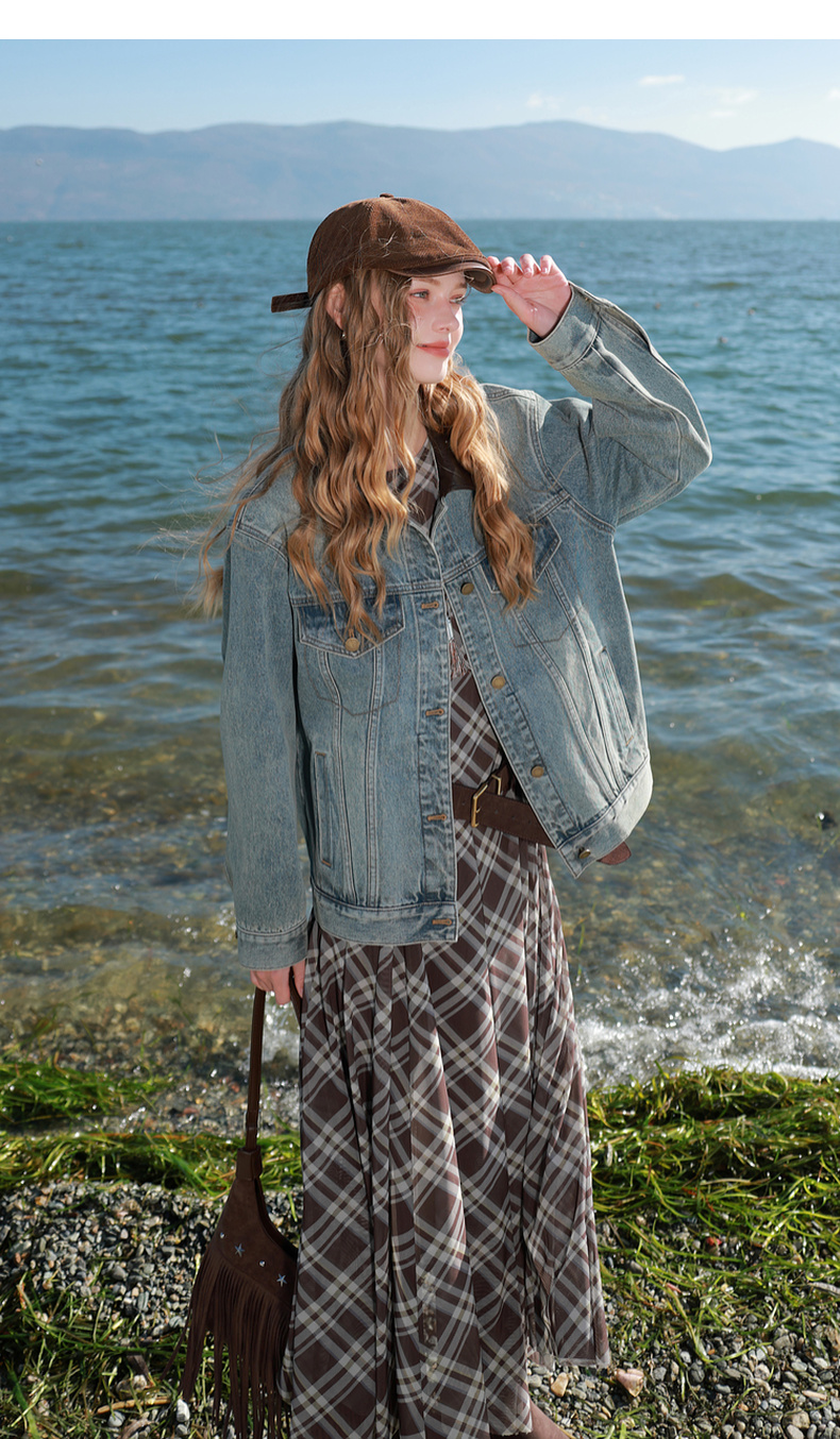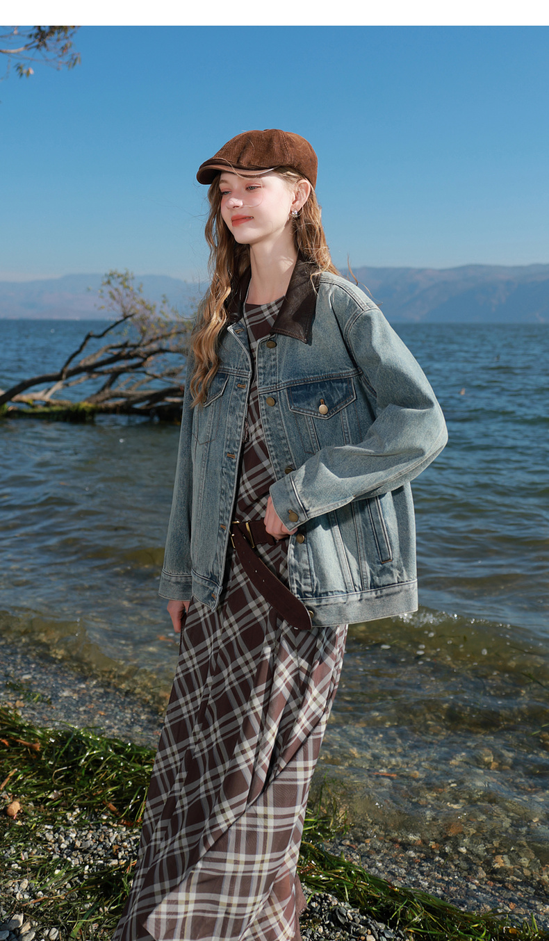 三彩2026春季新款牛仔外套PU翻领单排扣夹克开衫复古水洗宽松M