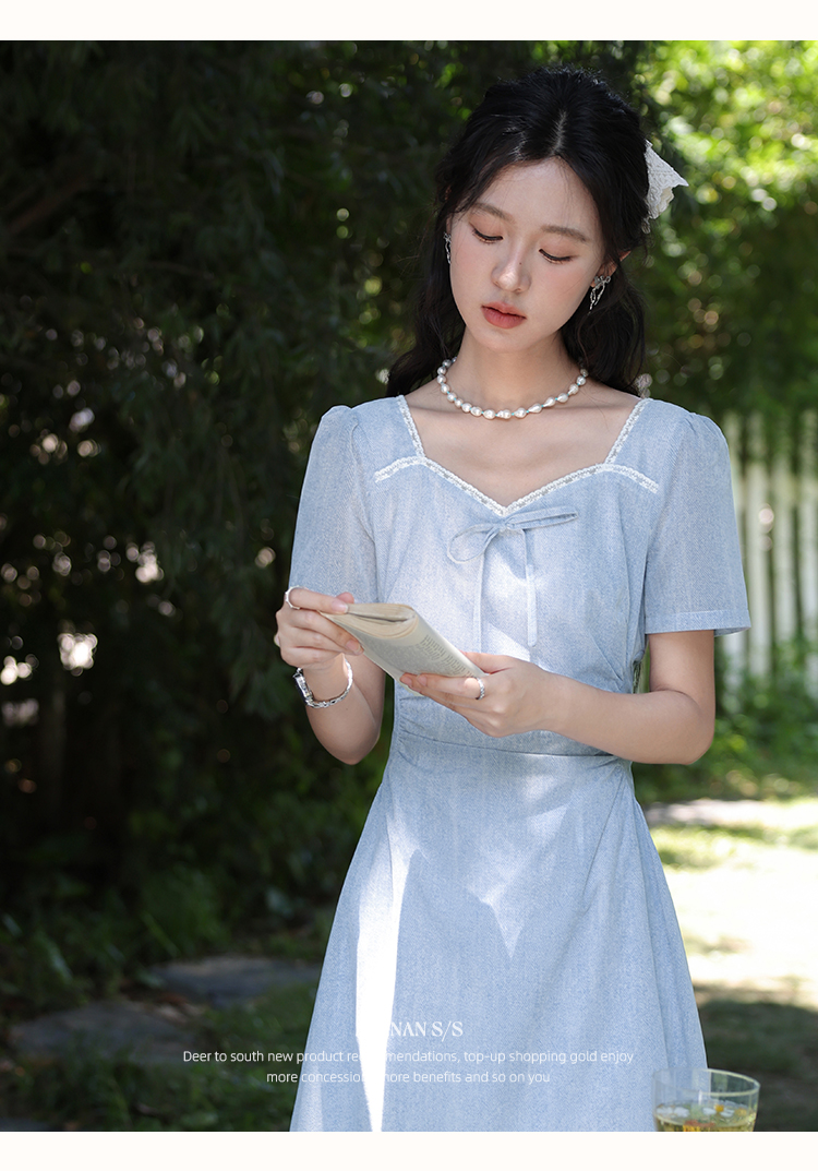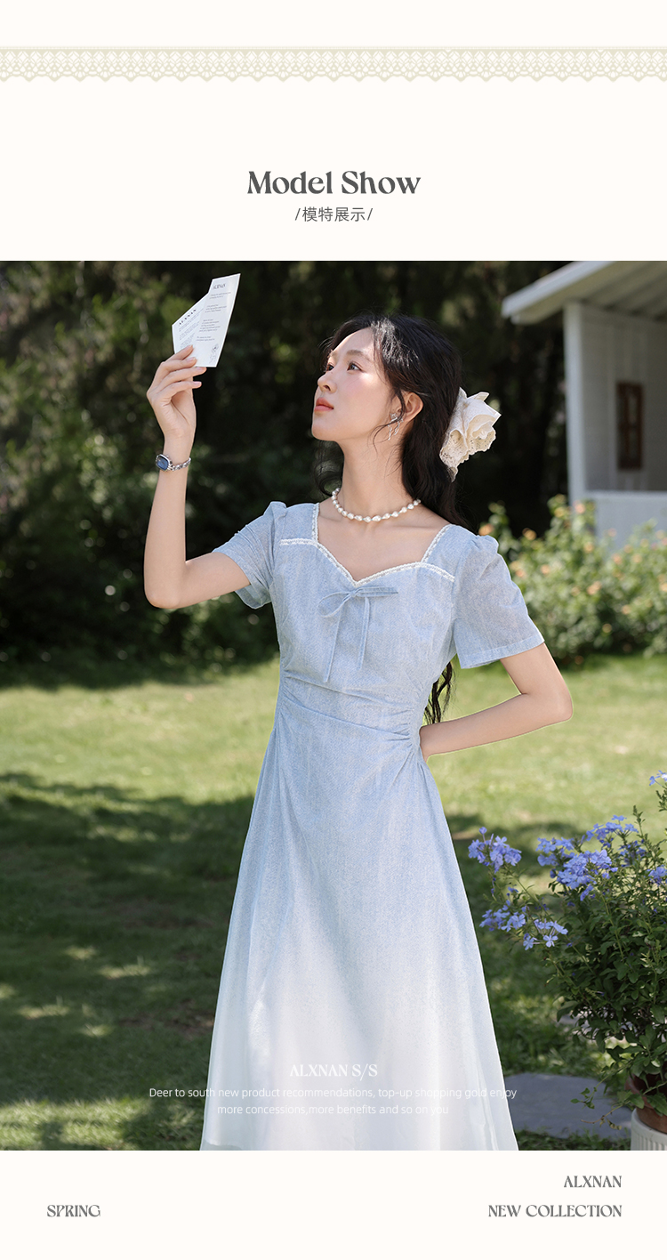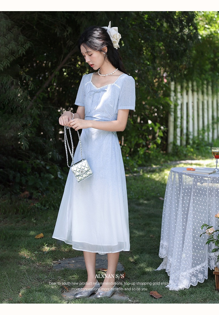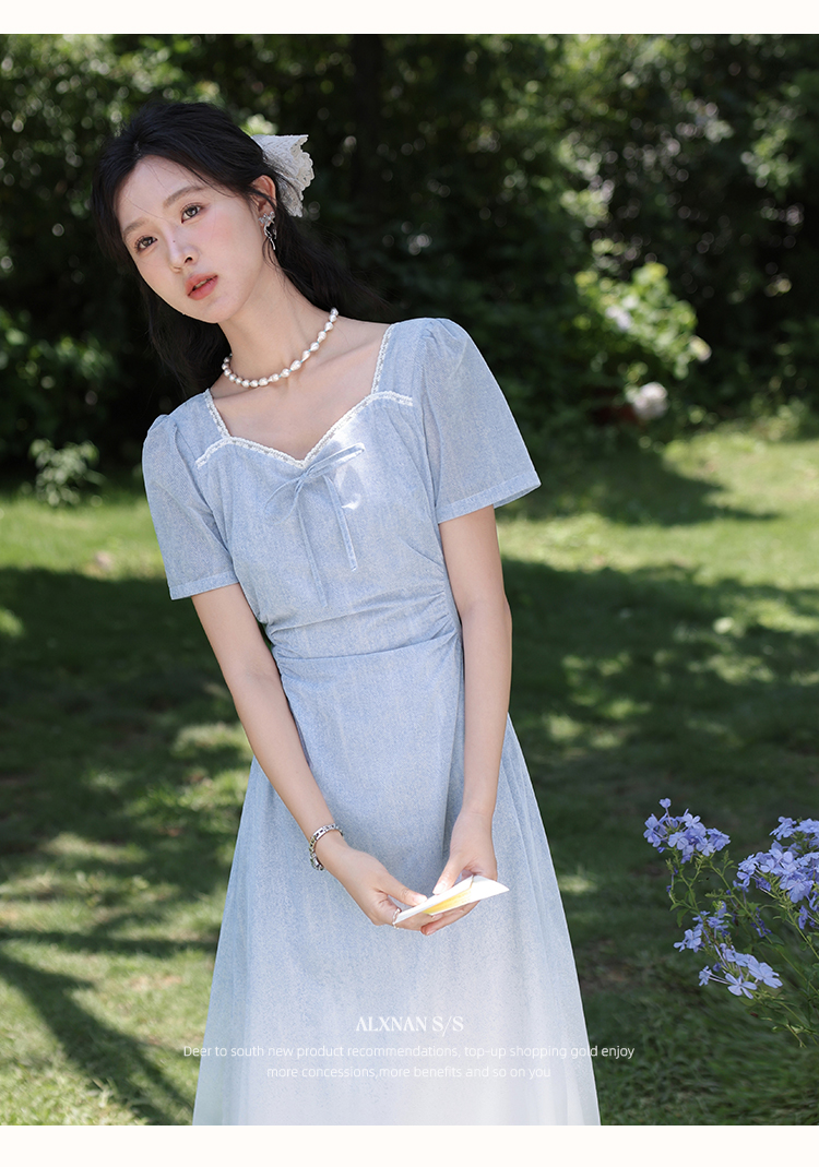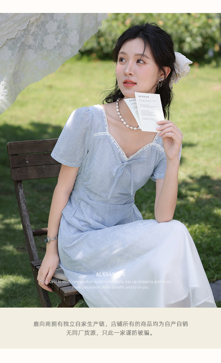 鹿向南「浦月少女」法式浅蓝色短袖连衣裙夏季新款时尚收腰长裙女DYL661807