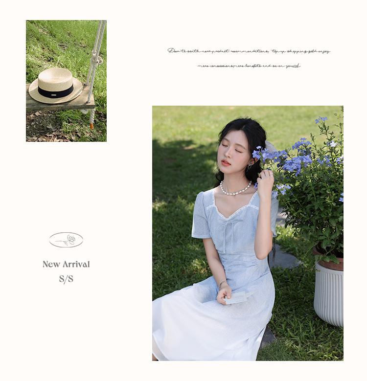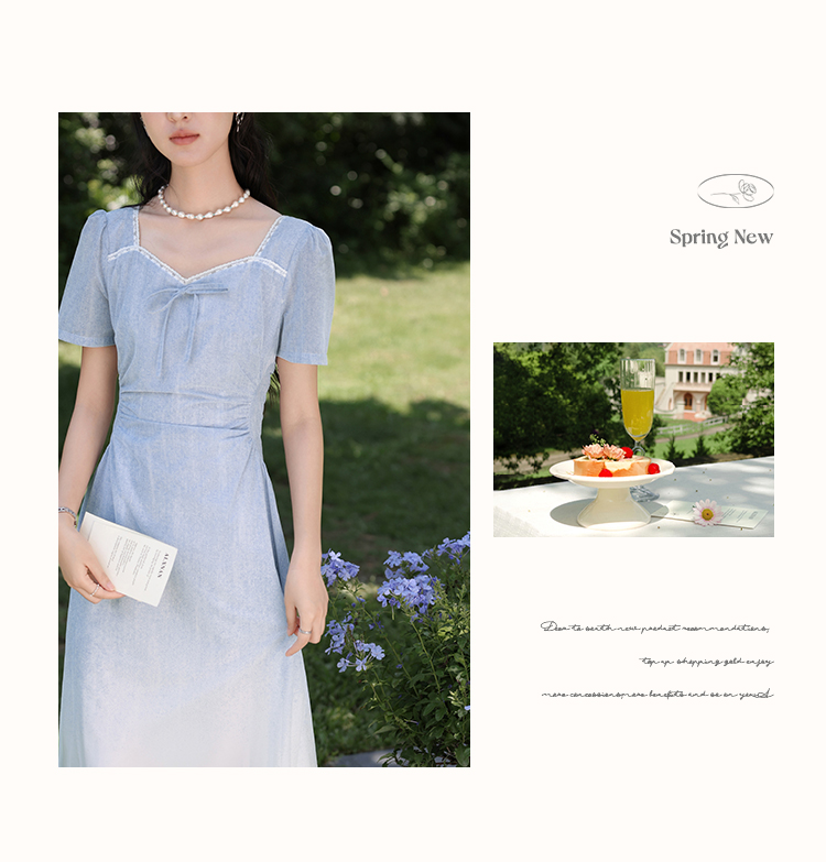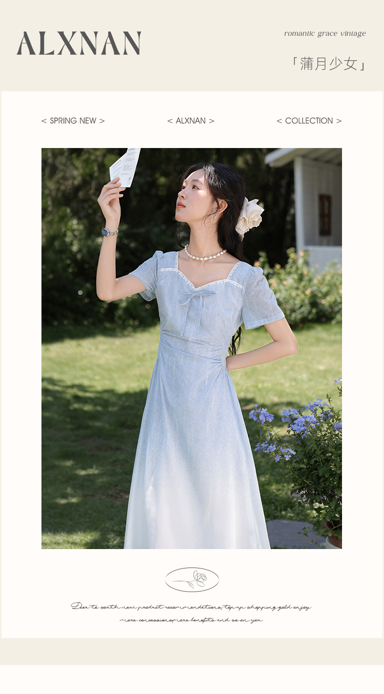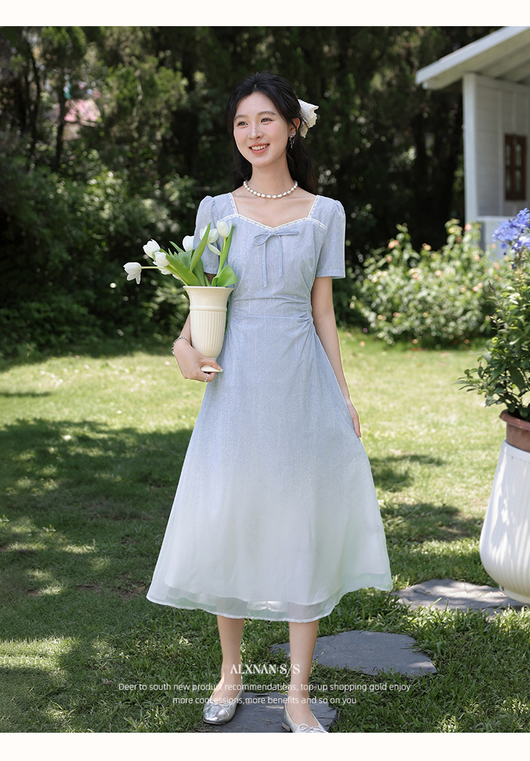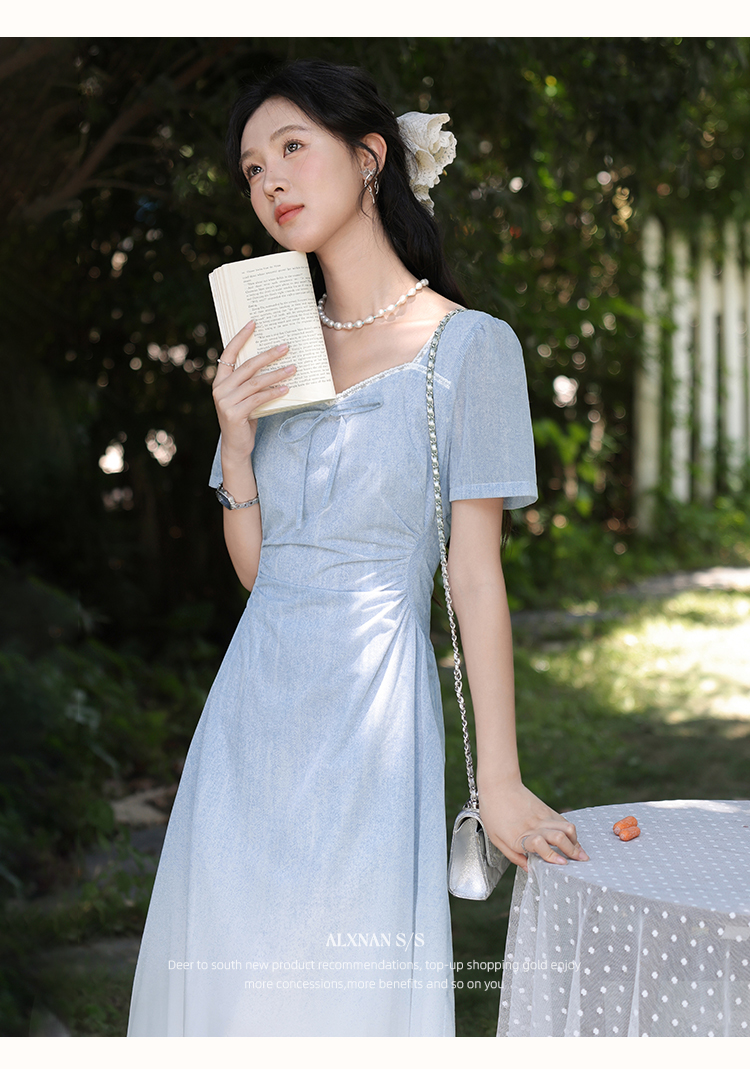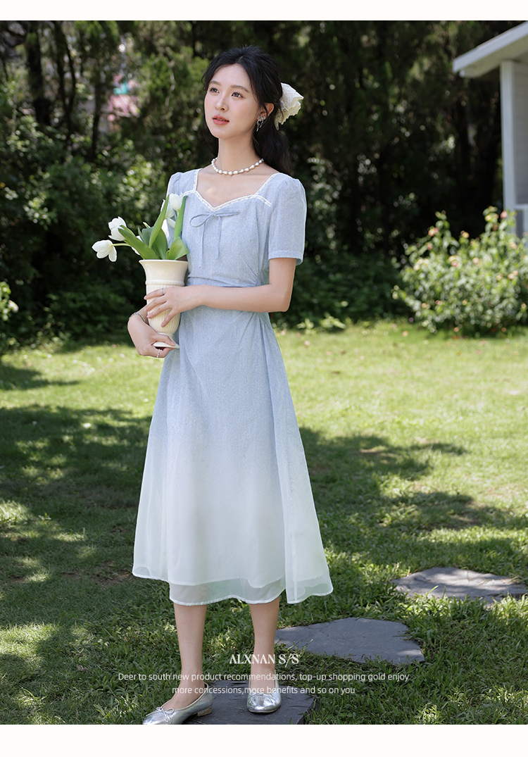 鹿向南「浦月少女」法式浅蓝色短袖连衣裙夏季新款时尚收腰长裙女DYL661807