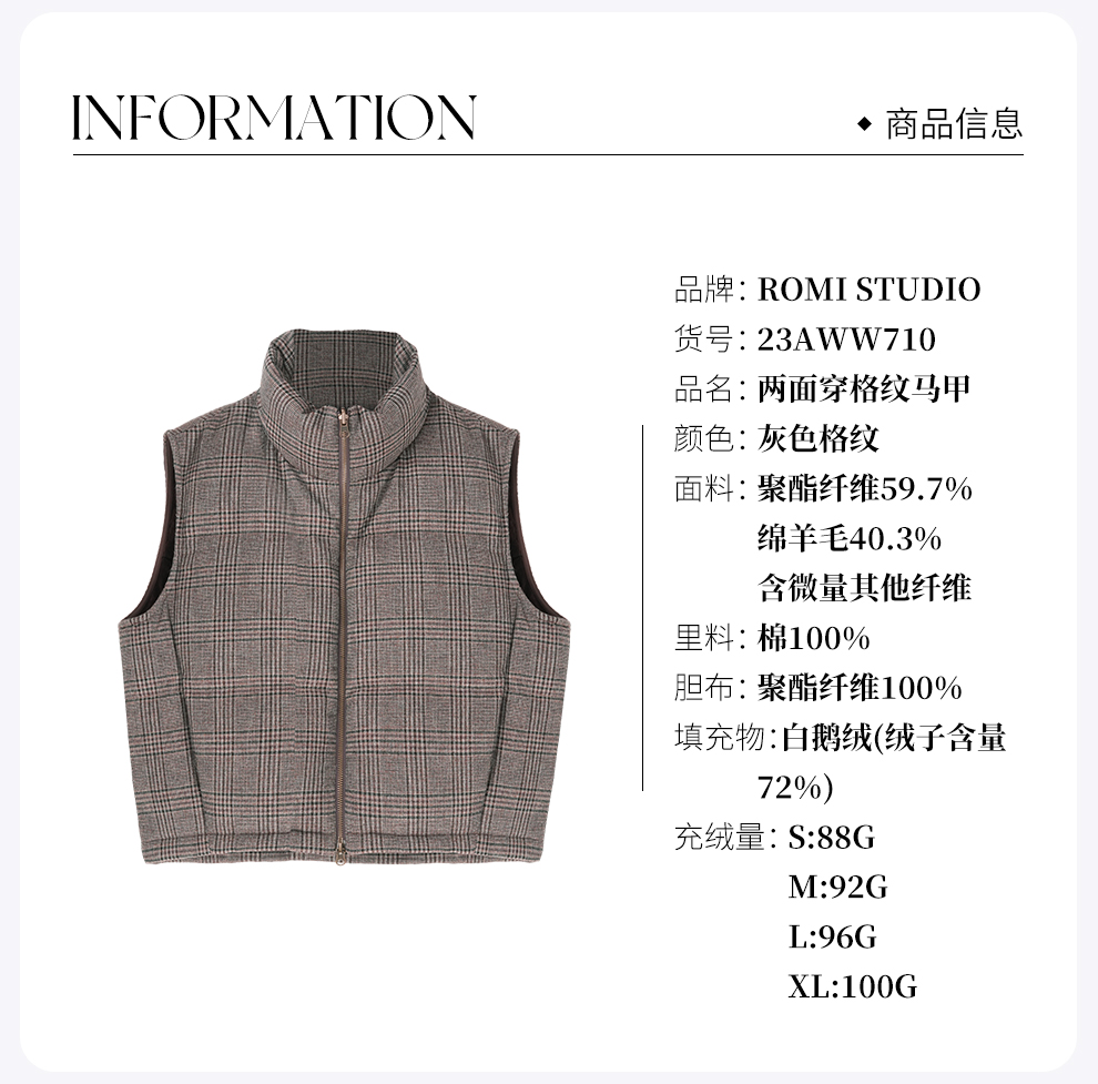 ROMI STUDIO“两面穿”秋冬百搭羊毛格纹90白鹅绒羽绒马甲 23AWW710