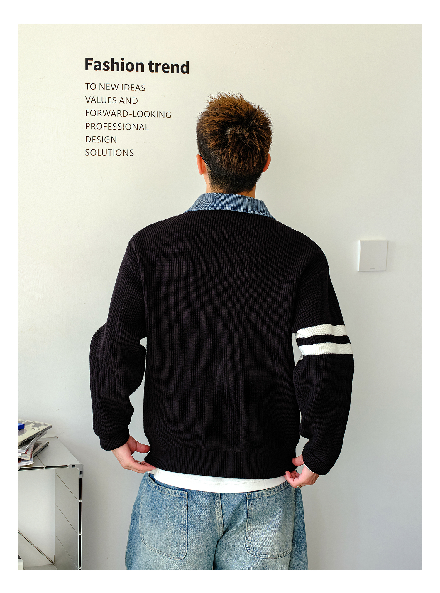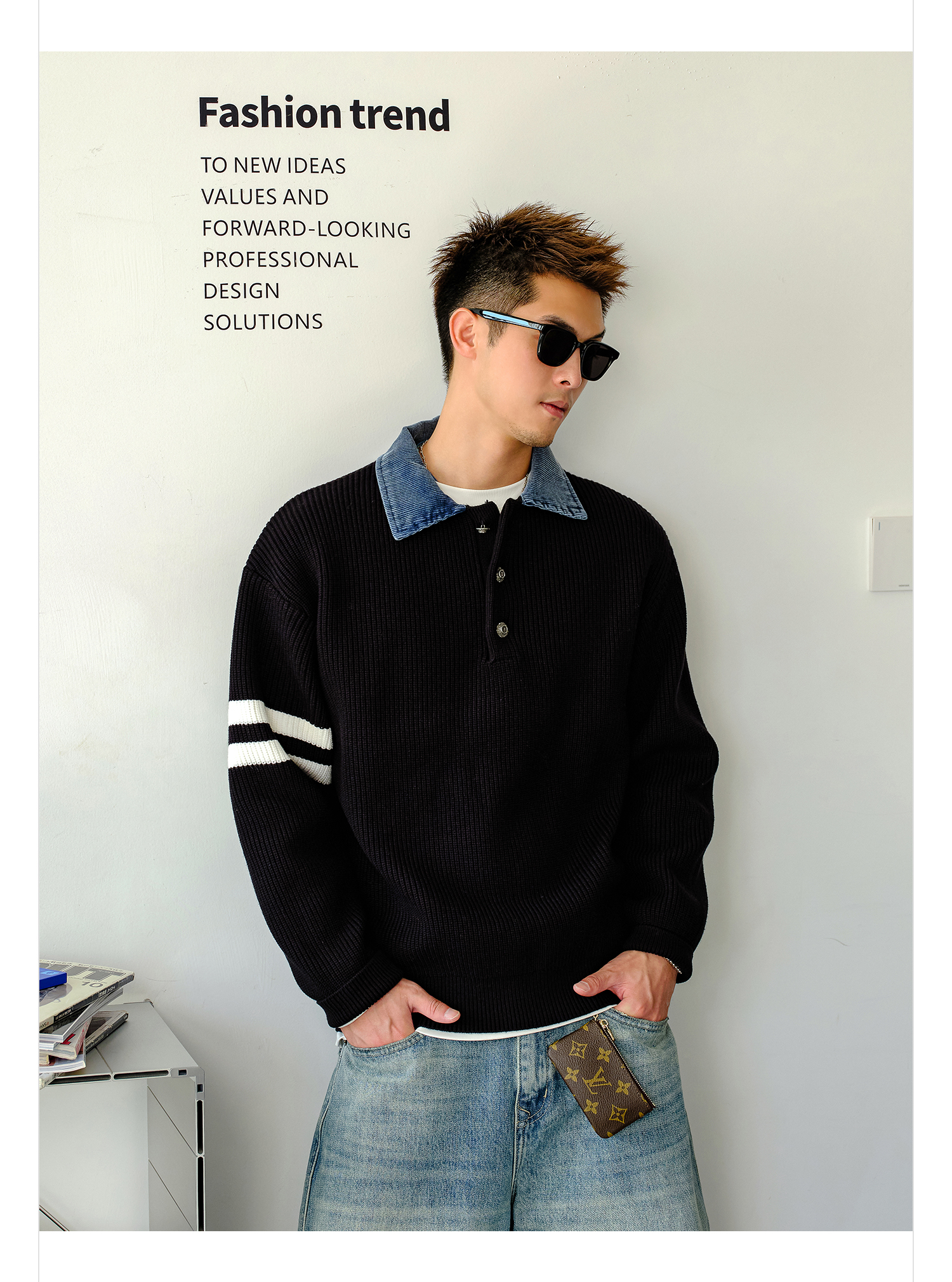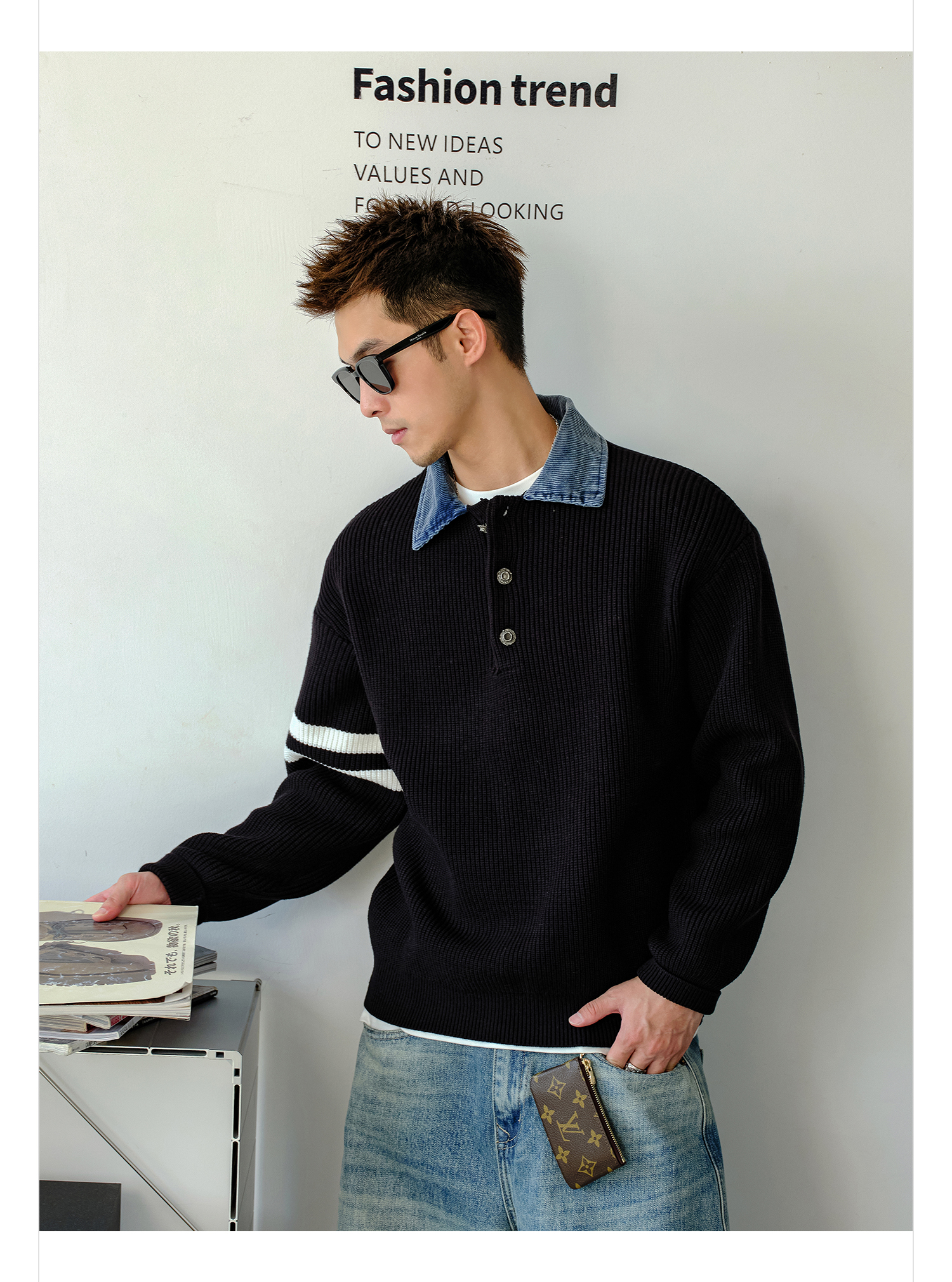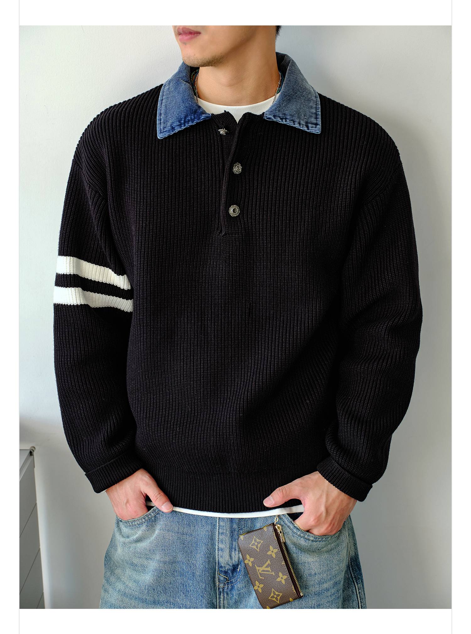 徐太浪【肌理纹 撞色条纹】拼接POLO领毛衣男秋冬内搭针织衫上衣
