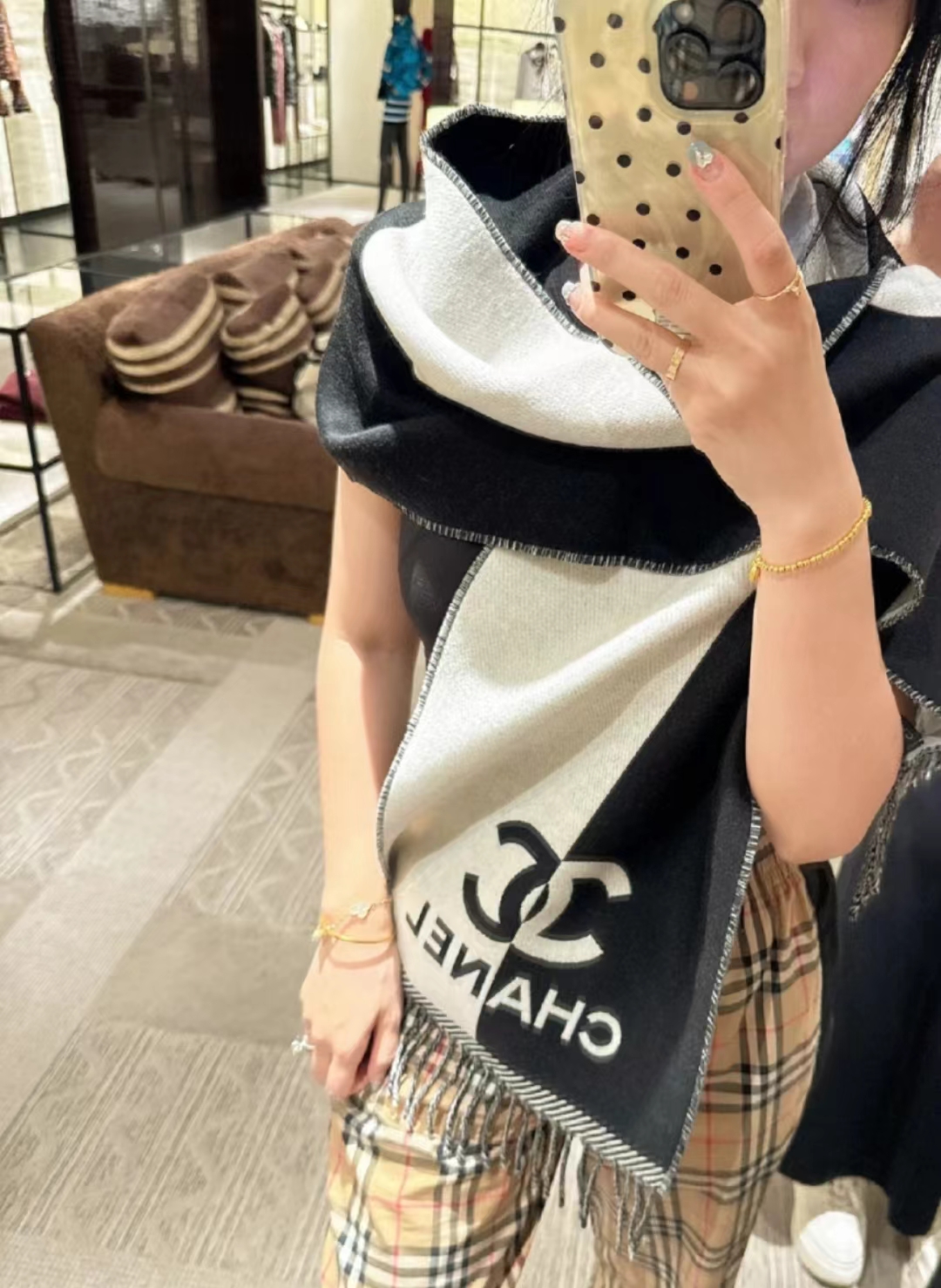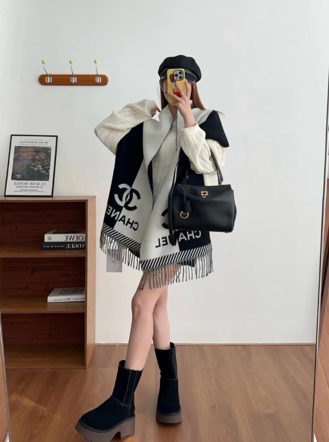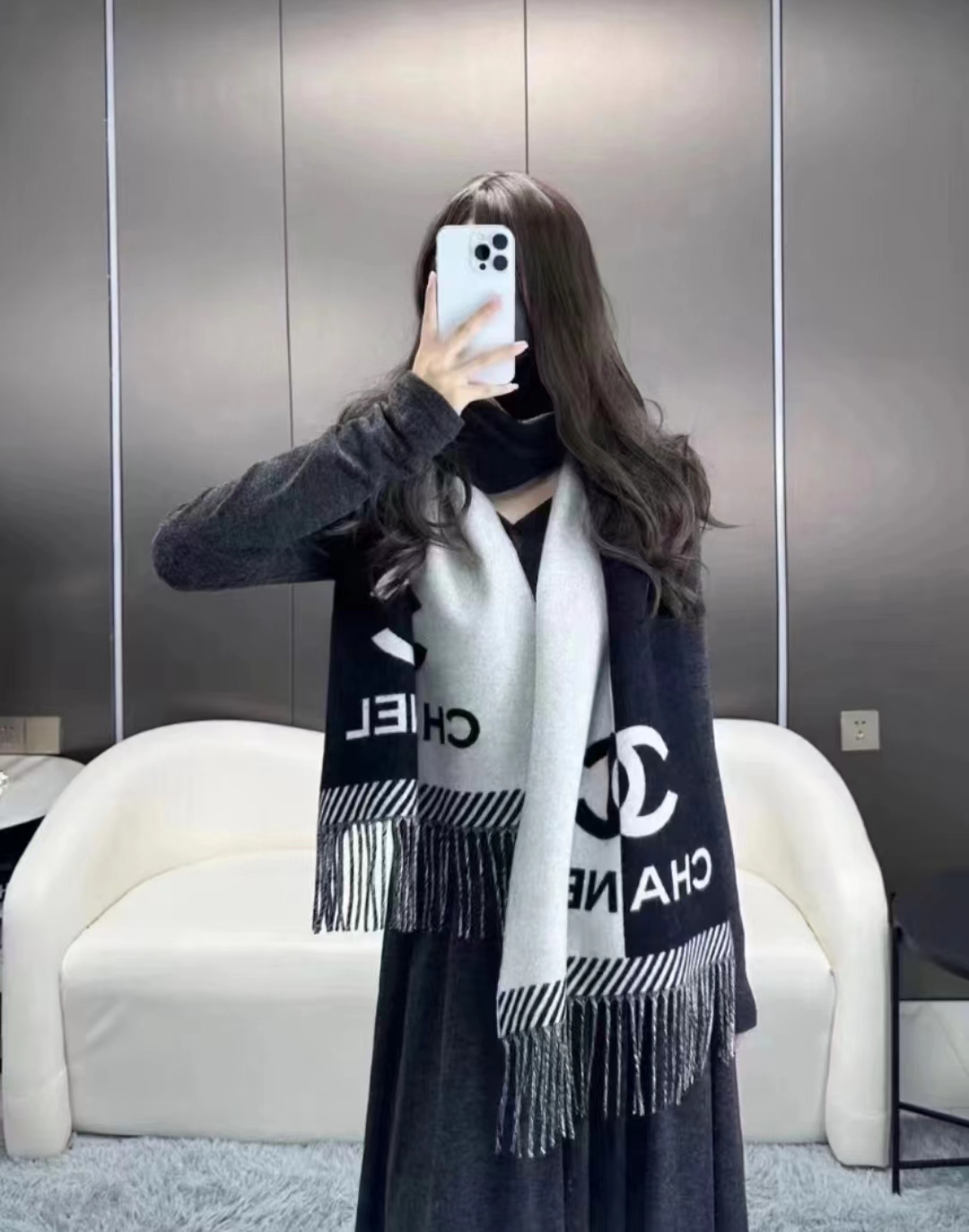 目测是大爆款!双面异色提花 两面完全相反的颜色及图案 设计真的非常走心 ,超大品牌LOGO与双C拼色点缀整条围巾 高级美‼️面料巨流弊。100% 美丽奴初剪羊毛,作为羊毛界的天花板,半点不扎,温柔有质感‼️男生女士都可以入 百搭不挑人 必须自留😁