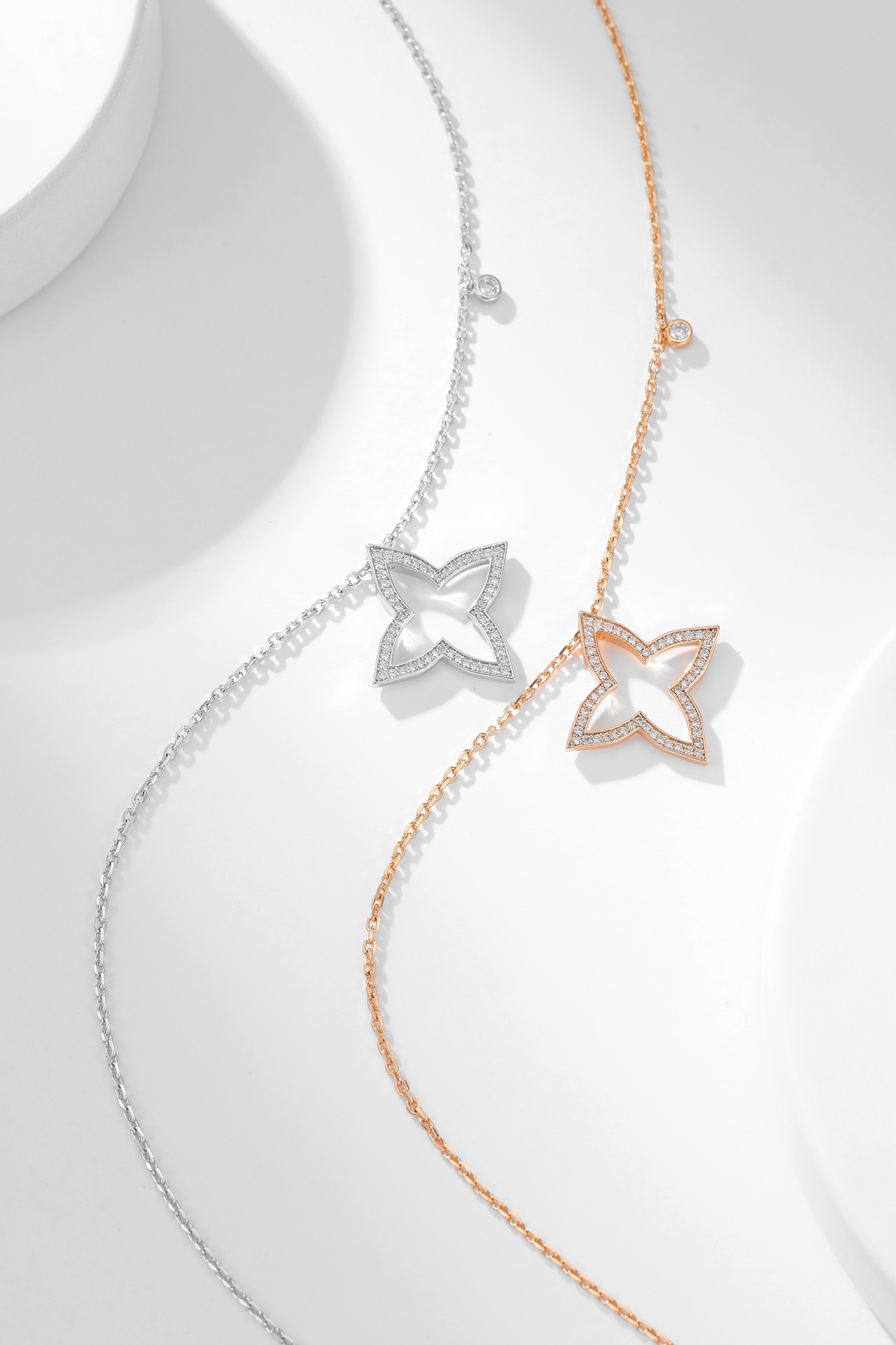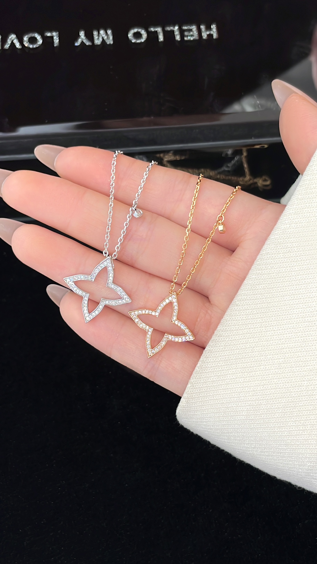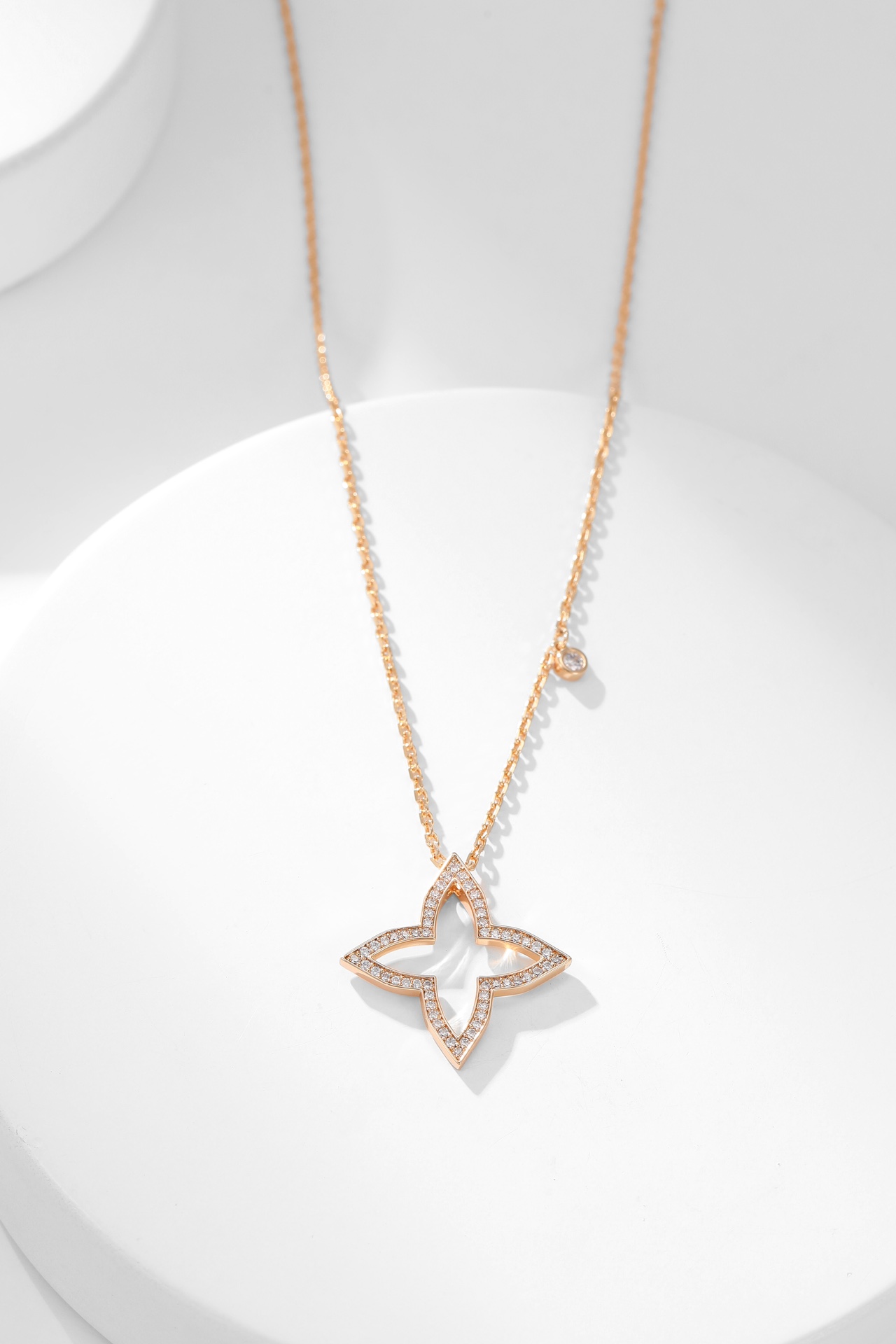 LV四芒星镂空满钻项链 Blossom系列新品项链,依然以品牌标志Monogram四芒星图案为设计元素,新作最特别之处以镂空几何造型搭配巧妙的钻石镶嵌,塑造出星芒闪耀的动人气质。项链长38~42cm 新作运用金质塑造出Monogram四芒星的标志性造型,可选抛光处理玫瑰金和白金两种材质,镶嵌圆形钻石。本系列由项链、戒指、耳饰单品组成,每件单品都可与其他单品组合搭配,打造出更具个性的风格。