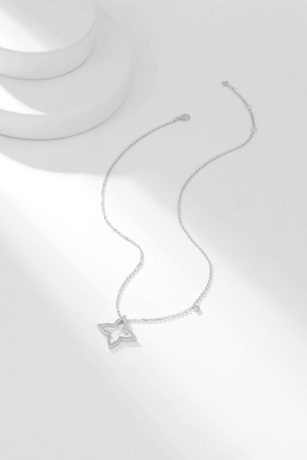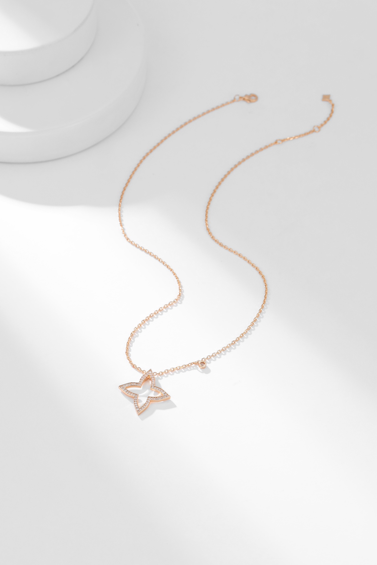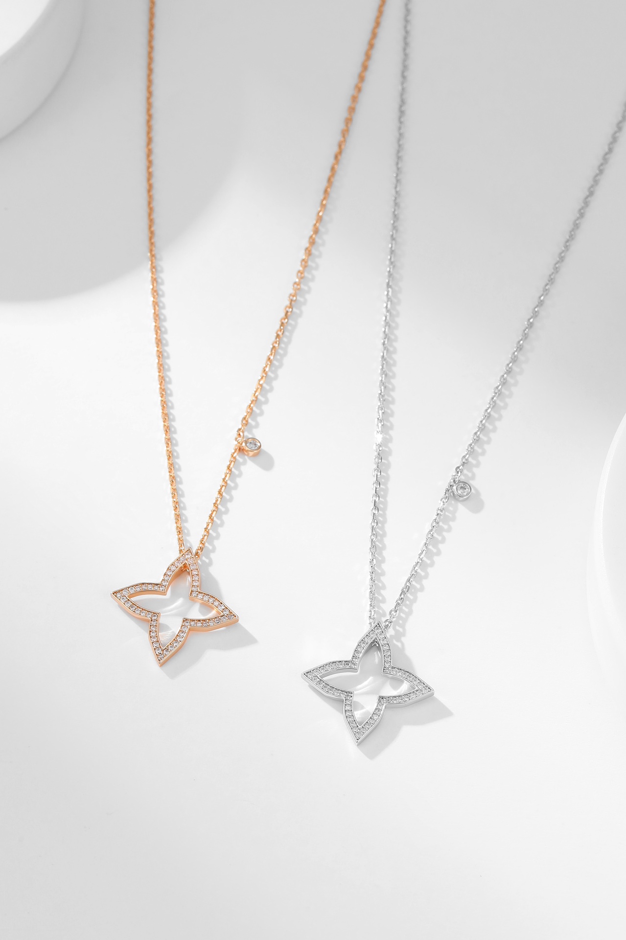 LV四芒星镂空满钻项链 Blossom系列新品项链,依然以品牌标志Monogram四芒星图案为设计元素,新作最特别之处以镂空几何造型搭配巧妙的钻石镶嵌,塑造出星芒闪耀的动人气质。项链长38~42cm 新作运用金质塑造出Monogram四芒星的标志性造型,可选抛光处理玫瑰金和白金两种材质,镶嵌圆形钻石。本系列由项链、戒指、耳饰单品组成,每件单品都可与其他单品组合搭配,打造出更具个性的风格。