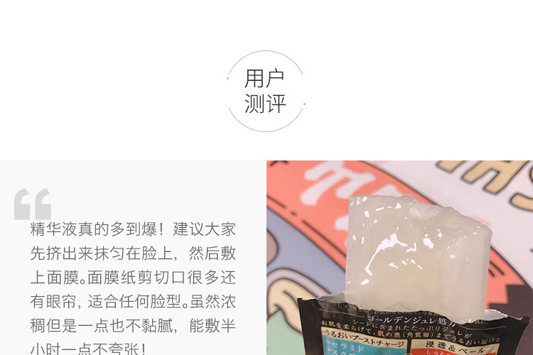 敷在脸上20-30分钟,残留脸部的精华液,请用手轻轻按摩直至吸收,建议一周使用1-2次