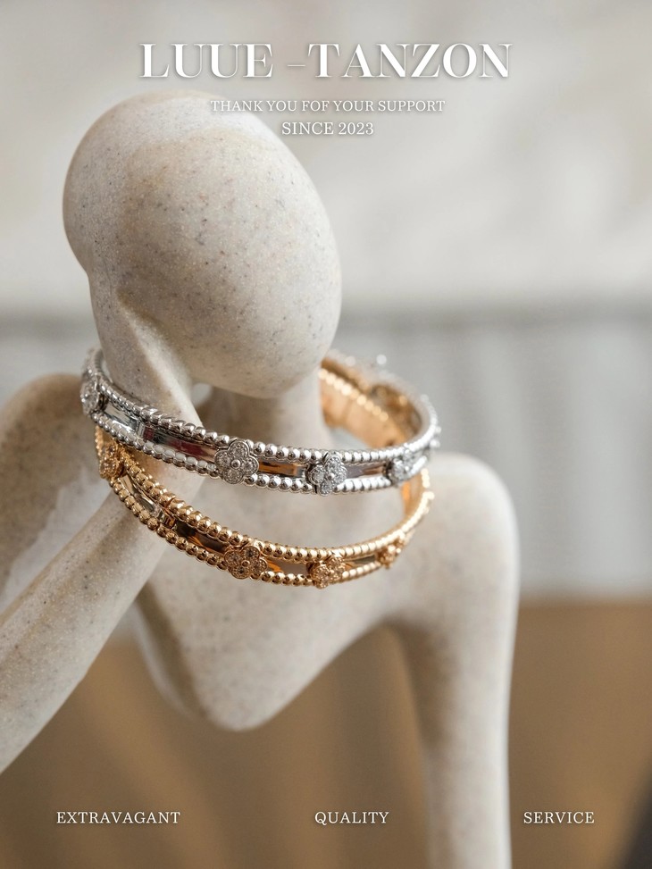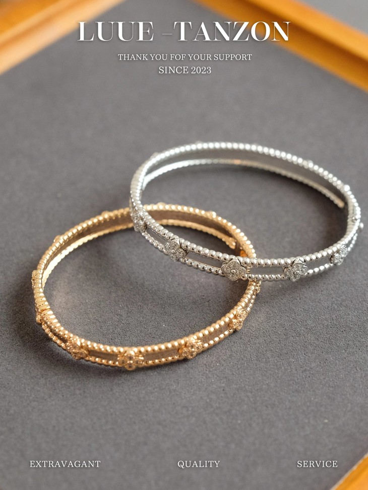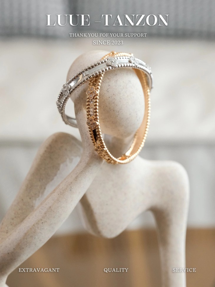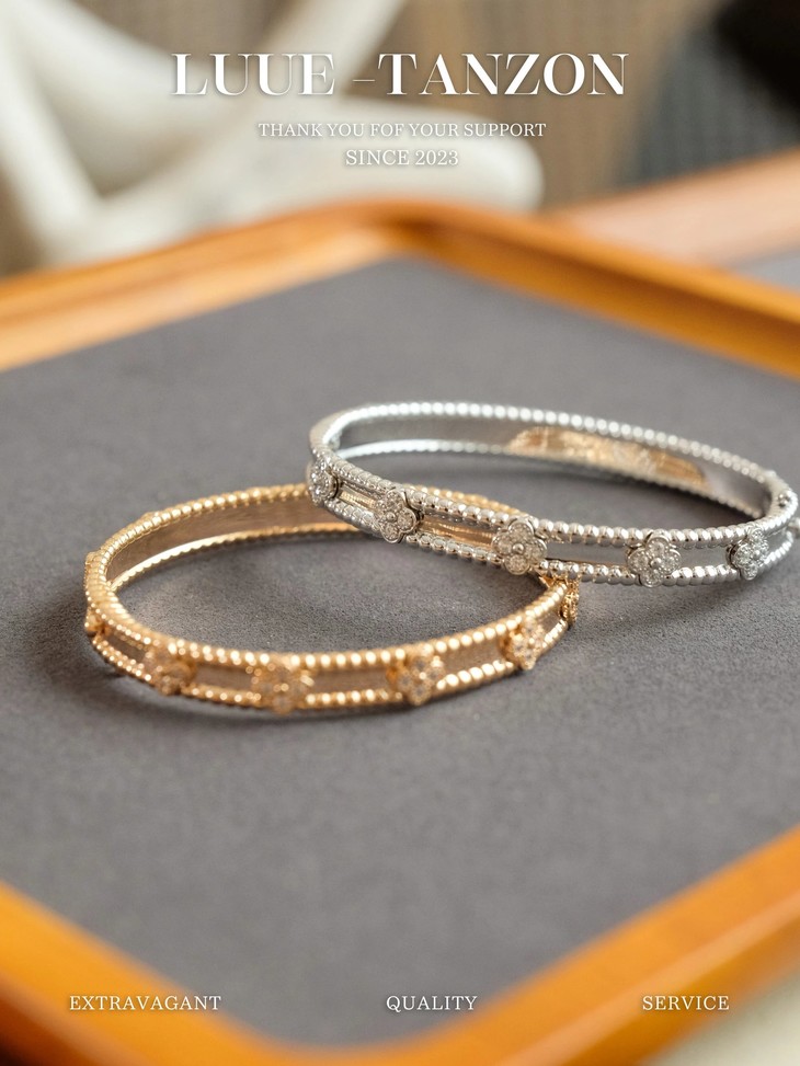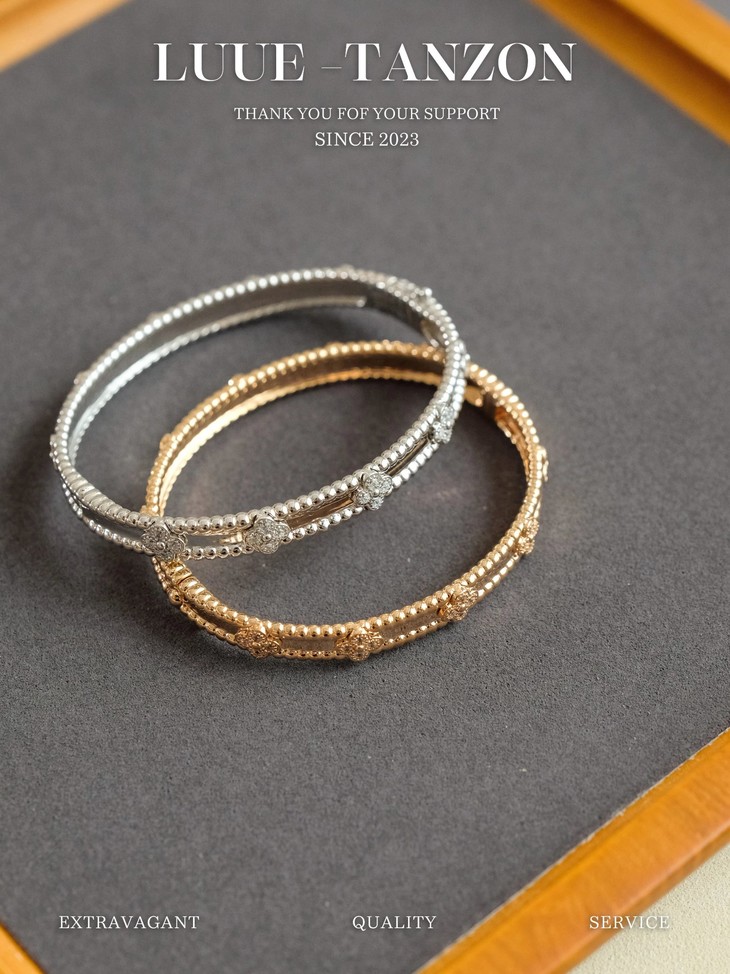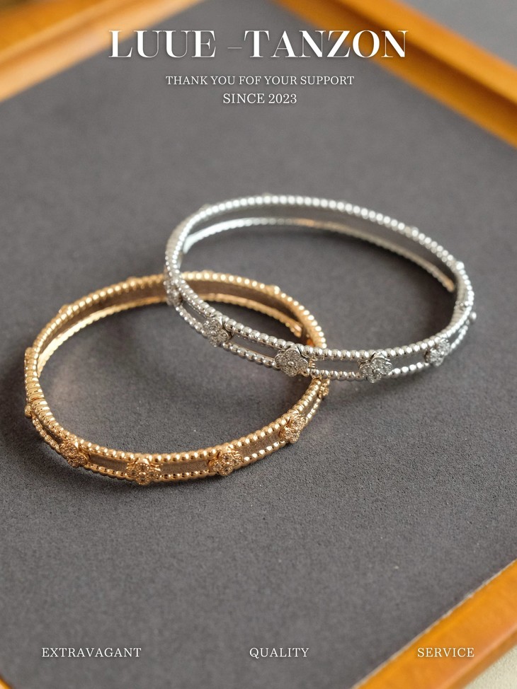 分件制作,四叶草花形单独镶嵌,戒指珠边打磨很考验师傅手工,粒粒打磨圆润并大小一致很费时。原版做到对标对版 ,珠珠边跟壁是四叶草的钻是纯手工镶嵌 并不是蜡镶嵌工艺,不易掉钻 ,珠珠上面每一个都有抛光打磨 过小吊机,这种工艺每一个珠珠都会光滑圆润 质感超级好 ,窄版万花筒更加秀气❗️更加适合叠戴 叠戴更显贵气 超级显白 超级美腻