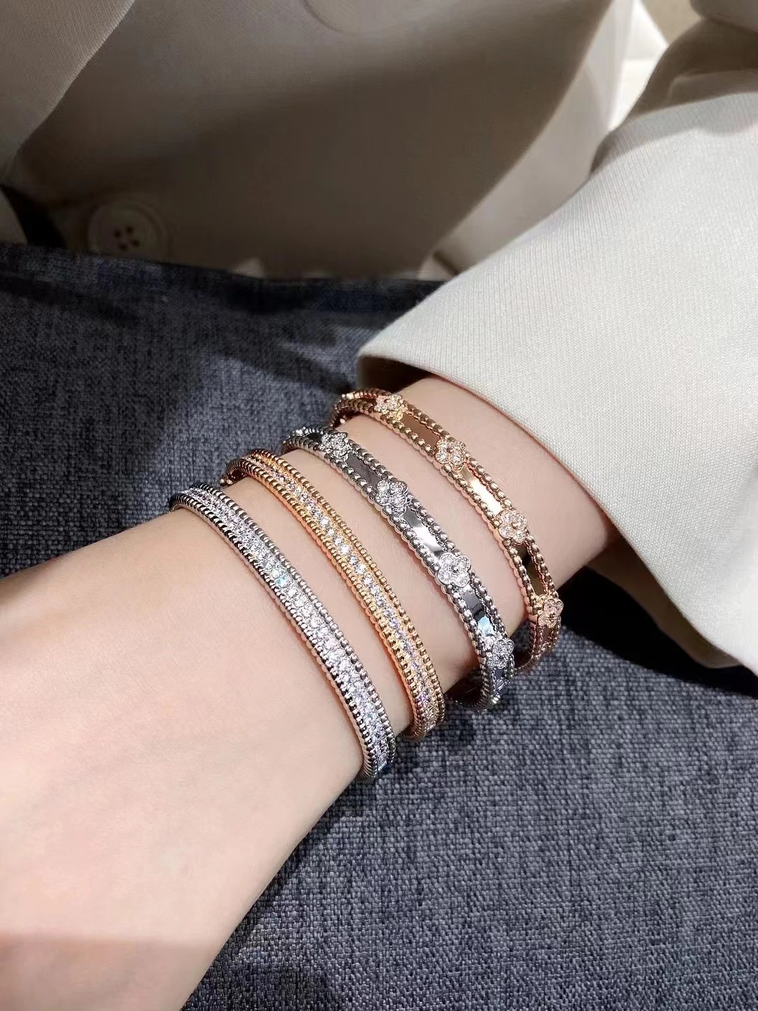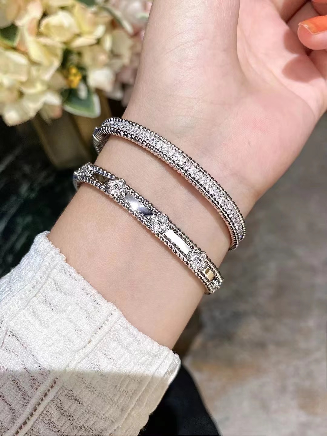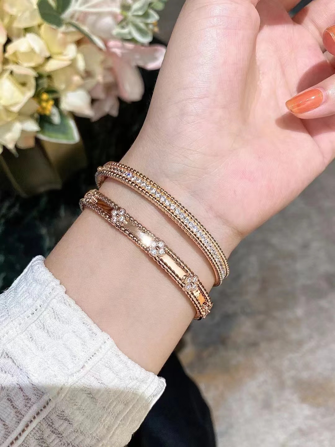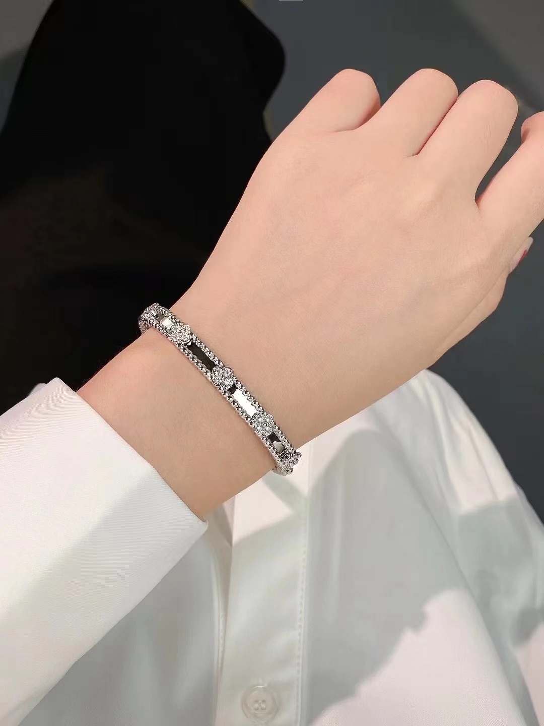 分件制作,四叶草花形单独镶嵌,戒指珠边打磨很考验师傅手工,粒粒打磨圆润并大小一致很费时。原版做到对标对版 ,珠珠边跟壁是四叶草的钻是纯手工镶嵌 并不是蜡镶嵌工艺,不易掉钻 ,珠珠上面每一个都有抛光打磨 过小吊机,这种工艺每一个珠珠都会光滑圆润 质感超级好 ,窄版万花筒更加秀气❗️更加适合叠戴 叠戴更显贵气 超级显白 超级美腻