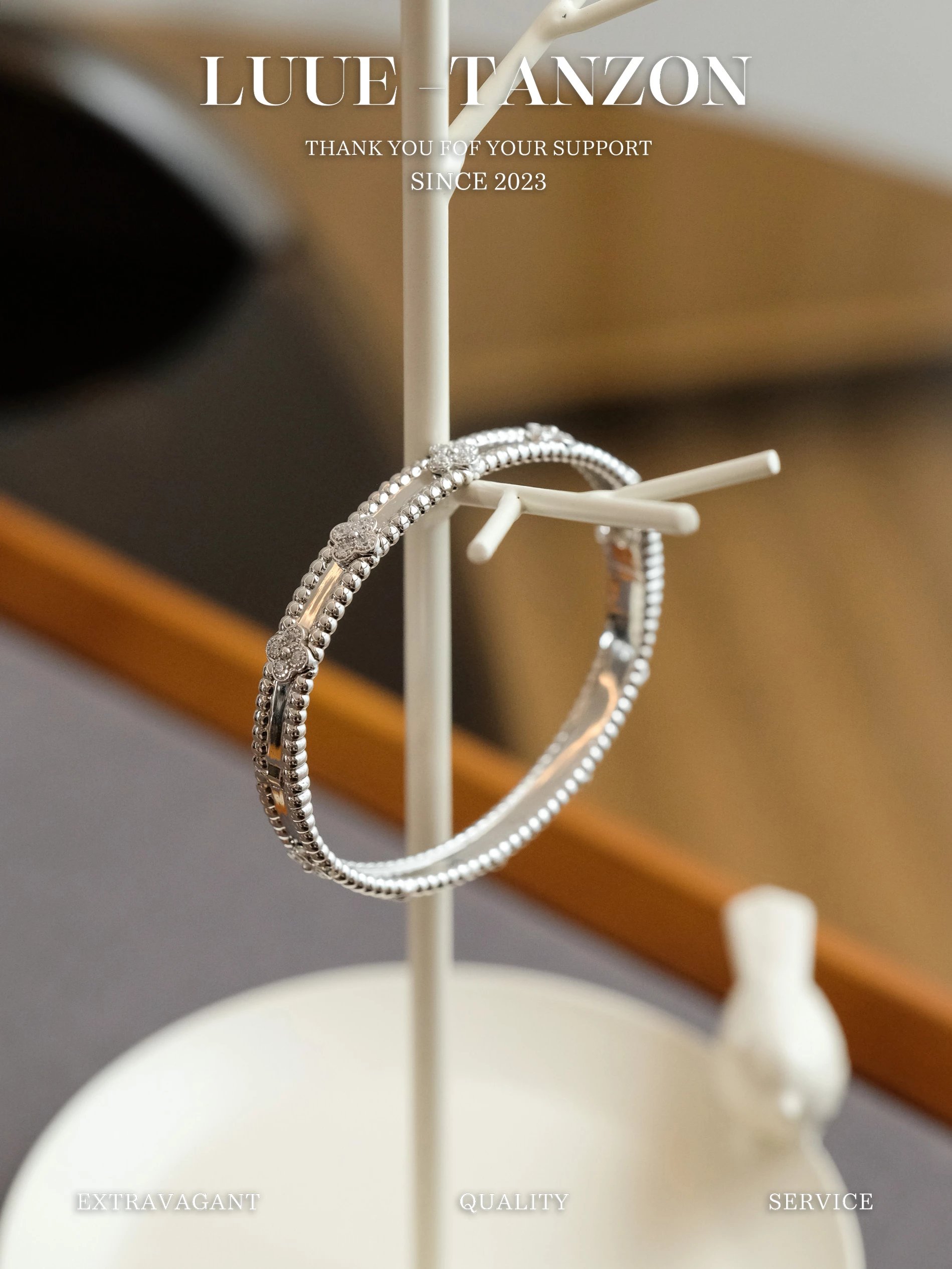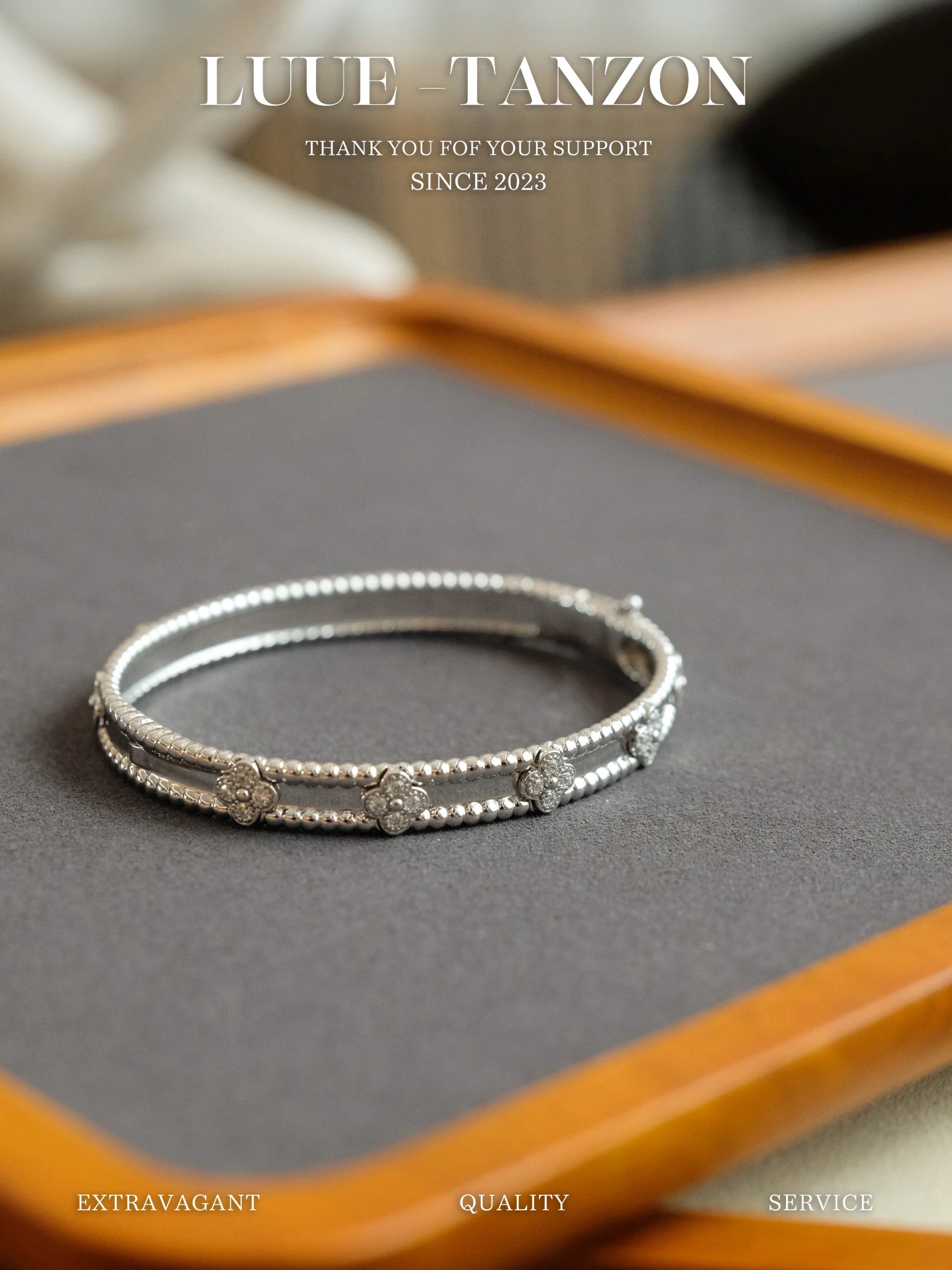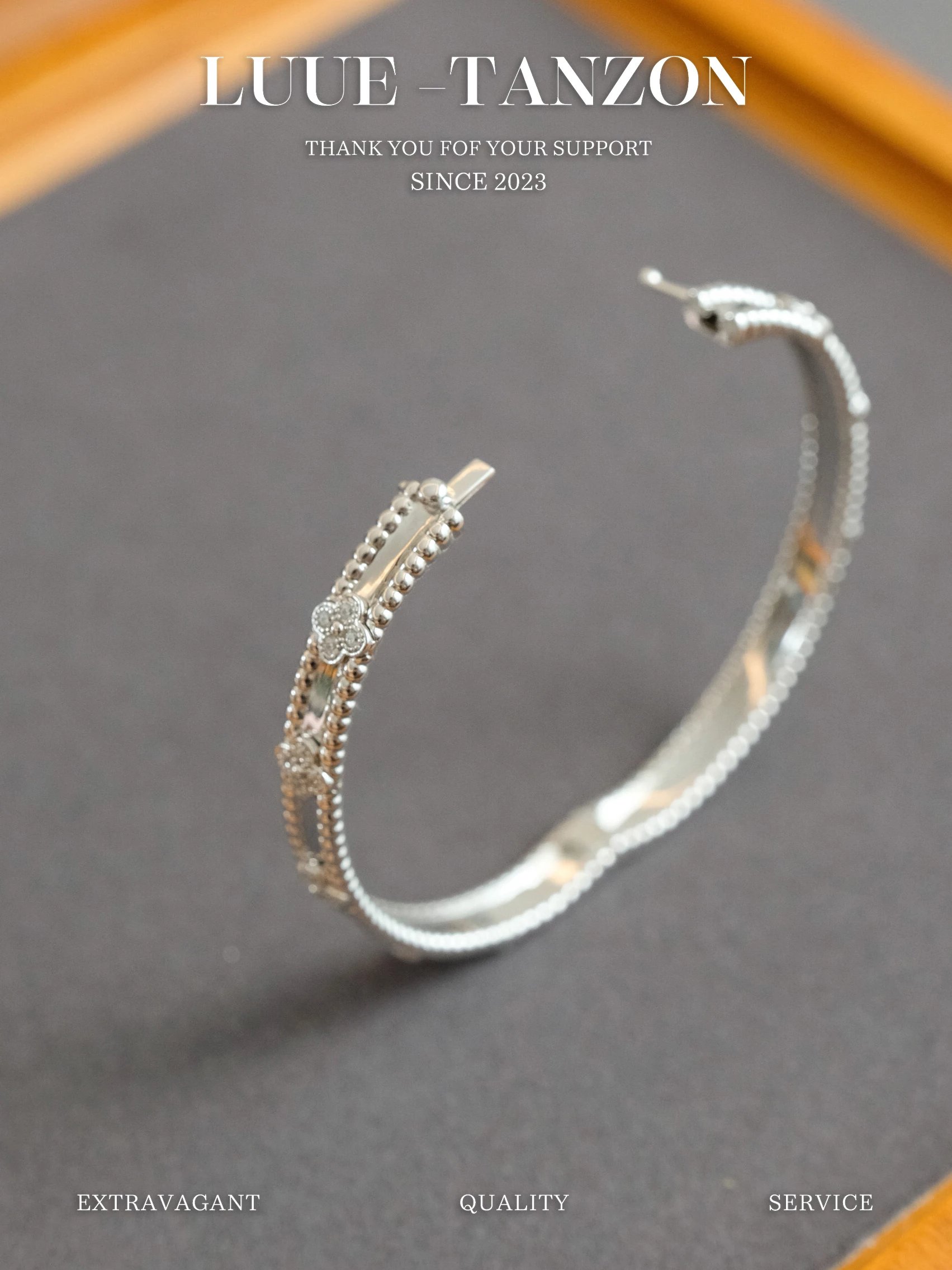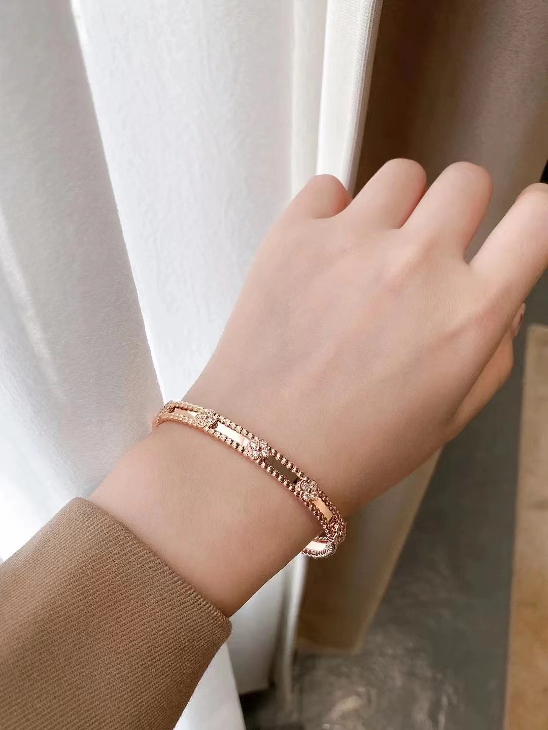 分件制作,四叶草花形单独镶嵌,戒指珠边打磨很考验师傅手工,粒粒打磨圆润并大小一致很费时。原版做到对标对版 ,珠珠边跟壁是四叶草的钻是纯手工镶嵌 并不是蜡镶嵌工艺,不易掉钻 ,珠珠上面每一个都有抛光打磨 过小吊机,这种工艺每一个珠珠都会光滑圆润 质感超级好 ,窄版万花筒更加秀气❗️更加适合叠戴 叠戴更显贵气 超级显白 超级美腻