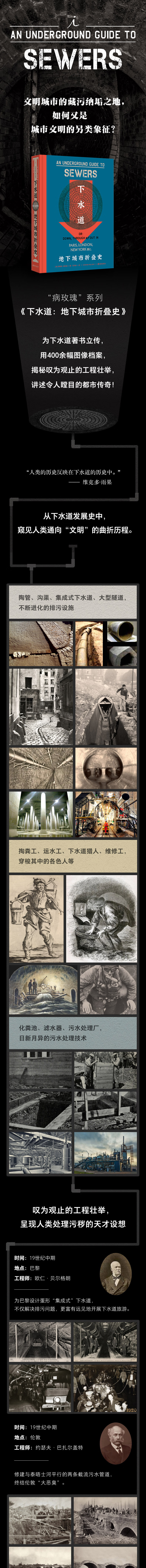 1. 雨果说:“人类的历史反映在下水道的历史中。”下水道见证了人由“野蛮”走向“文明”的历程——土坑、粪池、夜壶、冲水马桶,缓慢更新的排泄设施;掏粪工、运水工、夜香工、下水道猎人,参与排污的各色人等;鞣制皮革、制作火药、污水炼金,处理污水的独特智慧;陶管、明沟、暗渠、集成式下水道,不断进化的排污设施;化粪池、过滤网、活性污泥、厌氧消化池,日新月异的污水处理技术——《下水道》用400余幅历史照片、精彩绘画,以及各大博物馆珍藏的施工图纸、手绘地图等珍贵档案,再现了6000多年历史中,人类把自己打造成“文明人”的不懈努力。
