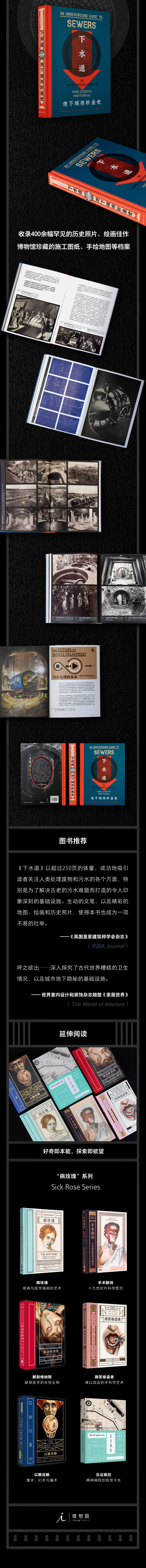 3. 图文并茂的地下城市穿越指南,目击文学和电影中的下水道原型。从《悲惨世界》中巴黎藏污纳垢的暗渠、狄更斯《小杜丽》中伦敦“索人性命”的下水道,到电影《第三人》中维也纳巨型地下管道内的精彩追逐、忍者神龟的住所,隐秘的下水道却涌动着艺术灵感。《下水道》用400余幅珍贵图像,带你钻入世界各大城市的地下,直面这些经典场面发生的历史背景、实际场景,掀开盘踞地下的城市面纱。