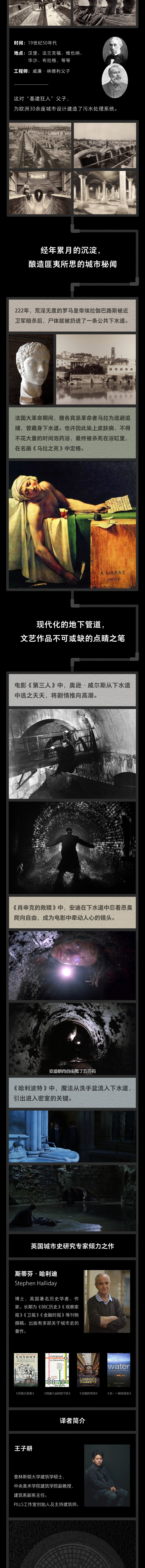 文明的城市地下,暗流涌动——下水道,滋生细菌,也孕育文明。我们生产的每一滴废水,最终都汇入这座地下城市。这里藏污纳垢、臭气弥漫。又是在同一座地下城市里,废水经过收集、输送、净化,最后以“人畜无害”的方式回归自然。下水道是城市的静脉,有时因疾风骤雨而外溢,有时因污物沉积而堵塞,考验着考验着市民的觉悟、工程师的智慧、管理者的胆识。下水道是人类文明的显微镜,从5000多年前巴比伦简单的深坑式厕所,到现代便捷卫生的抽水马桶;从古罗马的马克西姆下水道,到巴黎、伦敦、纽约、东京等巨型城市庞大的地下管网系统;从中世纪夜间出没的掏粪工,到21世纪大型高效的污水处理厂——作为不断进化的超级工程,下水道的发展几乎与人类文明进程同步。下水道也是一座城市的显微镜,见证了一个个历史事件、一次次技术革新、一段段城市秘闻。从雨果笔下暗无天日的贫民窟,到黑色电影中的罪恶天堂,经年累月的沉淀让下水道发酵出不可忽视的文化意涵,吸引着我们低头探索。本书结合400多幅与下水道有关的图像资料,囊括罕见的历史照片、精彩的绘画,以及各大博物馆珍藏的施工图纸、手绘地图等珍贵档案等,以高密度的视觉材料,呈现6000年来人类从污秽走向文明的曲折故事。在叹服工程师的天才智慧之余,亦能感受到地下建筑扑面而来结构之美。