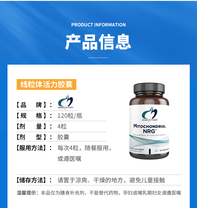 【效期至26年5月】线粒体活力胶囊 Designs for health Mitochondrial NRG 120粒/瓶