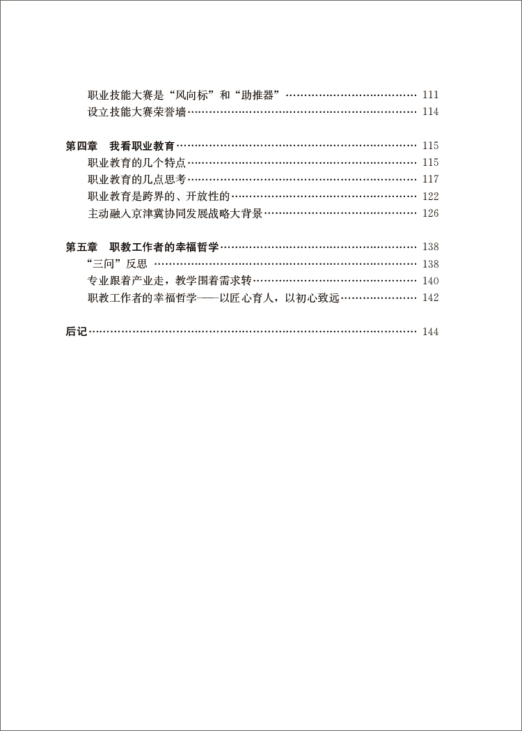 修 : 强 立 身 之 基 。 第 四 章 , 我 看 职 业 教 育 。第 五 章 , 职 教 工 作 者 的 幸 福 哲 学 。本 书 既