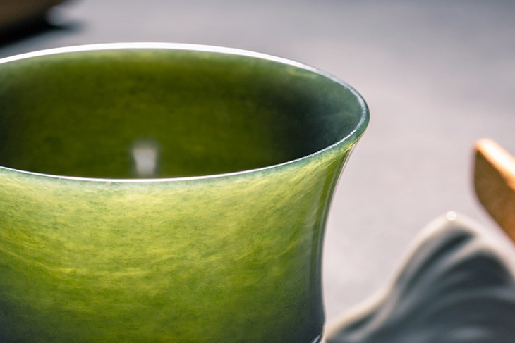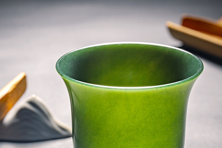 蛇纹石玉杯用料来自东北边境的一处高品质玉矿,不但硬度达到宝石级,还能碱化水质,清甜回甘。