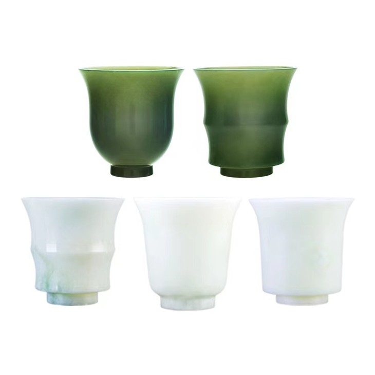 这次,我们为大家选的5款不同杯型的玉杯,分别有2款和田青玉杯、3款蛇纹石玉杯。