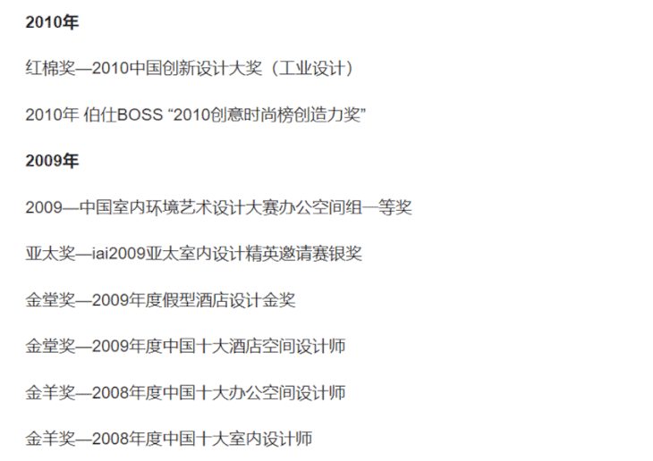 其作品多次获得大赛金奖,还被美国室内设计中文网评为“2012年中国十二位设计大师”之一,并刊于意大利《DOMUS》国际中文版、荷兰《FIAME》等多家知名杂志。