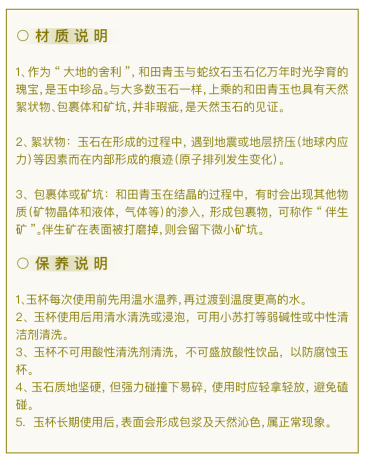 *玉杯经过瑞典微谱检测:材料安全等级可达食品级,比陶瓷、玻璃更安全,不含影响健康的重金属和放射线,可以放心使用。