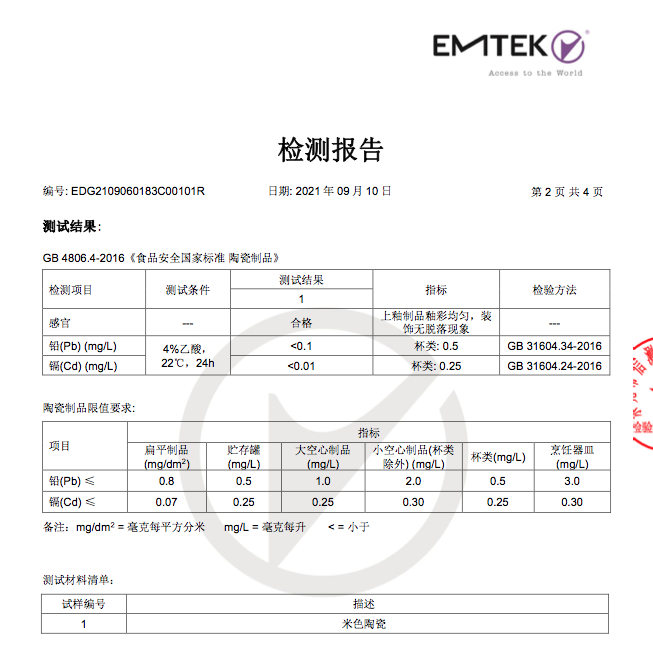 *注:由于没有单独的玉石测试的标准,玉杯按照陶瓷制品安全标准进行检测。