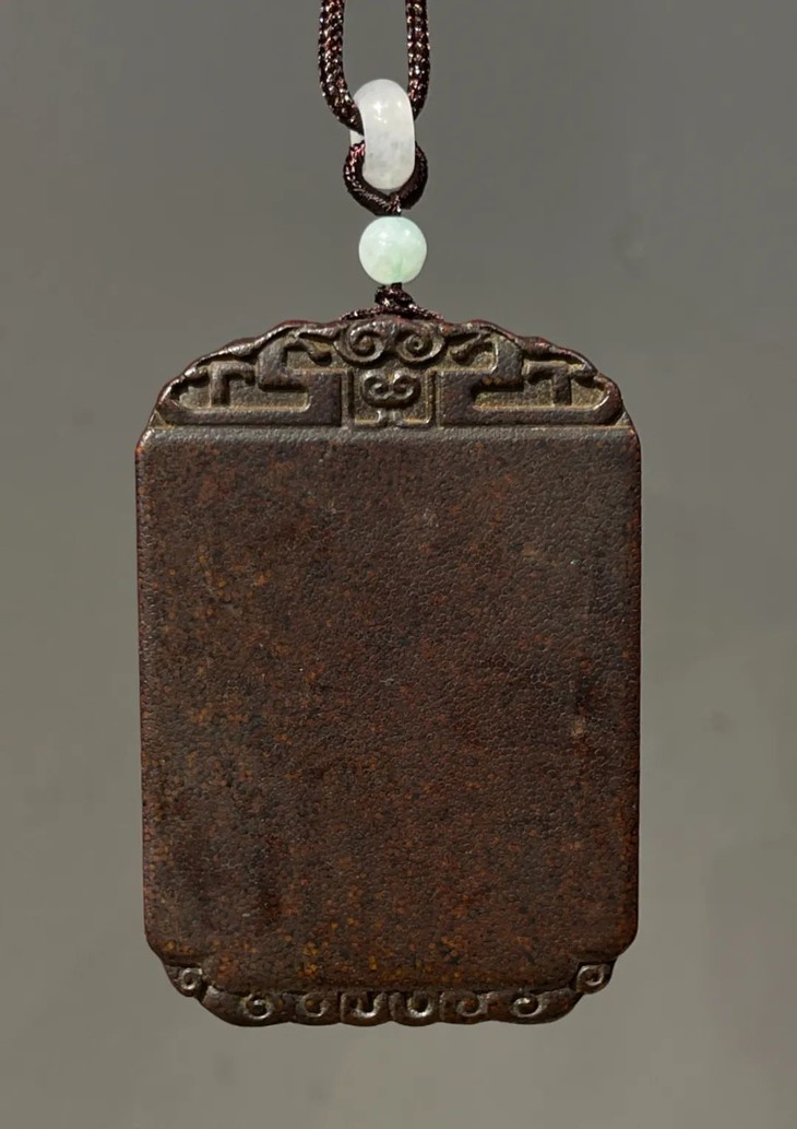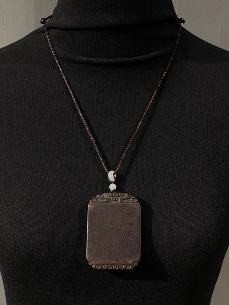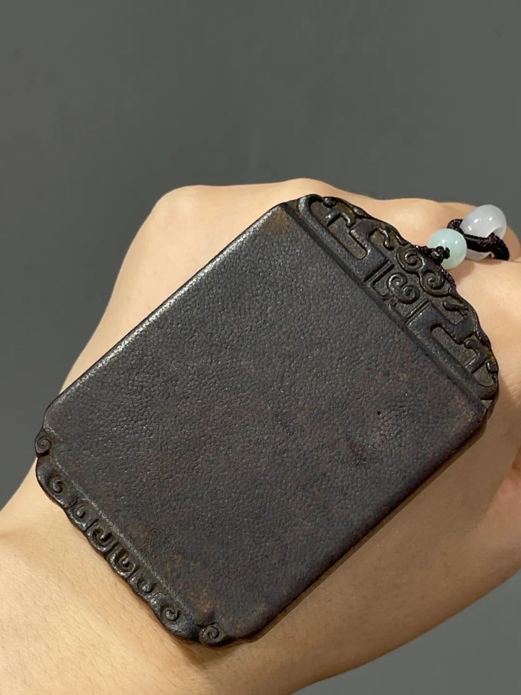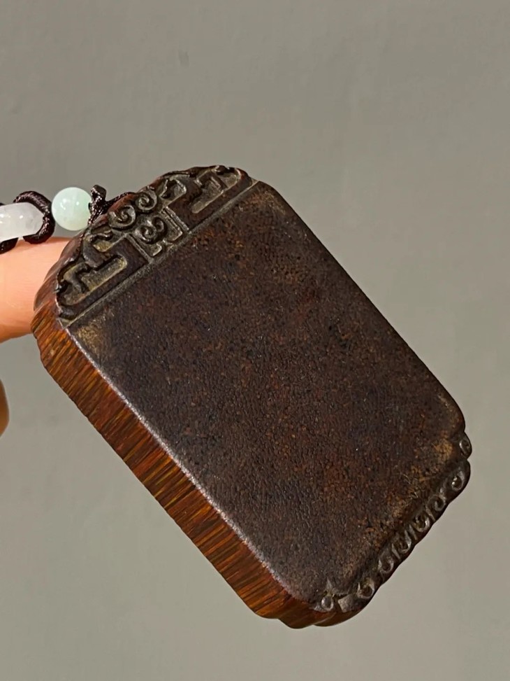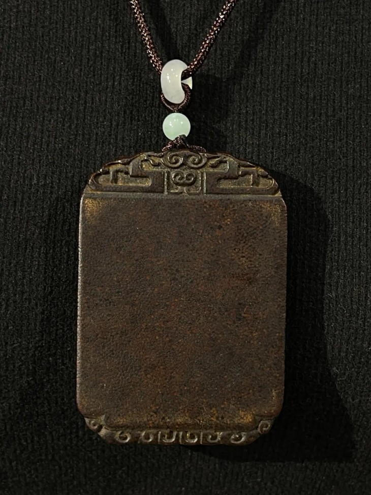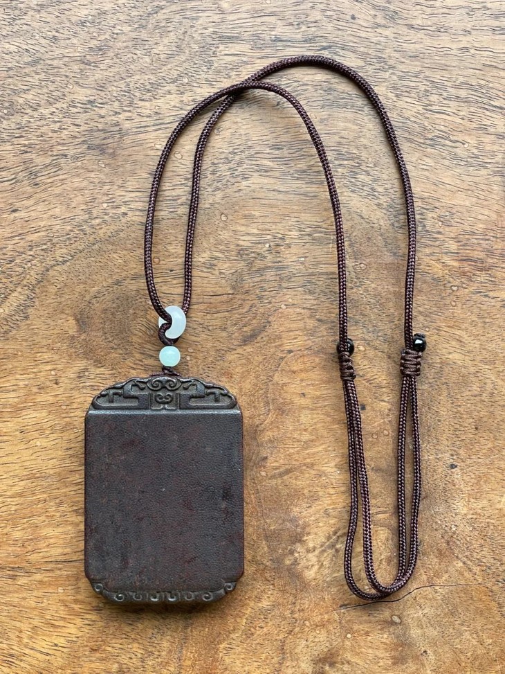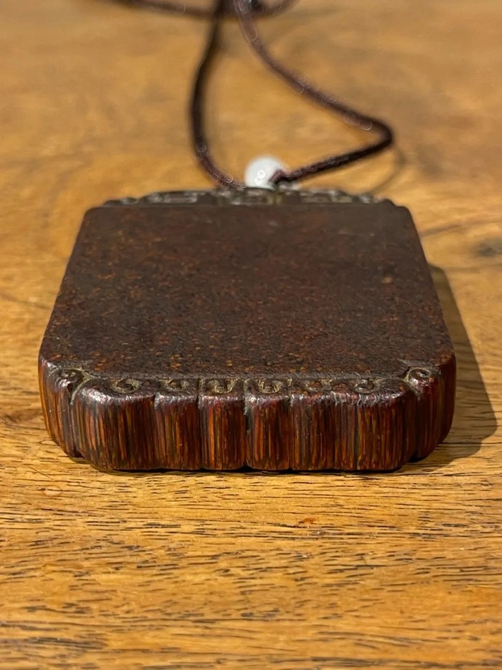 这是一件採用质地坚硬色泽深褐色的天然珍贵兽角雕琢而成的长方型双面雕螭龙框无事牌,这只质地佳雕工精美的吊坠牌,上方减地浮雕螭龙纹框饰,下方勾云纹,牌身光素无纹,典形无事牌风格,边框浮雕精致细腻,表面处理工艺精湛,侧切面细长纤维,正反切面为珍贵兽角横切面特有的鱼子纹清晰可见,天然材质深褐色自然斑驳,塔配可调长短绳结项链,表面包浆皮壳温润细腻,是一集高贵材质与雅致雕工于一身的宫廷式无事牌。