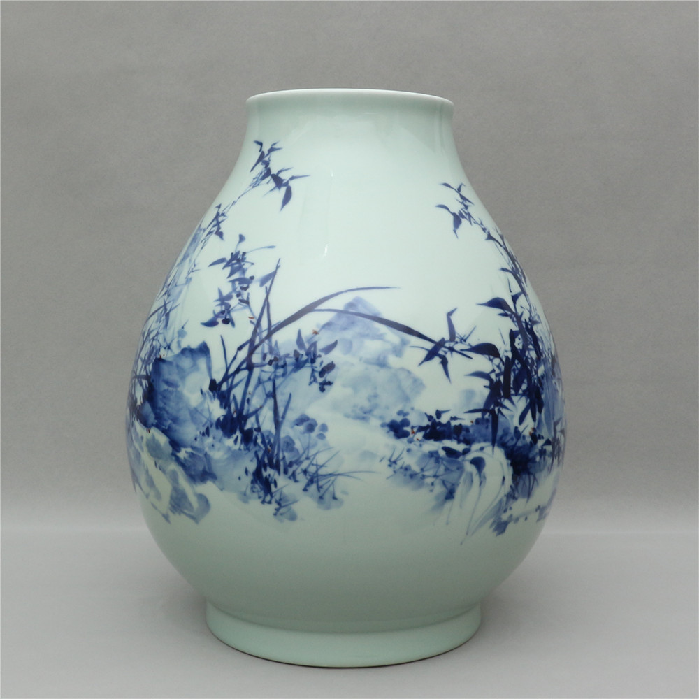 君子若兰,虚心似竹。此件器物通体豆青釉色,上以青花绘兰竹怪石,没骨写意,形神兼备。虽是瓷绘,但笔墨浓淡疏密尽呈于釉下,用笔潇洒脱俗,深得许麟庐花卉技法真传。