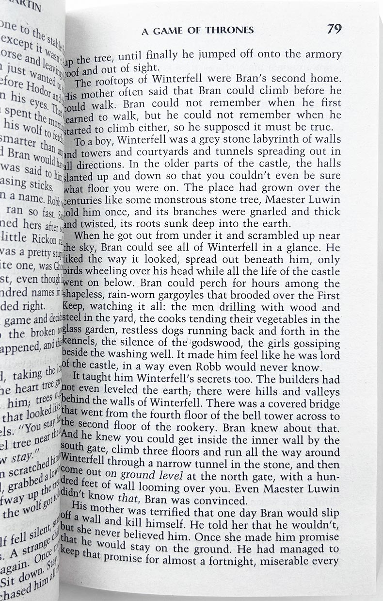 The morning had dawned clear and cold, with a crispness that hinted at the end of summer. They set forth at daybreak to see a man beheaded, twenty in all, and Bran rode among them, nervous with excitement. This was the first time he had been deemed old enough to go with his lord father and hisbrothers to see the king’s justice done. It was the ninth year of summer, and the seventh of Bran’s life. The man had been taken outside a small holdfast in the hills. Robb thought he was a wildling, his sword sworn to Mance Rayder, the King-beyond-the-Wall. It made Bran’s skin prickle to think of it. He remembered the hearth tales Old Nan told them. The wildlings were cruel men, she said, slavers and slayers and thieves. They consorted with giants and ghouls, stole girl children in the dead of night, and drank blood from polished horns. And their women lay with the Others in the Long Night to sire terrible half-human children. But the man they found bound hand and foot to the holdfast wall awaiting the king’s justice was old and scrawny, not much taller than Robb. He had lost both ears and a finger to frostbite, and he dressed all in black, the same as a brother of the Night’s Watch, except that his furs were ragged and greasy. The breath of man and horse mingled, steaming, in the cold morning air as his lord father had theman cut down from the wall and dragged before them. Robb and Jon sat tall and still on their horses, with Bran between them on his pony, trying to seem older than seven, trying to pretend that he’d seen all this before. A faint wind blew through the holdfast gate. Over their heads flapped the banner of the Starks of Winterfell: a grey direwolf racing across an ice-white field.