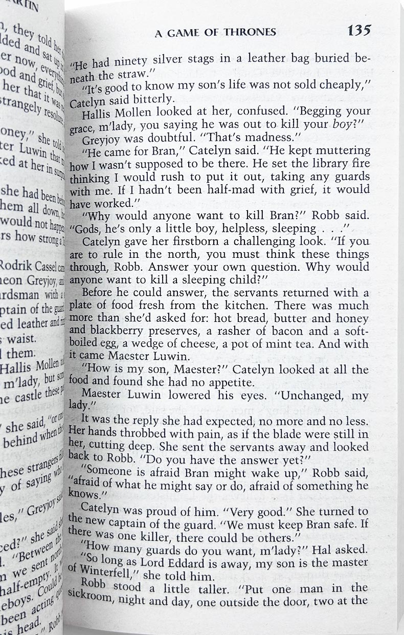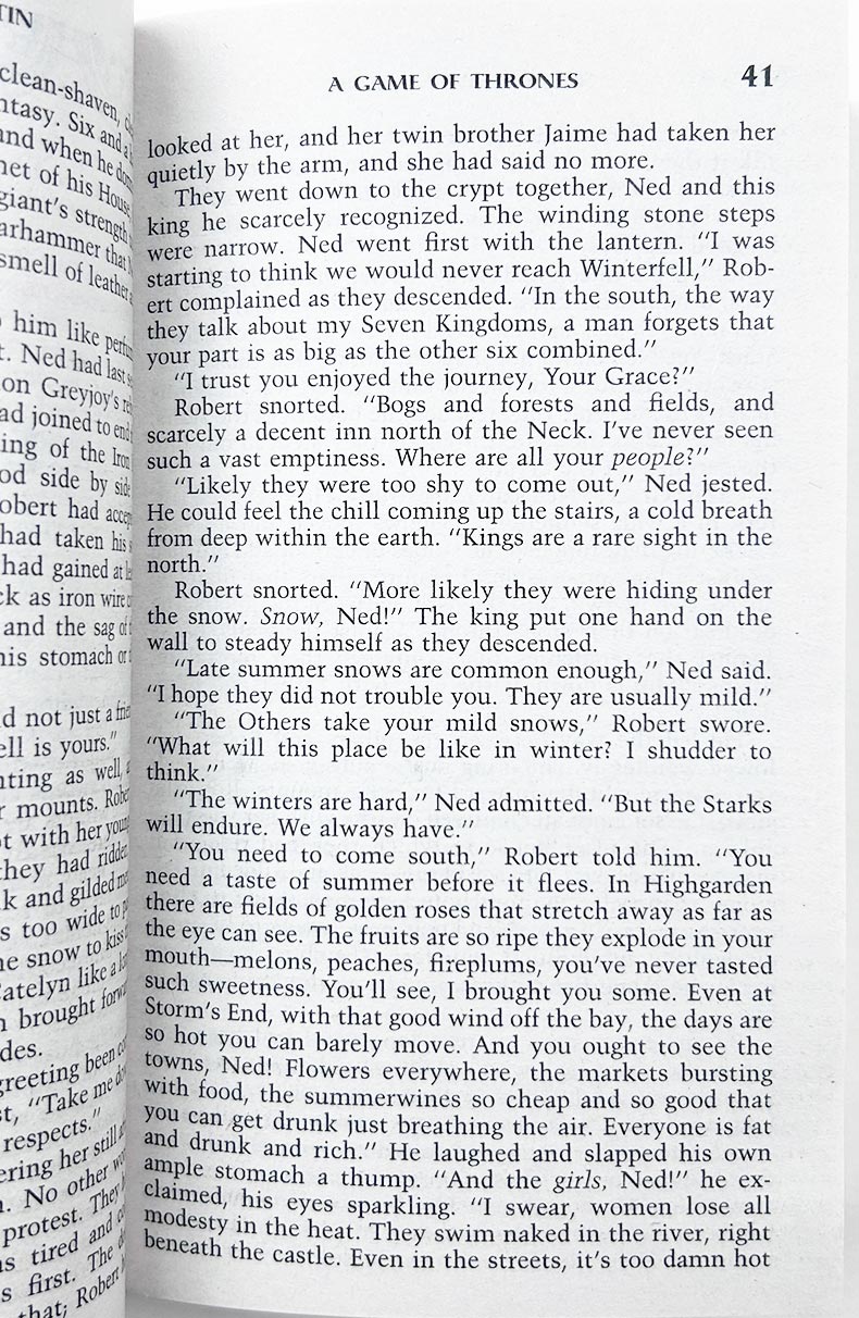 A Game of Thrones《权力的游戏》是A Song of Ice and Fire《冰与火之歌》的卷一,是美国HBO电视网热播电视剧Game of Thrones《权力的游戏》的原著小说。A Song of Ice and Fire《冰与火之歌》全书计划共七卷,截止2014年共完成出版了五卷,包括《权力的游戏》《列王的纷争》《冰雨的风暴》《群鸦的盛宴》和《魔龙的狂舞》。目前已被翻译成三十多种文字,全球销量已过千万,读者过亿。 推荐理由: 1.美国奇幻大师乔治·R·R·马丁奇幻史诗巨作,曾获雨果奖、星云奖及轨迹奖等多项大奖,美国“国宝”级幻想文学作品; 2. 采用POV视点人物写作手法,每章内容均以某特定视觉人物的角度出发,叙述一段内容,在下一章换为另一视觉人物,这更像是一出电影而非小说,让人身临其境沉迷不能自拔; 3. 小说在宫廷斗争、疆场厮杀、游历冒险等奇幻因素中融入了中世纪欧洲历史事件或传统神话因素,高度符合历史现实,读者很容易感受到这个“架空世界”的真实感; 4. 注重人物刻画和人性挖掘,并且削弱魔法元素,以现实手法描绘世界和人物,是奇幻文学作品中的“反传统先锋”,不仅好看,还具有新意; 5.整部小说中的人物多达数百个,但刻画十分细致,语言描写非常丰富,对写作有较大帮助; 6.阅读难度适中,有较多重复词汇,语言比较接近现代小说风格,仿古的文风只是点到而止,非英语专业的读者也容易读懂。 NOW THE ACCLAIMED HBO SERIES GAME OF THRONES From a master of contemporary fantasy comes the first novel of a landmark series unlike any you’ve ever read before. With A Game of Thrones, George R. R. Martin has launched a genuine masterpiece, bringing together the best the genre has to offer. Mystery, intrigue, romance, and adventure fill the pages of this magnificent saga, the first volume in an epic series sure to delight fantasy fans everywhere. A GAME OF THRONESA SONG OF ICE AND FIRE: BOOK ONELocus Award Winner: Best Fantasy NovelReview: “The major fantasy of the decade... compulsively readable.” — Denver Post “We have been invited to a grand feast and pageant: George R.R. Martin has unveiled for us an intensely realized, romantic but realistic world.” — Chicago Sun-Times “A Best Book of 1996: Martin makes a triumphant return to high fantasy... [with] superbly developed characters, accomplished prose, and sheer bloodymindedness.” — Publishers Weekly, starred review “A splendid saga.... Inventive and intricately plotted.” — BookPage “Magic... George R.R.Martin's first fantasy epic [is set] well above the norms of the genre.” — Locus “Such a splendid tale and such a fantasticorical! I read my eyes out and couldn't stop 'til I finished and it was dawn.” — Anne McCaffrey “The major fantasy of the decade . . . compulsively readable.” — The Denver Post “We have been invited to a grand feast and pageant: George R.R. Martin has unveiled for us an intensely realized, romantic but realistic world.” — Chicago Sun-Times “A Best Book of 1996: Martin makes a triumphant return to high fantasy... [with] superbly developed characters, accomplished prose, and sheer bloodymindedness.” — Publishers Weekly (starred review) “A splendid saga... Inventive and intricately plotted.” — Book Page “Magic... George R.R.Martin's first fantasy epic [is set] well above the norms of the genre.” — Locus “Such a splendid tale and such a fantasticorical! I read my eyes out and couldn't stop 'til I finished and it was dawn.” — Anne McCaffrey