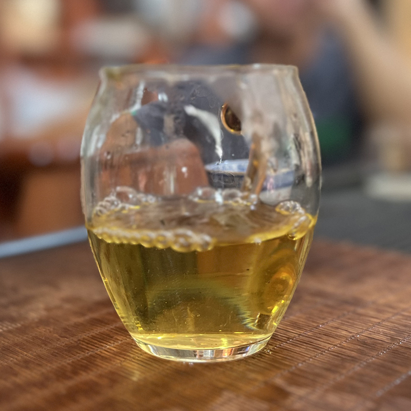 干茶遇沸水,溢出茶质,汤色黄灿清透